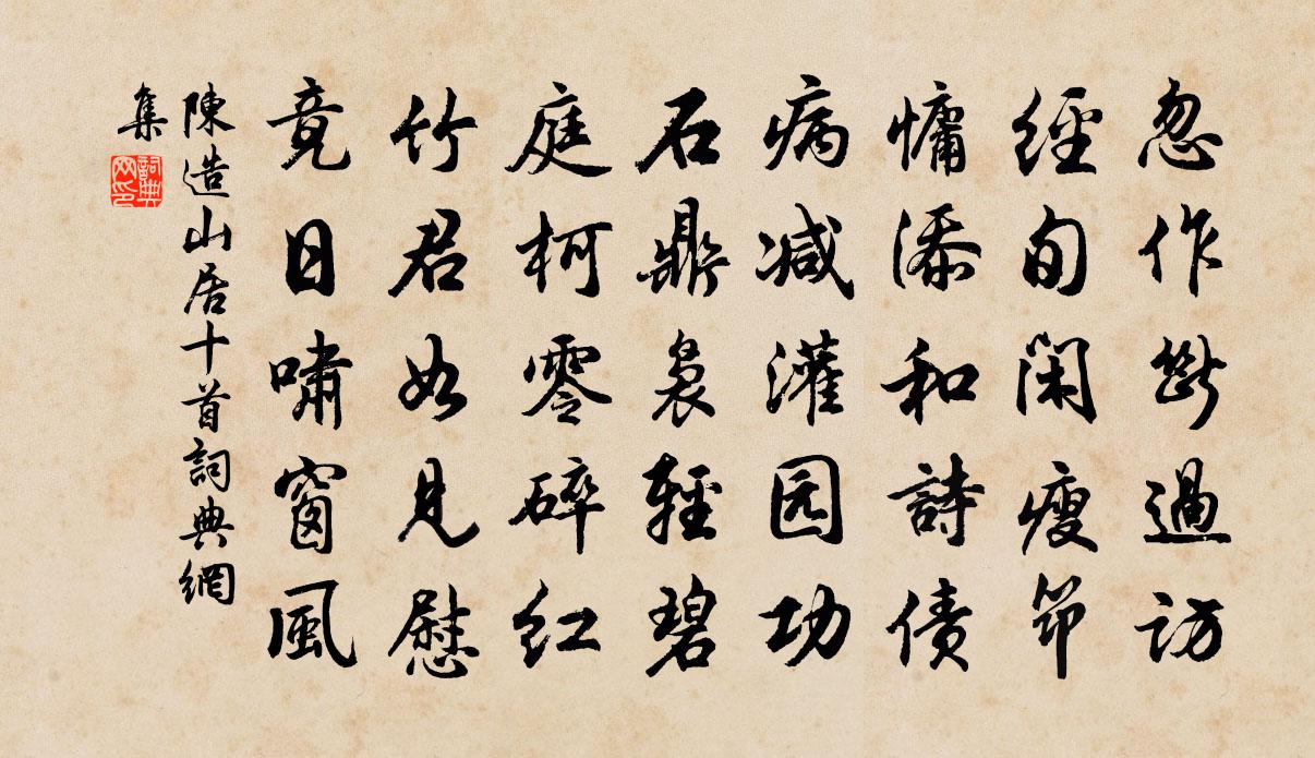 詩詞名句歷史字典書法欣賞書法字典國語詞典說文解字康熙字典古漢語字典標 題 作 者 詩 句 山居十首作者:陳造 朝代:宋代山居十首原文忽作斷過訪,經旬閒瘦筇。慵添和詩債,病減灌園功。石鼎裊輕碧,庭柯零碎紅。竹君如見慰,竟日嘯窗風。詩詞問答問:山居十首的作者是誰?答:陳造問:山居十首寫於哪個朝代?答:宋代陳造山居十首書法欣賞山居十首書法作品詩詞推薦好事近·七月十三日夜登萬花川谷望月作楊萬里〔宋代〕月未到誠齋,先到萬花川谷。不是誠齋無月,隔一林修竹。如今才是十三夜,月色已如玉。未是秋光奇絕,看十五落梅風馬致遠〔元代〕夕陽下,酒旆閒。兩三航未曾著岸。落花水香茅舍晚,斷橋頭賣魚人散。深院韓偓〔唐代〕鵝兒唼啑梔黃觜,鳳子輕盈膩粉腰。深院下簾人晝寢,紅薔薇架碧芭蕉。讀後漢書王安石〔宋代〕錮黨紛紛果是非,當時高士見精微。可憐竇武陳蕃輩,欲與天爭漢鼎歸。水仙子·瓦匠陳鐸〔明代〕東家壁土恰塗交,西舍廳堂初瓦了,南鄰屋宇重修造。弄泥漿直到老,數十年用盡勤勞。金張第游麇鹿,王謝宅長子規劉延世〔宋代〕一聲迸裂青山竹,半夜沾殘病客衣。還道離於天上去,不知何苦只思歸。師文莫君以詩從僕求字顧非所長聊作一篇姑慰毛滂〔宋代〕廣文無氈風撼頰,凍坐慈恩書柿葉。乞米珍題矯龍鳳,望粥嬌兒鬧鵝鴨。不須歐家管城子,鏤象雕犀作袍帢。娥眉壽陽曲·雲籠月馬致遠〔元代〕雲籠月,風弄鐵,兩般兒助人淒切。剔銀燈欲將心事寫,長吁氣一聲吹滅。秋思陸游〔宋代〕烈日炎天欲不禁,喜逢秋色到園林。雲陰映日初蕭瑟,露氣侵簾已峭深。衰發凋零隨槁葉,苦吟淒斷雜疏碪。鴈來題江貫道山水十絕劉克莊〔宋代〕半夜黃天盪,樓船雪浪中。當年草檄客,今日負樵翁。一蓮趙崇嶓〔宋代〕一蓮瓶中枯,一蓮池中子。結子心雖苦,而猶勝枯死。賞心一日期,詎非得生理。君看千歲樗,荒郊永淪棄。送王炎弼赴山陽守以兵衛森畫戟宴寢凝清香為曾協〔宋代〕盛世須材傑,高名動聖明。一麾淮海去,青旆擁千兵。贈杓直白居易〔唐代〕世路重祿位,棲棲者孔宣。人情愛年壽,夭死者顏淵。二人如何人,不奈命與天。我今信多幸,撫己愧前賢。已年思山居一十首清明後憶山中李德裕〔唐代〕遙思寒食後,野老林下醉。月照一山明,風吹百花氣。飛泉與萬籟,仿佛疑簫吹。不待曙華分,已應喧鳥至。寄答潘文叔並屬恭叔五首趙蕃〔宋代〕君家舍人公,世謂王楊作。誰知所傳授,白首終林壑。至今有源流,涇渭分清濁。豈比世上兒,風姿矜濯濯。又和晦翁棹歌方岳〔宋代〕乘興而來亦偶然,誰將陰壑作晴川。筍輿更問星村路,去看溪南一線天。至啟伏蒙僕射相公獨垂青眼忽枉朱輪仍貽郢客李至〔宋代〕蓬丘官況復何如,養拙資吟久病餘。印簏罕開無案牘,閤門常鎖有圖書。山中舊隱閒多憶,切上浮生老列疏。何幸寄劉孝叔蘇軾〔宋代〕君王有意誅驕虜,椎破銅山鑄銅虎。聯翩三十七將軍,走馬西來各開府。南山伐木作車軸,東海取鼉漫戰鼓。汗流餞唐永昌薛稷〔唐代〕河洛風煙壯市朝,送君飛鳧去漸遙。更思明年桃李月,花紅柳綠宴浮橋。自歸宗入靈溪觀孔武仲〔宋代〕紫霄峰下有禪林,瓦結青瑤地布金。聞道靈溪才咫尺,攜筇不覺後山深。名句推薦燕雀安知鴻鵠之志。司馬遷《史記·陳涉世家》 鷫鸘換美酒,舞衣罷雕龍。李白《怨歌行》 看書須放開眼孔,做人要立定腳跟王永彬《圍爐夜話·第四二則》 荊吳相接水為鄉,君去春江正淼茫。孟浩然《送杜十四之江南 / 送杜晃進士之東吳》 不知何處火,來就客心然。沈佺期《寒食》 客路相逢難,為樂常不足。蘇軾《送頓起》 面譽者不忠,飾貌者不情戴聖《大戴禮記·文王官人第七十二》 酌酒與君君自寬,人情翻覆似波瀾。王維《酌酒與裴迪》 入門休問榮枯事,且看容顏便得知。佚名《增廣賢文·上集》 順風而呼,聲非加疾也,而聞者彰。荀子《勸學》