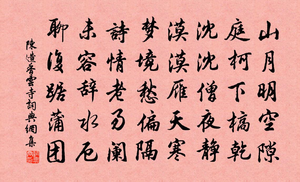 詩詞名句歷史字典書法欣賞書法字典國語詞典說文解字康熙字典古漢語字典標 題 作 者 詩 句 香雲寺作者:陳造 朝代:宋代香雲寺原文山月明空隙,庭柯下槁乾。沈沈僧夜靜,漠漠雁天寒。夢境愁偏隔,詩情老易闌。未容辭水厄,聊復踞蒲1~1團。詩詞問答問:香雲寺的作者是誰?答:陳造問:香雲寺寫於哪個朝代?答:宋代陳造香雲寺書法欣賞香雲寺書法作品詩詞推薦次韻寄齋贈竹居張鎡〔宋代〕振俗還風雅,乾坤覓句中。夔皋渠合遇,郊島我甘同。浩蕩投鷗不,清和翻燕風。相投兩無語,聲遠莫摩空。漢宮春(乙未正月和李漢老韻,簡嚴子文)丘崈〔宋代〕橫笛吹梅,記南樓夜月,疏蕊纖枝。香塵軟紅自暖,不怕寒欺。人歸夢悄,悵憑闌、密約深期。身漸老,風流縱在奉陪舅丈祠書彥平主簿兄游慧聚終日小飲上方仲並〔宋代〕迎宵山吐月,不受寸雲吞。看影篩林杪,移尊藉石根。參差明梵剎,一二數煙村。高處僧眠示,攜筇試打門。桃源憶故人 勸長安三壇李法師馬鈺〔元代〕李公知觀聽予勸。只恁未為長便。悟取水雲清淺。玄妙心通顯。木人手段非凡箭。便把三乘救援。射透箇中宮殿。諸公載酒賀余休致水村農卿有詩次韻劉克莊〔宋代〕高屋從來有鬼窺,鐵門關枉費心機。逃堯欲去未忍去,舍魯不歸何處歸。款段馬知如狗大,堂廚羊不似蠔肥。賜金無夢令 繼重陽韻馬鈺〔元代〕人我兩無分別。個內須教瑩徹。營養本來如,漸覺真歡真悅。親說。親說。得見洞天明月。寓北山小閣因事偶作釋了惠〔宋代〕老去將貧買得閒,十層梯下是人間。忽因送客聞新事,又囑山童緊著關。題永陽文獻錄趙汝騰〔宋代〕冢中夷跖同枯骨,身後逢乾享令名。讀遍永陽文獻錄,可憐齰舌老司老。永遇樂(初夏獨坐西山釣台新亭)李彌遜〔宋代〕曲徑通幽,小亭依翠,春事才過。看筍成竿,等花著果,永晝供閒坐。蒼蒼晚色,臨淵小立,引首暮鷗飛墮。悄無石排山渡行蔡肇〔宋代〕中泠之西古石排,狂波悍浪何能摧。顛崖骨立不受土,草木堅瘦知誰栽。長蛇怒結花磥磈,蒼隼飢嘯寒氈毸。舟師第三歲日詠春風,憑楊員外寄長安柳元稹〔唐代〕三日春風已有情,拂人頭面稍憐輕。殷勤為報長安柳,莫惜枝條動軟聲。金陵五題·並序劉禹錫〔唐代〕余少為江南客,而未游秣陵,嘗有遺恨。後為歷陽守,跂而望之。適有客以《金陵五題》相示,逌爾生思,欻然有中秋月鄧忠臣〔宋代〕寂寥無聲月亭午,蟾蜍通津墮清露。明星爛爛今何稀,美人熒熒隔煙霧。次韻學士重陽雪中見招不赴前後十六首洪皓〔宋代〕萸房覓得惜其陳,擬學宗王問鬼神。不放黃花資獻壽,故飛白雪惱留賓。一身抱病蹣跚苦,萬里思親況味辛。正是二十二弟自常州寄翦刀及筆來作長句晁說之〔宋代〕弟書毗陵來,有同股分刃之刀,綠管白毫之筆。刀是寶公錫上之所懸,筆亦江淹夢中之所得。江南刀筆有如此,不子虛賦司馬相如〔兩漢〕楚使子虛使於齊,王悉發車騎,與使者出田。田罷,子虛過奼烏有先生,亡是公在焉。坐定,烏有先生問曰:“今春暮王邁〔宋代〕雲頭紅上三竿日,煙際青來數點峰。桑椹熟時鳩喚雨,麥花黃後燕翻風。楊主簿日本扇蘇轍〔宋代〕扇從日本來,風非日本風,風非扇中出,問風本何從。風亦不自知,當復問太空。空若是風穴,既自與物同。同物貧作負恩人為何宏甫作戴復古〔宋代〕九陌塵中事,三生石上身。狂為好詩客,貧作負恩人。十載江村別,扁舟淦水濱。音書久不至,得夢往來頻。和書觀妙庵秦觀〔宋代〕龍瑞宮中種玉人,誅茅結室傍秋雲。自言洞裡山川別,此處千分未一分。名句推薦瘦葉幾經雪,淡花應少春。於武陵《贈賣松人》 可堪孤館閉春寒,杜鵑聲里斜陽暮。秦觀《踏莎行·郴州旅舍》 絡緯秋啼金井闌,微霜淒淒簟色寒。李白《長相思·其一》 與人不求備,檢身若不及佚名《尚書·商書·伊訓》 萬條千縷綠相迎。舞煙眠雨過清明。晏幾道《浣溪沙·二月和風到碧城》 偶應非熊兆,尊為帝者師。劉基《題太公釣渭圖》 數里黃沙行客路,不堪回首思秦原。周朴《春日秦國懷古》 浮雲不共此山齊,山靄蒼蒼望轉迷韓翃《宿石邑山中》 龍魚失水難為用,龜玉蒙塵未見珍牟融《春日山亭》 越鳥巢乾後,歸飛體更輕。李商隱《晚晴》