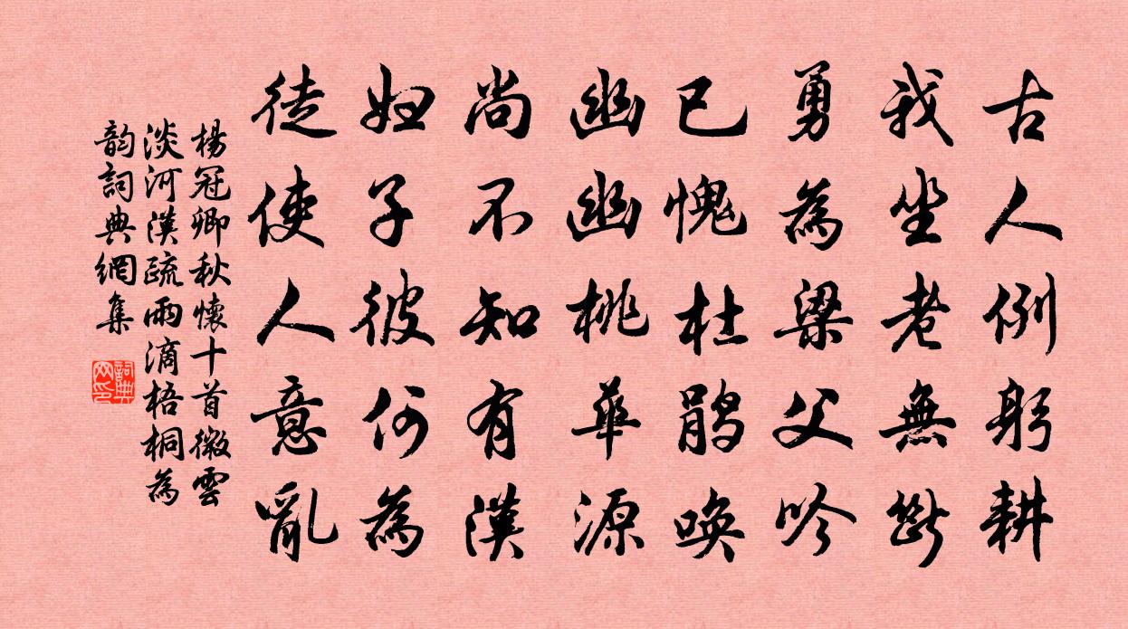 詩詞名句歷史字典書法欣賞書法字典國語詞典說文解字康熙字典古漢語字典標 題 作 者 詩 句 秋懷十首微雲淡河漢疏雨滴梧桐為韻作者:楊冠卿 朝代:宋代原文古人例躬耕,我坐老無斷。勇為梁父吟,已愧杜鵑喚。幽幽桃華源,尚不知有漢。婦子彼何為,徒使人意亂。詩詞問答問:《秋懷十首微雲淡河漢疏雨滴梧桐為韻》的作者是誰?答:楊冠卿問:該詩寫於哪個朝代?答:宋代書法欣賞秋懷十首微雲淡河漢疏雨滴梧桐為韻書法作品詩詞推薦南歌子辛棄疾〔宋代〕世事從頭減,秋懷徹底清。夜深猶道枕邊聲。試問清溪底事、不能平。月到愁邊白,雞先遠處鳴。是中無有利和名泛溪朱慶餘〔唐代〕曲渚回花舫,生衣臥向風。鳥飛溪色里,人語棹聲中。余卉才分影,新蒲自作叢。前灣更幽絕,雖淺去猶通。永嘉經謝公石門山作郭密之〔唐代〕綿境經耳目,未嘗曠躋登。一窺石門險,再滌心神懵。洞壑閟金澗,欹崖盤石楞。陰潭下冪冪,秀嶺上層層。千丈讀史陳宓〔宋代〕子房真男子,五世相韓國。父死未及仕,不受暴秦辱。家僮三百人,求客不顧族。持說說項梁,立成宗社復。梁亡寄趙德莊以過去生中作弟兄為韻七首韓元吉〔宋代〕築城始議態,寓兵復言攻。二年大江南,兵弋在目中。憂時亦千慮,惟子與我同。詣闕請長纓,終軍本兒童。蕭何徐鈞〔宋代〕相國人夸佐沛公,收圖運餉守關中。不知用蜀為根本,此是興王第一功。減字木蘭花(內子生日)周紫芝〔宋代〕蓬萊三島。上有青青千歲草。玉佩煙鬟。來作人間一笑歡。 * 行酒。萼綠華歌清韻裊。玉秀蘭芳。醉舞東風彩袖尋山許棠〔唐代〕躡履復支筇,深山草木中。隔溪遙避虎,當塢忽聞鍾。落葉多相似,幽禽半不同。群猱呼卻散,如此異林翁。溪上望居人有感馮時行〔宋代〕溪上居人三兩家,竹籬斜插倚蒹葭。清流日暖魚飛浪,靜渚輕煙鳥印沙。膾落霜刀分采縷,酒傾玉碗泛瓊花。因思聞鹿鳴互謔嚴震〔唐代〕釜戴山中鹿又鳴,——中表此際多應到表兄。 ——嚴震表兄不是嚴家子,合是三兄與四兄。 ——中表席上賦梅李處權〔宋代〕桃李何須續後開,芝蘭勝韻許相陪。先春莫道無深意,調鼎方知有大才。南國正宜溪上路,故園長夢竹間台。騷人次喻景山韻陳宓〔宋代〕連雨昏蒙隱月痕,月邊新蕊故應存。春風日夜來無限,欺得陶家半掩門。不寐二首陳造〔宋代〕改遍年來所著書,依然幽夢隔華胥。寒更何與衰翁事,數到琤摐殺點餘。苦晝短李賀〔唐代〕飛光飛光,勸爾一杯酒。吾不識青天高,黃地厚。唯見月寒日暖,來煎人壽。食熊則肥,食蛙則瘦。神君何在,太又五言蘇頌〔宋代〕道卷門常靜,心間眼倦開。忽聞賓榻掃,為喜使車來。世事浮雲過,時光暮雪催。放懷何所係,卒歲自游哉。殘句:可憐世上金和寳范成大〔宋代〕可憐世上金和寳,借爾閑看七十年。挽吳宜徽鄭獬〔宋代〕大策三千字,朝廷耳目醒。高名動牛斗,直氣破雷霆。美行皆成法,閒談盡可銘。悲哉真玉樹,風雨一飄零。漢宮曲二首(第二首一作李益詩)韓翃〔唐代〕五柞宮中過臘看,萬年枝上雪花殘。綺窗夜閉玉堂靜,素綆朝穿金井寒。家在長陵小市中,珠簾繡戶對春風。君王琵琶亭洪邁〔宋代〕香山居士頭欲白,秋風吹作湓城客。眼看世事等虛空,雲夢胸中無一物。舉觴獨醉天為家,詩成萬象遭梳爬。不管次韻彭景貺陳造〔宋代〕紫燕穿簾若有求,不人端作置書郵。詩翁別後猶能酒,妄尉歸來亦未侯。江合香溫留語笑,花樓月好記從游。即今名句推薦飛雲當面化龍蛇,夭矯轉空碧。秦觀《好事近·夢中作》 蚤是傷春夢雨天,可堪芳草更芊芊。韋莊《長安清明》 所敬者寡,而悅者眾,此之謂要道也。孔子及其弟子《孝經·廣要道》 斜日更穿簾幕,微涼漸入梧桐。晏殊《破陣子·燕子欲歸時節》 多情卻被無情惱,今夜還如昨夜長。元好問《鷓鴣天·候館燈昏雨送涼》 初驚河漢落,半灑雲天裡。李白《望廬山瀑布水二首》 下謀上以術,術有窮者以力。來俊臣《羅織經·謀劃卷第九》 人逢喜事精神爽,月到中秋分外明。馮夢龍《醒世恆言·卷十八》 今我來思,雨雪載途。佚名《出車》 以國為國,以天下為天下。劉向 編《六親五法》