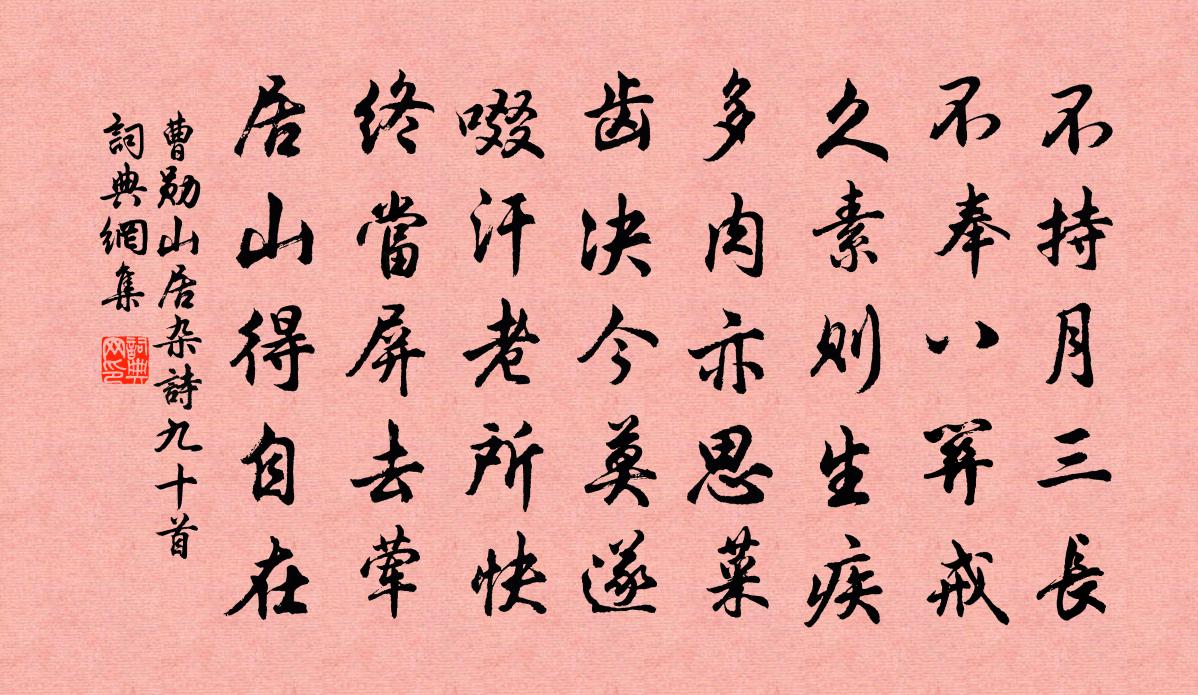 詩詞名句歷史字典書法欣賞書法字典國語詞典說文解字康熙字典古漢語字典標 題 作 者 詩 句 山居雜詩九十首作者:曹勛 朝代:宋代山居雜詩九十首原文不持月三長,不奉八關戒。久素則生疾,多肉亦思菜。齒決今莫遂,啜汗老所快。終當屏去葷,居山得自在。詩詞問答問:山居雜詩九十首的作者是誰?答:曹勛問:山居雜詩九十首寫於哪個朝代?答:宋代曹勛山居雜詩九十首書法欣賞山居雜詩九十首書法作品詩詞推薦滿庭芳 贈王知玄馬鈺〔元代〕兒孫枷*,妻妾干戈。惺惺靈利邪魔。蝸角蠅頭名利,寵辱驚多。尋思 * 鞋履,到來朝、事節如何。遮性命,奈探芳信(賀麓翁秘閣滿月)吳文英〔宋代〕探春到。見彩花釵頭,玉燕來早。正紫龍眠重,明月弄清曉。夜塵不浸銀河水,金盎供新澡。鎮帷犀、護緊東風,適遠陳與義〔宋代〕處處非吾土,年年備虜兵。何妨更適遠,未免一傷情。石岸煙添色,風灘暮有聲。平生五字律,頭白不貪名。點絳唇蔡伸〔宋代〕解紱朝天,滿城桃李繁陰市。彩舟難駐。忍聽驪歌舉。協贊中興,聖意方傾注。從今去。五雲深處。穩步沙堤路。圍棋歌戲江瞻道兼呈蔡秘校張耒〔宋代〕蔡子圍棋非我敵,我謹事之如大國。主盟召會不敢辭,近忽憑陵有驕色。鄒人戰魯固非宜,于越入吳誰可測。願君春怨王令〔宋代〕掃地待花落,惜花輕眷塵。遊人空眷戀,踏去卻尋春。徐太博母夫人輓詞戴栩〔宋代〕孫榮子貴問何如,籩斝盈庭學魯儒。若盡禮宗天下少,縱修彤史古人無。歸眠山館還知命,賜吉朝衣得暫娛。欲寄登裴公亭借用杜牧之登齊山詩韻二首趙善括〔宋代〕春晚風花片片飛,登臨共惜景熹微。人生待足誰如意,官況苦無胡不歸。且向園林窮勝事,更憑山水發清暉。酒酣好事近王之望〔宋代〕彩艦載娉婷,宛在玉樓瓊宇。人慾御風仙去,覺衣裳飄舉。玉京咫尺是藍橋,一見已心許。夢解漢皋珠佩,但茫茫贈別顯上人釋紹嵩〔宋代〕兩浙尋山遍,依稀三十秋。征塵添老色,藜杖賦歸休。落葉隨杯渡,殘虹帶夕收。不知從此去,能寄短書不。初到績溪視事三日出城南謁二祠游石照偶成四蘇轍〔宋代〕雨開石照正新磨,鳥度猿攀野客過。忽見塵容應笑我,年來底事白須多。怨王孫/憶王孫佚名〔宋代〕夢斷漏悄。愁濃酒惱。寶枕生寒,翠屏向曉。門外誰掃殘紅。夜來風。玉簫聲斷人何處。春又去。忍把歸期負。此次韻酬戴式之方岳〔宋代〕山房秋蘚滑,吾亦為詩來。家遠雁初到,邊寒菊未開。貧知心事古,老覺鬢毛催。能共清談否,呼童急洗杯。老母適至時已見黜胡仲弓〔宋代〕千里迎阿{上彌下女},相見翻不樂。微祿期奉親,親至祿已奪。所悲乏故交,何以寓漂泊。向來耿介心,饋遺拒西江月汪莘〔宋代〕天下老松有數,人間不記何年。海心岳頂寺門前。我欲收成一片。為向此公傳語,卻教老子隨緣。龍盤虎踞負青天懷子蒼吳則禮〔宋代〕爛爛白眼安在哉,只今懷抱向誰開。端知脊樑只似鐵,想見舌本長如雷。茅屋關心句突兀,藜羹不糝胸崔嵬。江頭第七渡黃甲〔宋代〕仙源七渡更流長,鵝管瓶頭滴乳香。觸處岩前如雨瀉,舉瓢挹處訝天漿。和周鳳隱止酒韻柴元彪〔宋代〕邃古花奠堪輿,狉狉群鹿豕。由蒙以至需,生人飲食始。世值勛華初,人文日以起。民用非花醴,無以供祭祀。遡第一百五十七文天祥〔宋代〕江漢故人少,東西訊息稀。異花開絕域,野風吹征衣。贈顧梅山雷苦齋〔宋代〕攜手河梁送子卿,池塘青草夢中生。武林今有梅山老,五字才高筆代耕。名句推薦小人錯其在己者,而慕其在天者。荀子《荀子·天論》 十二闌乾,故國三千里。王庭筠《鳳棲梧·衰柳疏疏苔滿地》 波光水鳥驚猶宿, 露冷流螢濕不飛。湯顯祖《江宿》 當關不報侵晨客,新得佳人字莫愁。李商隱《富平少侯》 寶馬雕車香滿路。辛棄疾《青玉案·元夕》 雷填填兮雨冥冥,猿啾啾兮狖夜鳴;屈原《九歌》 離愁不管人飄泊。年年孤負黃花約。黃機《憶秦娥·秋蕭索》 子胥既棄吳江上,屈原終投湘水濱。李白《行路難三首》 桃花落。閒池閣。山盟雖在,錦書難托。陸游《釵頭鳳·紅酥手》 藥醫不死病,死病無藥醫。張南莊《何典·第三回》
