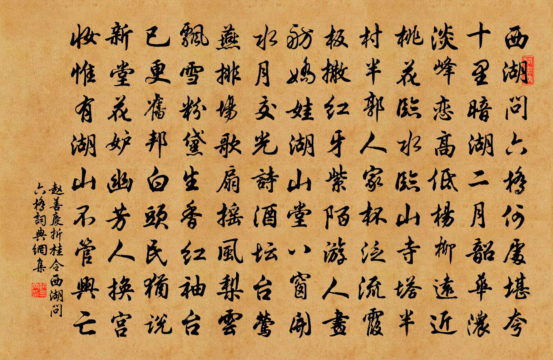 詩詞名句歷史字典書法欣賞書法字典國語詞典說文解字康熙字典古漢語字典標 題 作 者 詩 句 【雙調】折桂令_西湖問六橋作者:趙善慶 朝代:元代原文西湖問六橋何處堪夸?十里暗湖,二月韶華。濃淡峰戀,高低楊柳,遠近桃花。臨水臨山寺塔,半村半郭人家。杯泛流霞,板撒紅牙,紫陌遊人,畫舫嬌娃。湖山堂八窗開水月交光,詩酒罈台,鶯燕排場。歌扇搖風,梨雲飄雪,粉黛生香。紅袖台已更舊邦,白頭民猶說新堂。花妒幽芳,人換宮妝,惟有湖山,不管興亡。詩詞問答問:《【雙調】折桂令_西湖問六橋》的作者是誰?答:趙善慶問:該詩寫於哪個朝代?答:元代書法欣賞【雙調】折桂令_西湖問六橋書法作品詩詞推薦挹仙亭真德秀〔宋代〕漢宮葦篋兒呱呱,濟南梓柱陰扶疏。富平家人正愉樂,安昌帝師工獻諛。子真東南一尉耳,黃綬淒涼百僚底。手持初夏丘葵〔宋代〕一信楝花風,一年春事空。池荷還揭揭,櫻筍又匆匆。空嘆時光換,誰知造化工。盡將枝上色,並作石榴紅。題布金寺鐘樓劉宰〔宋代〕雲間飄緲出層樓,樓上鍾成四百秋。當日繁華今不見,鐘聲依舊滿林丘。蝶戀花周紫芝〔宋代〕天意才晴風又雨。催得風前,日日吹輕絮。燕子不飛鶯不語。滿庭芳草空無數。春去可堪人去也。枝上殘紅,不忍唐棲寺前釋永頤〔宋代〕唐寺前溪水流,客帆來往舊杭州。津亭樹老無人記,得見幾回僧白頭。連嶺遇雨楊萬里〔宋代〕肩輿正好看山色,雨里兩窗開不得。此外只有書可觀,斜點又來濕書冊。一月秋晴一月泥,南翁此諺似可疑。山寒開塗田道者求語釋亮〔宋代〕大海波濤涌,道人願力堅。當頭一截斷,萬頃看平田。十一月十九日與仲猷大年綽中美中飲於南台洪邁〔宋代〕空山欲暝雲冥冥,玉梅半開吾眼形。此身垂欲走塵土,聊復舉酒看崢嶸。折腰向人不知恥,故園可鋤在千里。金昆光武帝臨淄勞耿弇劉秀〔兩漢〕車駕至臨溜自勞軍,群臣大會。帝謂弇曰:“昔韓信破歷下以開基,今將軍攻祝阿以發跡,此皆齊之西界,功足相文中子石介〔宋代〕龍蟄河汾道不行,訏謨經濟授諸生。由來房魏皆卿相,共輔文皇致太平。清風短吟邵雍〔宋代〕清風興況未全衰,豈謂天心便棄遺。長具齋莊緣讀易,每慚疏散為吟詩。人間好景皆輸眼,世上閒愁不到眉。生長吳江太湖笠澤虹橋梅詢〔宋代〕岸傍高士陸龜蒙,羌雁曾徵戀釣筒。船戶平居兩山下,圖經分載幾州中。以同心之言其臭如蘭為韻寄李子先黃庭堅〔宋代〕往日三語掾,解道將無同。我觀李校書,超邁有古風。談道屢入微,閉門長蒿蓬。誰能賞遠韻,太守似安豐。聽琴王建〔唐代〕無事此身離白雲,松風溪水不曾聞。至心聽著仙翁引,今看青山圍繞君。溪口雲張文姬〔唐代〕溶溶溪口雲,才向溪中吐。不復歸溪中,還作溪中雨。邊游別友人張蠙〔唐代〕欲別不止淚,當杯難強歌。家貧隨日長,身病涉寒多。雨雪迷燕路,田園隔楚波。良時未自致,歸去欲如何。漫興 十六王冕〔元代〕自笑青雲遠,誰憐白髮孤?艱難知道路,瀟灑問江湖。事業留詩卷,田園入畫圖。清高過老杜,囊底一錢無。次韻子文沖雨迓使者,道聞子規范成大〔宋代〕夢魂翾蜨翅,鼻息吼鼉鼓。喚起治曉裝,馬嘶童僕語。汨泥溷鳧騖,慚愧黃鵠舉。猥吟陬隅池,浪廢桔槔圃。啼鵑沁園春 憶故人王結〔元代〕蓋世英雄,谷口躬耕,商山采芝。甚野情自愛,山林枯槁,癯儒那有,廓廟英姿。落魄狂游,故人不見,藹藹停雲雜曲歌辭。悲哉行鮑溶〔唐代〕促促晨復昏,死生同一源。貴年不懼老,賤老傷久存。朗朗哭前歌,絳旌引幽魂。來為千金子,去臥百草根。黃土名句推薦素富貴,行乎富貴;素貧賤,行乎貧賤子思《中庸·第十四章》 九衢雪小,千門月淡,元宵燈近。晁端禮《水龍吟·詠月》 誠既勇兮又以武,終剛強兮不可凌。屈原《國殤》 曉月過殘壘,繁星宿故關。司空曙《賊平後送人北歸》 任憑弱水三千,我只取一瓢飲。曹雪芹《紅樓夢·第九十一回》 商女不知亡國恨,隔江猶唱後庭花。杜牧《泊秦淮》 舉頭忽見衡陽雁。千聲萬字情何限。陳達叟《菩薩蠻·舉頭忽見衡陽雁》 路出寒雲外,人歸暮雪時。盧綸《李端公 / 送李端》 暮從碧山下,山月隨人歸。李白《下終南山過斛斯山人宿置酒》 全一人者德之輕,拯天下者功之重房玄齡《晉書·帝紀·第三章》