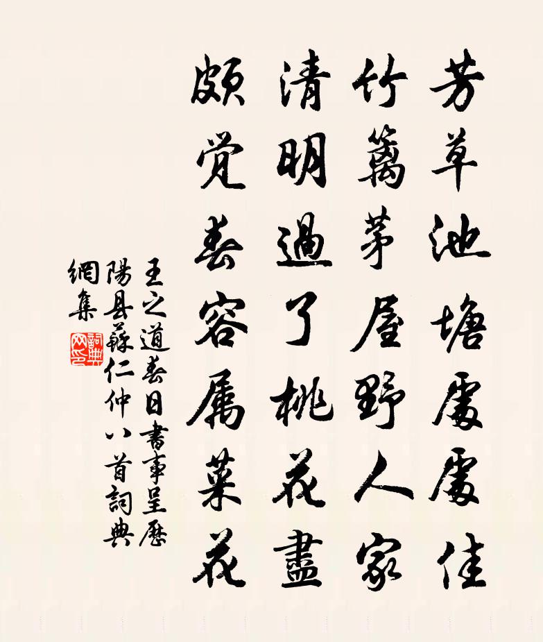 詩詞名句歷史字典書法欣賞書法字典國語詞典說文解字康熙字典古漢語字典標 題 作 者 詩 句 春日書事呈歷陽縣蘇仁仲八首作者:王之道 朝代:宋代原文芳草池塘處處佳,竹籬茅屋野人家。清明過了桃花盡,頗覺春容屬菜花。詩詞問答問:《春日書事呈歷陽縣蘇仁仲八首》的作者是誰?答:王之道問:該詩寫於哪個朝代?答:宋代書法欣賞春日書事呈歷陽縣蘇仁仲八首書法作品詩詞推薦約潘丈及小喻登樓玉台觀木香酴醾陳宓〔宋代〕暮年無事掛胸懷,只為酴醾築此台。恰似唐朝元會日,露翻珠翠六宮來。和吳學士對春雪獻韋令公次韻黃滔〔唐代〕春雪下盈空,翻疑臘未窮。連天寧認月,墮地屢兼風。忽誤邊沙上,應平火嶺中。林間妨走獸,雲際落飛鴻。梁苑會昌勸農曾豐〔宋代〕官不勸農農亦耕,詔書那可廢常行。煙霞自避旌旗色,魚鳥相疑金鼓聲。蝶急豈遑追夢覺,鳩閒猶強管陰晴。忙中偈頌一百六十首釋宗杲〔宋代〕去是住時因,住是去時果。去住與果因,無可無不可。閒中信筆二首其一追和陳去非韻其一追和王履陸游〔宋代〕我看浮名如脫髮,誓暮收身老岩穴。座延窮鬼心不疑,爐鍾橫財渠自別。樂哉今為八十翁,神交園綺商山中。烹葵題澹山岩蔣緯〔宋代〕風生崖木響,靄散洞門寬。幽徑盤危入,青天一面看。三冬僧定煖,五月客游寒。縱有通神筆,亦應圖出難。聲聲慢(宏庵宴席,客有持桐子侑俎者,自雲其姬親剝之)吳文英〔宋代〕寒筲驚墜,香豆初收,銀床一夜霜深。亂瀉明珠,金盤來薦清斟。綠窗細剝檀皺,料水晶、微損春簪。風韻處,惹落花怨十首劉克莊〔宋代〕越公多美妓,衛尉足名姝。無計留紅拂,傷心墜綠珠。夏日過友人檀溪別業李頻〔唐代〕暑天宜野宅,林籟爽泠泠。沙月邀開戶,岩風助掃庭。鷺棲依綠筱,魚躍出清萍。客抱方如醉,因來得暫醒。韓康公輓詞三首蘇軾〔宋代〕西第開東閣,初筵點後塵。笙歌邀白髮,燈火樂青春。扶路三更罷,回頭一夢新。賦詩猶墨濕,把卷獨沾巾。將至浯溪簡同行項安世〔宋代〕地想浯溪行,舟逢怪石多。平生真到此,重九合如何。我解伊吾讀,君能欸乃歌。風從兩崖下,江水急生波。送舉老歸廬山范成大〔宋代〕二千里往回似夢,四十年今昔如浮。去矣莫久留桑下,歸歟來共煨芋頭。水調歌頭翠微翁〔宋代〕蓂莢繞開六,寶曆已當千。人間收盡繁溽,涼意入琴弦。盡道薦衡交剡,更值生申時節,喜色動閭閻。終夜望銀漢減字木蘭花 崔女郎像邵亨貞〔元代〕紅妝傾國。人在蒲東誰畫得。玉骨成塵。往事流傳恐未真。月明*戶。猶似隔牆花動處。夜冷西廂。一度魂歸一斷萬事王安石〔宋代〕萬事黃粱欲熟時,世間談笑漫追隨。雞蟲得失何須算,鵬鶡逍遙各自知。中秋夜隴州徐常侍座中詠月無可〔唐代〕隴城秋月滿,太守待停歌。與鶴來松杪,開煙出海波。氣籠星欲盡,光滿露初多。若遣山僧說,高明不可過。思佳客(王宰席上贈歌姬)袁去華〔宋代〕把酒聽歌始此回。流鶯花底語徘徊。神仙也許人間見,腔調新翻輦下來。銀燭灺,玉山頹。誰言弱水隔蓬萊。絕勝望月婆羅門 懷古王寂〔元代〕笑談尊俎,坐中驚嘆謫仙人。烏絲落筆如神。喚起小鬟風味,學按古陽春。對瓊枝璧月,朝暮長新。宦萍此身。嘆秋夜燕山旅舍偶成寄林致和王冕〔元代〕花漏無聲海月陰,小窗燈火夜沈沈。出師表動英雄志,征伐書移慷慨心。邊塞雪深迷小草,關河秋老見喬林。不須春懷杜牧〔唐代〕年光何太急,倏忽又青春。明月誰為主?江山暗換人。鶯花潛運老,榮樂漸成塵。遙憶朱門柳,別離應更頻。名句推薦夫為將者,必有腹心、耳目、爪牙。諸葛亮《將苑·卷一·腹心》 飄風不終朝,驟雨不終日。孰為此者?天地。天地尚不能久,而況於人乎?老子《老子·道經·第二十三章》 空勞縴手,解佩贈情人。牛希濟《臨江仙·柳帶搖風漢水濱》 風蕭蕭而異響,雲漫漫而奇色。江淹《別賦》 百里不販樵,千里不販糴。司馬遷《史記·七十列傳·貨殖列傳》 韶華不為少年留,恨悠悠,幾時休?秦觀《江城子·西城楊柳弄春柔》 理郁者苦貧,辭溺者傷亂劉勰《文心雕龍·神思》 禍在於好利;害在於親小人尉繚《尉繚子·十二陵》 去意徊徨,別語愁難聽。周邦彥《蝶戀花·早行》 牆外行人,牆裡佳人笑。蘇軾《蝶戀花·春景》