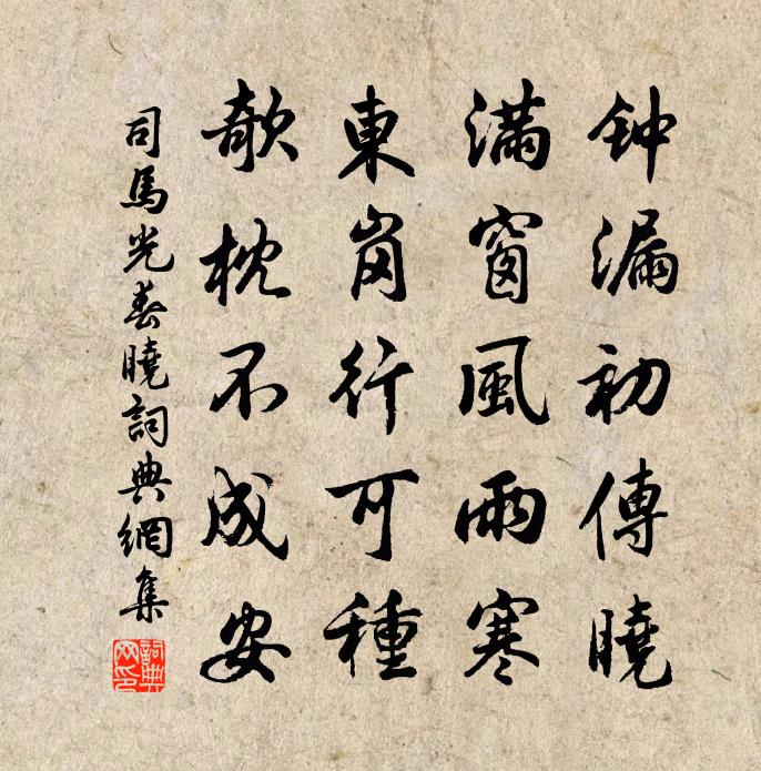詩詞名句歷史字典書法欣賞書法字典國語詞典說文解字康熙字典古漢語字典標 題 作 者 詩 句 春曉作者:司馬光 朝代:宋代春曉原文鐘漏初傳曉,滿窗風雨寒。東崗行可種,欹枕不成安。詩詞問答問:春曉的作者是誰?答:司馬光問:春曉寫於哪個朝代?答:宋代問:司馬光的名句有哪些?答:司馬光名句大全司馬光春曉書法欣賞春曉書法作品詩詞推薦神光寺歐陽袞〔唐代〕香剎懸青磴,飛樓界碧空。石門棲怖鴿,慈塔繞歸鴻。有法將心鏡,無名屬性通。從來樂幽寂,尋覓未能窮。閒居雜詠三十二首改過陳淳〔宋代〕過者動之差,毋容實諸已。才覺必速改,乃不為吾累。句王度〔宋代〕危紅賒晚景,漲綠上平沙。薛老亭晚歸曾鞏〔宋代〕終日行山不出城,城中山勢與去平。萬家市井魚鹽合,千里川原彩錯明。座上潮風醒酒力,晚來岩霧蓋鐘聲。歸時賢者之孝二百四十首楊子林同〔宋代〕不可得而久,其惟父母乎。諄諄愛日文,楊氏豈欺予。題惠安寺增勝堂王銍〔宋代〕心是華嚴境,圓機更善根。一塵猶可見,十勝不為繁。放鶴掃松逕,呼猿開竹門。妙高峰頂住,客到亦忘言。題玉山觀禪師蘭若韓翃〔唐代〕玉山宴坐移年月,錫杖承恩詣丹闕。先朝親與會龍華,紫禁鳴鐘白日斜。宮女焚香把經卷,天人就席禮袈裟。禪床行香子慢佚名〔宋代〕瑞景光融。換中天霽煙、佳氣蔥蔥。皇居崇壯麗,金碧輝空。彤霄外、瑤殿深處,簾卷花影重重。迎步輦、幾簇真【越調】小桃紅_當時羅帕寫周文質〔元代〕當時羅帕寫宮商,曾寄風流況。今日樽前且休唱,斷人腸,有花有酒應難忘。香消夜涼,月明枕上,不信不思量。寄高菊磵謝惠詩集裘萬頃〔宋代〕高名如斗夜垂天,無地追思每自憐。正欲為君尋五老,乃蒙因我到雙泉。新詩妙絕閒方就,稚子攜歸喜欲顛。此去宿無可上人房(一作宿翠微寺)馬戴〔唐代〕稀逢息心侶,細話遠山期。河漢秋深夜,杉梧露滴時。風傳林磬久,月掩草堂遲。坐臥禪心在,浮生皆不知。過餘干吳師中秀才以小詩惠歙硯次韻謝之周必大〔宋代〕舊曾起草向明光,獨與羅文近赭黃。三載瓦池研灶墨,因君聊復夢儀凰。過秦樓陳允平〔宋代〕穀雨收寒,茶煙揚曉,又是牡丹時候。浮龜碧水,聽鶴丹山,彩屋幔亭依舊。和氣縹緲人間,滿谷紅雲,德星呈秀陳伯成學士垂訪以病中新浴不克見走書二短篇強至〔宋代〕時情逐勢餌邊魚,貧病由來俗易疏。何事太丘直有道,炎天問病到貧居。晚歲送館人歸省裘萬頃〔宋代〕不厭冰霜路,沖寒辦一歸。晨雞戒鞍馬,春酒壽庭闈。燈火知辛苦,雲霄會奮飛。相期紆綠綬,非但戲斑衣。因夢得題公垂所寄蠟燭因寄公垂白居易〔唐代〕照梁初日光相似,出水新蓮艷不如。卻寄兩條君領取,明年雙引入中書。[宰相入朝舉雙燭,余官各一。]雨雪文天祥〔宋代〕秋色金台路,殷殷半馬蹄。因風隨作雪,有雨便成泥。過眼驚新夢,傷心憶舊題。江雲愁萬疊,遺恨鷓鴣啼。行住坐臥三十二頌釋印肅〔宋代〕割愛辭親如是行,豈求衣食及為僧。步步澄輝無別想,卓然獨立妙明生。登龍山塔寺林昉〔宋代〕吳越夕陽多遠山,塔樓高處九秋寒。江豚吹浪腥風濕,野鳥行空翥雪乾。白日潮聲僧老盡,黃埃世路客游難。海門浮丘亭范成大〔宋代〕黟山鬱律神仙宅,三十六峰雷雨隔。碧城欄檻偃雙旌,笑挹浮丘為坐客。岩扉無鎖晝長開,紫雲明滅多樓台。雲中名句推薦妾家高樓連苑起,良人執戟明光里。張籍《節婦吟·寄東平李司空師道》 策馬自沙漠,長驅登塞垣。高適《薊中作》 如夢,如夢,殘月落花煙重。李存勖《如夢令·曾宴桃源深洞》 雨中黃葉樹,燈下白頭人。司空曙《喜外弟盧綸見宿》 深林人不知,明月來相照。王維《竹里館》 故人何不返,春華復應晚。柳惲《江南曲》 春未來時,酒攜不到千岩路。吳文英《點絳唇·越山見梅》 殺一無罪,非仁也;非其有而取之,非義也。孟子《孟子·盡心章句上·第三十三節》 風力雖尚勁,然徒步則汗出浹背。袁宏道《滿井遊記》 今日江頭兩三樹,可憐和葉度殘春。元稹《離思五首》