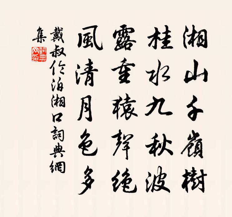 詩詞名句歷史字典書法欣賞書法字典國語詞典說文解字康熙字典古漢語字典標 題 作 者 詩 句 泊湘口作者:戴叔倫 朝代:唐代泊湘口原文湘山千嶺樹,桂水九秋波。露重猿聲絕,風清月色多。詩詞問答問:泊湘口的作者是誰?答:戴叔倫問:泊湘口寫於哪個朝代?答:唐代問:泊湘口是什麼體裁?答:五絕問:戴叔倫的名句有哪些?答:戴叔倫名句大全戴叔倫泊湘口書法欣賞泊湘口書法作品注釋全唐詩:卷274_42詩詞推薦結之白居易〔唐代〕歡愛今何在,悲啼亦是空。同為一夜夢,共過十年中。成性吟邵雍〔宋代〕成性存存,用志不分。又何患乎,不到古人。古斷腸曲三十首周端臣〔宋代〕修竹生煙晚逗陰,翠羅香袖怯寒侵。恨同社燕身為客,怕剝秋蓮苦在心。廣福聰長老畫無準頂相請贊釋心月〔宋代〕這慈尊,曾自贊。煮不熟,燒不爛。有軟頑,沒思算。秤須彌重四兩,量虛空闊丈半。更有白{左亻中糹右刀}不題畫蘭卷兼梅花王冕〔元代〕湘江雲盡湘山青,秋蘭花開秋露零。三閭已矣喚不起,□蕕蕭艾春娉婷。次飈吹香散郊坰,山蜂野蝶何營營?幽人郊廟歌辭。武后享清廟樂章十首。第六送文舞佚名〔唐代〕帝圖草創,皇業初開。功高佐命,業贊雲雷。雜感陸游〔宋代〕鶴乘軒車已堪嘆,狐戴髑髏何可親?勸君一笑掃除盡,來作人間百歲人。喜從弟雪中遠至有作杜荀鶴〔唐代〕深山大雪懶開門,門逕行蹤自爾新。無酒禦寒雖寡況,有書供讀且資身。便均情愛同諸弟,莫更生疏似外人。晝短無題張籍〔唐代〕桃溪柳陌好經過,燈下妝成月下歌。為是襄王故宮地,至今猶有細腰多。留題仙遊寺魏野〔宋代〕將從三峽泛扁舟,先向仙遊寺里游。水石卻驚偏怪異,江山狂興一時休。游近村陸游〔宋代〕被發行歌雪滿膺,夕陽顧影亂鬅鬙。乞漿得酒人情好,賣劍買牛農事興。社鼓賽秋聞坎坎,塔燈照夜望層層。歸來題義門胡氏華書院許堅〔唐代〕盡說靈蹤妨畫圖,幽奇高尚義群居。山林總是神仙隱,禮樂爰修周孔書。解駕十年惟壯士,擔簦千里結名廬。功成夢中司空圖〔唐代〕幾多親愛在人間,上徹霞梯會卻還。須是蓬瀛長買得,一家同占作家山。十一月三日過升仙橋作陸游〔宋代〕橋邊沙水綠蒲老,原上煙蕪黃犢閒。老子真成興不淺,憑鞍歸夢遶家山。偈頌一百二十三首釋祖欽〔宋代〕撮土成金古趙州,據人來問直相酬。聲前有意今誰委,門外一江春水流。初到南康示諸邑令陳宓〔宋代〕田裡三年兩旱乾,茅檐十室九饑寒。殷勤此日無他事,好把斯民子樣看。擬古其二李白〔唐代〕高樓入青天,下有白玉堂。明月看欲墮,當窗懸清光。遙夜一美人,羅衣沾秋霜。含情弄柔瑟,彈作陌上桑。弦聲打鰣魚吳嘉紀〔清代〕打鰣魚,暮不休。前魚已去後魚稀,搔白官人舊黑頭。販夫何曾得偷買,胥徒兩岸爭相待。人馬銷殘日無算,百計御書閣額辛棄疾〔宋代〕傑閣侵霄漢,宸章煥壁奎。內廷頒寶宴,中使揭璇題。信誓山河固,恩寵雨露低。寒儒倚天祿,目斷五雲西。次韻答正老強至〔宋代〕幽歡閒憶去年時,飲量人人灌漏卮。我更典衣邀淺飲,君猶刻燭賦新詩。由來世事都無定,再結朋游未可期。一紙名句推薦白頭太守真愚甚,滿插茱萸望辟邪。宋祁《九日置酒》 當時明月在,曾照彩雲歸。晏幾道《臨江仙·夢後樓台高鎖》 君子之於子,愛之而勿面,使之而勿視,道之以道而勿強。荀子《荀子·大略》 巴子城頭青草暮。巴山重疊相逢處。張先《漁家傲·和程公辟贈》 別有幽愁暗恨生,此時無聲勝有聲。白居易《琵琶行 / 琵琶引》 得其所利,必慮其所害;樂其所成,必顧其所敗。劉向《說苑·敬慎》 三十功名塵與土,八千里路雲和月。岳飛《滿江紅·寫懷》 棲鴉流水點秋光,愛此蕭疏樹幾行。紀映淮《詠秋柳》 三月休聽夜雨,如今不是催花。張炎《清平樂·采芳人杳》 一壺濁酒喜相逢,古今多少事,都付笑談中。羅貫中《三國演義·第一回》
