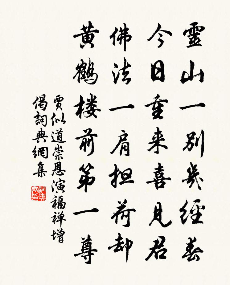詩詞名句歷史字典書法欣賞書法字典國語詞典說文解字康熙字典古漢語字典標 題 作 者 詩 句 崇恩演福禪增偈作者:賈似道 朝代:宋代崇恩演福禪增偈原文靈山一別幾經春,今日重來喜見君。佛法一肩擔荷卻,黃鶴樓前第一尊。詩詞問答問:崇恩演福禪增偈的作者是誰?答:賈似道問:崇恩演福禪增偈寫於哪個朝代?答:宋代賈似道崇恩演福禪增偈書法欣賞崇恩演福禪增偈書法作品詩詞推薦襲美留振文宴龜蒙抱病不赴猥示倡和因次韻酬謝陸龜蒙〔唐代〕綺席風開照露晴,只將茶荈代雲觥。繁弦似玉紛紛碎,佳妓如鴻一一驚。毫健幾多飛藻客,羽寒寥落映花鶯,幽人又九月十四日登秋風閣以餘霞散成綺澄江靜如李廌〔宋代〕繆蹈江海跡,吾生靡懷居。役車窘陰雨,蒸腐敗衣袽。晨昏雷聲中,我懷何時舒。秋陽出頑雲,杲杲照我裾。言登笑堂釋妙倫〔宋代〕冷地無端錯喜歡,卻將鴟吻對門安。引它鐵作麵皮漢,千里聞風也破顏。江城子無何有翁〔宋代〕小年底死路槐忙。嘆蟬聲,早斜陽。今夕何年,白骨照沙場。天上人間都是夢,石中火,鑊中湯。人如今且免秀才贈徐國諭趙汝騰〔宋代〕英英直氣驗操存,夜夜群書日灌園。嫩不到城三十載,老猶落筆數千言。吳公何敢輕招賈,徐穉茲來特訪蕃。衰拙石潭觀魚蒲壽宬〔宋代〕拂石搘頤久,閒心寂似初。不知渾是水,寧覺我非魚。欲數猶疑幻,相看若在虛。星星雙鬢影,何事入方諸。次沈會宗韻毛滂〔宋代〕故人老蕭散,久客寡諧同。病骨侵山雨,孤帆落渚風。水清應弔影,坐闃想書空。我亦青州闊,經年不一中。伯父《送先人下第歸蜀》詩云︰人稀野店休安蘇軾〔宋代〕竹笥與練裙,隨時畢婚嫁。無事若相思,征鞍還一跨。望江南/憶江南方岳〔宋代〕梅欲老,撐月過南徐。家口縱多難減鶴,路程不遠易攜書。只是廢春鋤。霜滿袖,茶灶借僧廬。湖海甚豪今倦矣,滿庭芳(和富憲公權餞別)王之道〔宋代〕歌徹驪駒,酒斟醽醁,帆檣高映城樓。繡衣攜具,開宴話離愁。兩岸橙黃橘綠,一行雁、幾點沙鷗。情千萬,相看嗟美人詞李廌〔宋代〕嗟美人兮何人,撫千祀兮增悲。咎司命之匪仁兮,弗庇下民。故嗇數於令人兮,俾弗儷乎常期。既闓端之引大,復棋貫休〔唐代〕棋信無聲樂,偏宜境寂寥。著高圖暗合,勢王氣彌驕。人事掀天盡,光陰動地銷。因知韋氏論,不獨為吳朝。題竹隱梅外二先生祠堂趙必象〔宋代〕一辦瞻祠像,形癯道自腴。衣冠千載事,功力廿篇書。老竹秦四皓,寒梅漢二疏。紛紛麟閣畫,章服里猴狙。次韻十絕見客樓鑰〔宋代〕客至何妨送與迎,門前羅爵亦人情。可憐寒士猶相望,時有飢來柳絮輕。春帖子詞皇后閣十首宋祁〔宋代〕雙闕鮮雲抱日光,朝來春意已昌昌。先從太液催波綠,後到靈和報柳黃。春燕林泳〔宋代〕鵲結巢隨太歲移,蜂分房占吉時飛。好將說與青台史,社日只憑燕子歸。贈華岩院玉真上人陳舜俞〔宋代〕青蘿翠竹鎖禪關,門對松林第一灣。白髮老禪應有道,等閒隨客達前山。郊廟朝會歌辭紹熙元年恭上壽星聖皇太后至尊佚名〔宋代〕大哉乾元,既極形容。坤元德至,實興比隆。實冊閏登,勒崇垂鴻。相我縟備,肅肅雍雍。開孫滿月陸游〔宋代〕夜夢奇童拜且言,今乃幸得生高門。夢後一日得開孫,虎兒墮地百獸奔。未論頭角與眉宇,但聽啼聲誰敢侮!就令勝勝慢/聲聲慢佚名〔宋代〕寒應消盡,麗日添長,百花未敢先拆。冷艷幽香,分過溪南春色。調酥旋成素蕊,向碧瓊、枝頭勻滴。愁腸斷,怕名句推薦六出飛花入戶時,坐看青竹變瓊枝。高駢《對雪》 澄江平少岸,幽樹晚多花。杜甫《水檻遣心二首》 安民可與為義,而危民易與為非賈誼《過秦論》 夫為將之道,必順天、因時、依人以立勝也。諸葛亮《將苑·卷一·智用》 一溪煙柳萬絲垂,無因系得蘭舟住。周紫芝《踏莎行·情似遊絲》 高築牆,廣積糧張廷玉《明史·列傳·卷二十四》 桂林之一枝,崑山之片玉。房玄齡《晉書·列傳·第二十二章》 荒村帶返照,落葉亂紛紛。劉長卿《碧澗別墅喜皇甫侍御相訪》 牧童騎黃牛,歌聲振林樾。袁枚《所見》 禮以行義,義以生利,利以平民,政之大節也。左丘明《左傳·成公·成公二年》