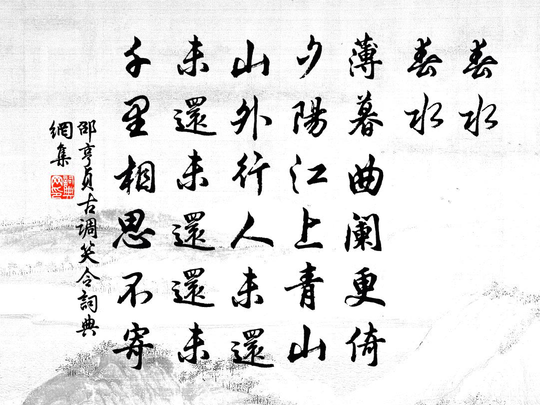 詩詞名句歷史字典書法欣賞書法字典國語詞典說文解字康熙字典古漢語字典標 題 作 者 詩 句 古調笑令作者:邵亨貞 朝代:元代古調笑令原文春水。春水。薄暮曲闌更倚。夕陽江上青山。山外行人未還。未還未還還未。千里相思不寄。詩詞問答問:古調笑令的作者是誰?答:邵亨貞問:古調笑令寫於哪個朝代?答:元代問:古調笑令是什麼體裁?答:詞邵亨貞古調笑令書法欣賞古調笑令書法作品詩詞推薦金剛隨機無盡頌離相寂滅分第十四釋印肅〔宋代〕心空行亦純,轉不退機輪。鄉關無異路,花發洞中春。定風波王哲〔元代〕每日閒遊西復東。隨緣且過住塵中。杳杳冥冥今古在。蒙蒙。害風風裡得飄蓬。公且只知浮蟻動,我今偏愛滿堂紅答韓愈、李觀別,因獻張徐州孟郊〔唐代〕富別愁在顏,貧別愁銷骨。懶磨舊銅鏡,畏見新白髮。古樹春無花,子規啼有血。離弦不堪聽,一聽四五絕。世途一樹劉子翬〔宋代〕一樹梅開早,清香襲客衣。夕陽簫鼓散,半是折殘枝。水龍吟(戊申壽八窗叔)李曾伯〔宋代〕歸來三見梅花,年年藉此花為壽。八窗軒檻,月邊竹畔,數枝開又。姑射肌膚,廣平風度,對人依舊。把離騷讀遍酬答覆州葉教授項安世〔宋代〕竟陵寒盡轉春風,壇杏株林淑氣通。惆悵江陵紅白樹,年年幽獨伴鄰翁。謝彭大夫惠寒山詩三首曹勛〔宋代〕平生為物役,年紀積漸老。不省這個意,老得越顛倒。自讀二詩來,迷雲掃空照。我為謝彭翁,且喜無煩惱。秋日即事邵雍〔宋代〕鳥聲亂晝林,為誰苦驅逼。蟲聲亂夜庭,為誰苦勞役。嗟哉彼何短,一概無休息。借問此何長,兩能忘語默。青龍寺僧院劉得仁〔唐代〕常多簪組客,非獨看高松。此地堪終日,開門見數峰。苔新禽跡少,泉冷樹陰重。師意如山里,空房曉暮鍾。送演侄三首李昴英〔宋代〕少年政要識艱難,受國恩深早一官。著力莫孤先世望,從頭細把四書看。金蘭益友真同志,菽水慈親曲盡歡。學取遣懷五首寄致道謝直〔宋代〕在昔營居巢,首尾三十年。高鄰念羈旅,分我佳林泉。自從倉幕歸,亦買半頃田。坐念顏太師,粥竭祗益煎。不如贈方雲卿地理何夢桂〔宋代〕金仙頂門一隻眼,五眼通神識無限。雲卿留得眼一隻,眼力最高人不識。眼裡青囊一卷經,照破山川無遁形。口談南鄉子(塘門元宵)蔣捷〔宋代〕翠幰夜遊車。不到山邊與水涯。隨分紙燈三四盞,鄰家。便做元宵好景夸。誰解倚梅花。思想燈球墜絳紗。舊說夢滕王閣蘇轍〔宋代〕客從筠溪來,欹仄困一葉。忽逢章貢余,滉盪天水接。風霜出洲渚,草木見毫末。勢奔西山浮,聲動古城嶪。樓觀寒夜與伯氏晏坐宋祁〔宋代〕對擁圓爐坐,蕭然念變衰。樹鳴餘葉亂,燈戰暗花危。罇酒伯仲雅,園荊兄弟枝。陶陶且相樂,低月半遙帷。讀邵不疑學士詩卷杜挺之忽來因出示之且伏高梅堯臣〔宋代〕作詩無古今,唯造平淡難。譬身有兩目,瞭然瞻視端。邵南有遺風,源流應未殫。所得六十章,小大珠落盤。光彩次單君范袖來汪西皋所譔詠秋十章以示因和之陳著〔宋代〕自古年年自有秋,悲秋元只是閒愁。感時只有長庚子,說到衣冠成古邱。大酺·越調春雨周邦彥〔宋代〕對宿煙收,春禽靜,飛雨時鳴高屋。牆頭青玉旆,洗鉛霜都盡,嫩梢相觸。潤逼琴絲,寒侵枕障,蟲網吹黏簾竹。紹興十三年發皇后冊寶十三首佚名〔宋代〕朝陽已升,薰風習至。樂奏既成,禮容亦備。玉佩鏘鳴,帝徐舉趾。台政穆宣,以聽內治。侍宴華光殿曲水奉勑為皇太子作詩 八謝朓〔南北朝〕灞滻入筵。河淇流阼。海若來往。觴餚{氵公}泝。歡飫有終。清光欲暮。輕貂回首。華組徐步。名句推薦獨有宦遊人,偏驚物候新。杜審言《和晉陵陸丞早春遊望》 顧謂戚夫人,彼翁羽翼成。李白《山人勸酒》 千古英雄同一嘆,傷懷豈止為蛾眉沈約《昭君辭》 菊暗荷枯一夜霜。新苞綠葉照林光。蘇軾《浣溪沙·詠橘》 遠牧牛,繞村四面禾黍稠。李涉《牧童詞》 秋聲帶葉蕭蕭落,莫響城頭角!董士錫《虞美人·韶華爭肯偎人住》 如知其非義,斯速已矣,何待來年。孟子《孟子·滕文公章句下·第八節》 若有知音見采,不辭遍唱陽春。晏殊《山亭柳·贈歌者》 聞善以相告也,見善以相示也戴聖《禮記·儒行》 雲山行處合,風雨興中秋。高適《送魏八》