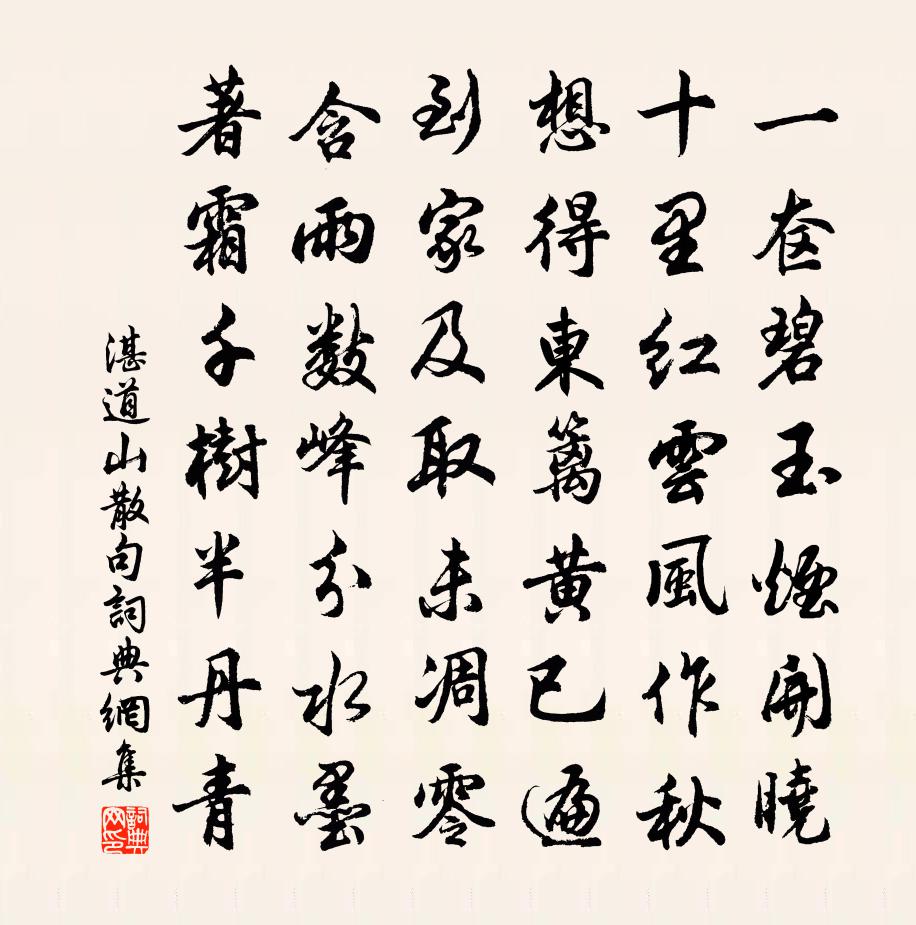 詩詞名句歷史字典書法欣賞書法字典國語詞典說文解字康熙字典古漢語字典標 題 作 者 詩 句 句作者:湛道山 朝代:宋代句原文一奩碧玉煙開曉,十里紅雲風作秋。想得東籬黃已遍,到家及取未凋零。含雨數峰分水墨,著霜千樹半丹青。詩詞問答問:句的作者是誰?答:湛道山問:句寫於哪個朝代?答:宋代湛道山句書法欣賞句書法作品詩詞推薦水龍吟(前題)王沂孫〔宋代〕翠雲遙擁環妃,夜深按徹霓裳舞。鉛華淨洗,涓涓出浴,盈盈解語。太液荒寒,海山依約,斷魂何許。甚人間、別送王楚材往湖州聽讀敖陶孫〔宋代〕短羽真成入彀游,小儒蹤跡欲誰求。非關古字誅揚子,自是諸生欠沈猶。百計千方元薄命,雙溪二水各宜秋。此行雨中花慢蔡伸〔宋代〕寓目傷懷,逢歡感舊,年來事事疏慵。嘆身心業重,賦得情濃。況是離多會少,難忘雨跡雲蹤。斷無錦字,雙鱗杳次韻錢穆父贈松扇黃庭堅〔宋代〕銀鉤玉唾明繭紙,松箑輕涼並送似。可憐遠度幘溝婁,適堪今時褦襶子。丈人玉立氣高寒,三韓持節見神山。合得飯牛圖王冕〔元代〕君不見百里奚飯牛而牛肥,胸中經緯無人知;又不見老甯戚時不時兮長嘆息。偶爾君臣稱際會,伯道相高非盛德。甲子秋八月偶思出遊往往累日不能歸或遠至傍陸游〔宋代〕胡麻刈罷下蕎初,引水家家灌晚蔬。但有茅檐隨處好,淵明可獨愛吾廬?太白老人張籍〔唐代〕日觀東峰幽客住,竹巾藤帶亦逢迎。暗修黃籙無人見,深種胡麻共犬行。洞裡仙家常獨往,壺中靈藥自為名。春泉奉陪封大夫九日登高岑參〔唐代〕九日黃花酒,登高會昔聞。霜威逐亞相,殺氣傍中軍。橫笛驚征雁,嬌歌落塞雲。邊頭幸無事,醉舞荷吾君。謝張仲謀端午送巧作黃庭堅〔宋代〕君家玉女從小見,聞道如今畫不成。翦裁似借天女手,萱草石榴偏眼明。葵花董嗣杲〔宋代〕纏粉花心吐膩英,根柔葉縐簇娉娗。錦窠繡窟攢風日,絳節華旌列戶庭。五色種遺吳地秀,獨醒人耀楚江靈。年年贈趙使君美人張謂〔唐代〕紅粉青蛾映楚雲,桃花馬上石榴裙。羅敷獨向東方去,漫學他家作使君。太常引 壽劉同知王惲〔元代〕太行晴色泛簾*。對書史,日優遊。賓從盡風流。誰健似、東陵故侯。人間萬事,塵埃野馬,一笑付紋楸。眉宇壽呈趙使君時方西遁王鎡〔宋代〕欲買寒江載月船,床頭金盡卻誰憐。客囊空有詩千首,難向紅樓當酒錢。庚子冬夜宿郡館懷白從古章綸〔宋代〕高館天寒霜露濃,思君深隱翠微重。月華繞樹無飛鵲,雲飛蟠泥有蟄龍。石鼎賦詩猶脫略,銀燈看劍每從容。孤懷和單令除夕二首胡寅〔宋代〕又聞幽谷有鶯遷,況復山晴花向然。泥犢戒耕呈歲歲,戶靈呵鬼換年年。茅檐剩有三竿日,秫地曾無二頃田。且買楊州官滿辭后土題玉立亭高似孫〔宋代〕且更淮南了歲華,天香深窈竹西家。忽然踏碎瓊樓月,相伴夫人暮倚花。城中赴范純甫酒有感陳著〔宋代〕杜鵑啼斷洛陽橋,心與萍流絮與飄。風雨故都同死夢,山林晚景十年饒。相逢得醉有今日,萬事忘言付落潮。見說郭帥遺蕨羹劉過〔宋代〕書生窮無食肉相,老不能官猶崛強。一杯紫蕨江西羹,萬戶封侯猶未當。主人幕下三千士,談王說伯如蜂起。日日小閣西山落日強至〔宋代〕天地垂垂暮,殘陽似有情。未催全嶺暗,猶放半山明。遠樹微茫見,孤煙慘澹生。流年從此老,對酒急須傾。閒遊所至少留得長句陸游〔宋代〕高僧宴坐雪蒙頭,閒牧從來水牯牛。深院陰陰四檐雨,高堂寂寂一簾秋。光明本自無餘欠,夢幻何曾有去留?我亦名句推薦若有知音見采,不辭遍唱陽春。晏殊《山亭柳·贈歌者》 我寄愁心與明月,隨君直到夜郎西。李白《聞王昌齡左遷龍標遙有此寄》 歌聲未盡處,先淚零周邦彥《綺寮怨·上馬人扶殘醉》 攜盤獨出月荒涼,渭城已遠波聲小。李賀《金銅仙人辭漢歌》 烏絲闌紙嬌紅篆,歷歷春星。納蘭性德《紅窗月·燕歸花謝》 經一失長一智馮夢龍《警世通言·卷三》 遊子春衫已試單,桃花飛盡野梅酸。吳濤《絕句·遊子春衫已試單》 乘興南遊不戒嚴,九重誰省諫書函。李商隱《隋宮》 萋萋芳草小樓西,雲壓雁聲低。劉基《眼兒媚·秋思》 遙憶獨眠人,早寒驚夢頻。顧貞觀《菩薩蠻·山城夜半催金柝》