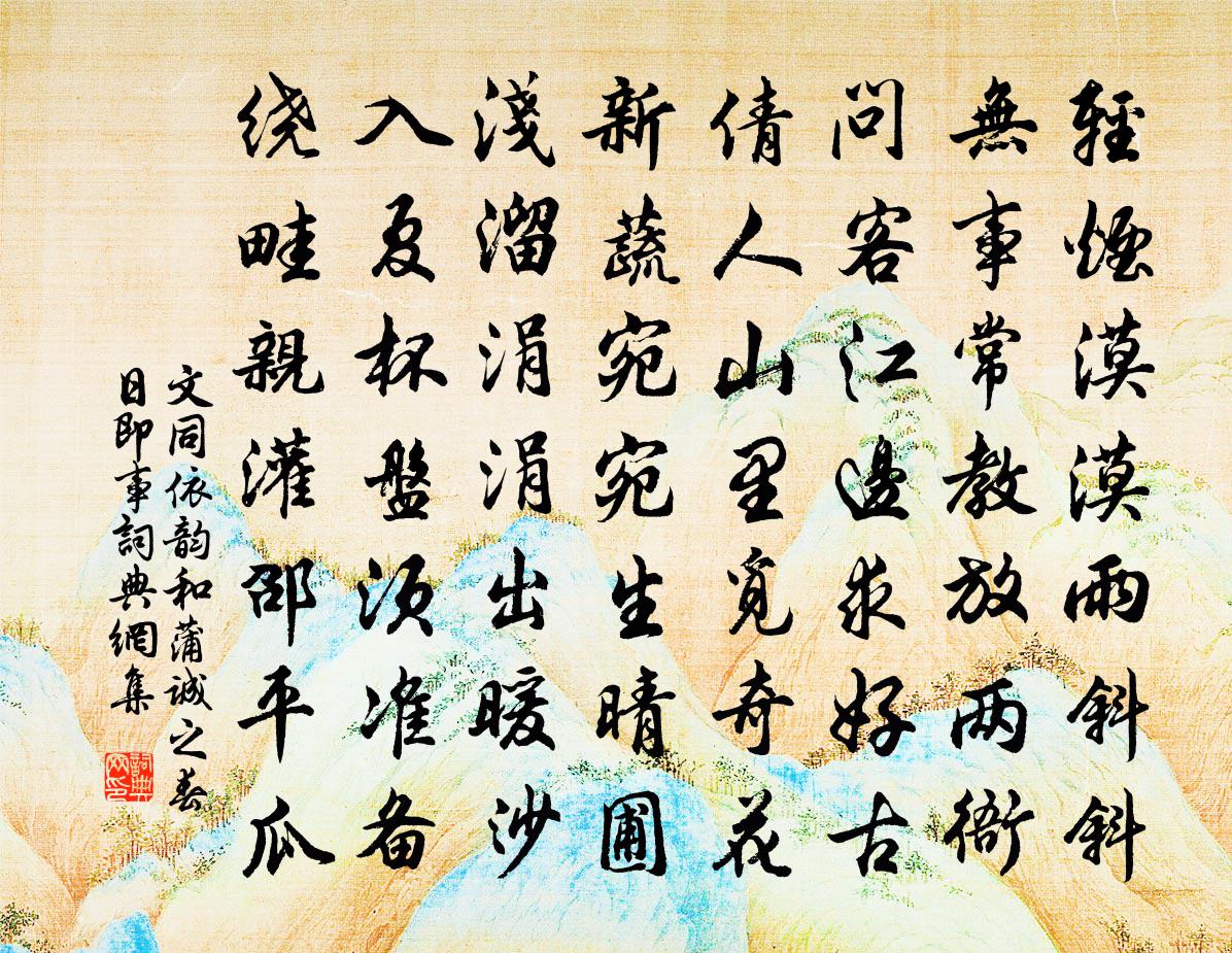 詩詞名句歷史字典書法欣賞書法字典國語詞典說文解字康熙字典古漢語字典標 題 作 者 詩 句 依韻和蒲誠之春日即事作者:文同 朝代:宋代依韻和蒲誠之春日即事原文輕煙漠漠雨斜斜,無事常教放兩衙。問客江邊求好古,倩人山里覓奇花。新蔬宛宛生晴圃,淺溜涓涓出暖沙。入夏杯盤須準備,繞畦親灌邵平瓜。詩詞問答問:依韻和蒲誠之春日即事的作者是誰?答:文同問:依韻和蒲誠之春日即事寫於哪個朝代?答:宋代文同依韻和蒲誠之春日即事書法欣賞依韻和蒲誠之春日即事書法作品詩詞推薦戊申年七夕五絕錢惟演〔宋代〕烏鵲飛來接斷雲,祇貪清淺渡星津。不知一夜支機石,卻屬乘槎上漢人。送仲卿禪德釋重顯〔宋代〕高兮竺卿,秋水虛明。夫何之象,堪雲指程,知吾不知,笑伽耶城。送石賡歸寧王安石〔宋代〕虛名誤長者,邂逅肯經過。所操十餘篇,浩蕩決江河。側身朝市間,樂少悲慚多。文章舊所好,久已廢吟喔。開編苦熱王令〔宋代〕土燥木根焦,禽窮自拔毛。龍遺赤日走,天避火雲高。虎懼千山熾,鯨憂四海熬。風微不飽腹,蟬亦為身號。堪笑方岳〔宋代〕堪笑劉安若學仙,雲中雞犬事茫然。早知官職乃如許,悔不人間差自賢。和闕乾雪中韻李曾伯〔宋代〕青女欺寒未肯霜,先將銀鑠散祥光。芙蓉曉院不禁老,檐蔔滿林惟欠香。冷入寶環銷翠羽,聲隨石鼎煮羊腸。兔園和李二秀才張耒〔宋代〕羨君年少盛遊春,顧我無聊似厄陳。東市車牛泥到領,不勞舉袂障京塵。越城步月不知子城已閉因托宿趙義齋宅董嗣杲〔宋代〕晚步初月高,忘卻子城閉。客樓枕新荷,幾夜香襲袂。羸骸奔走倦,不擬尚凝滯。白面佳少年,塞途莫勝計。低顏踏雲行 師父引馬鈺上街求乞馬鈺〔元代〕不說龜毛,無論兔角。幻軀閒想如蟬殼。怎生亦得顯金容,算來全在心知覺。志不迴環,道非遙邈。洞天白雪成紅含珠林釋鑒〔宋代〕風勁蕭蕭響,露滴個個圓。坐看西山月,渾疑墮我前。舶使王會溪太守趙見泰九日領客枉顧山中賦采蒲壽宬〔宋代〕白露零高寒,西風滿原野。濁酒嘆重持,黃花笑盈把。詩句斐莫裁,秋容浩難寫。豈為今日娛,逢之百世下。腰帶水張炎〔宋代〕犀繞魚懸事已非,水光猶自溼雲衣。山中幾日渾無雨,一夜溪痕又減圍。送崔三往密州覲省王維〔唐代〕南陌去悠悠,東郊不少留。同懷扇枕戀,獨念倚門愁。路繞天山雪,家臨海樹秋。魯連功未報,且莫蹈滄洲。夢中送僧覺而忘第三聯戲足之陳與義〔宋代〕兩鴻同一天,羽翼不相及。偶然一識面,別意已超忽。去程秋光好,萬里無斷絕。雖無仁人言,贈子以明月。贈韋七贊善杜甫〔唐代〕鄉裡衣冠不乏賢,杜陵韋曲未央前。爾家最近魁三象,時論同歸尺五天。北走關山開雨雪,南遊花柳塞雲煙。洞庭題永石屏陳宓〔宋代〕琅玕三尺重南金,風韻仍同綠綺琴。胸次便如斯壁立,千年不受一塵侵。同趙侍御巴陵早春作張說〔唐代〕江上春來早可觀,巧將春物妒餘寒。水苔共繞留鳥石,花鳥爭開鬥鴨欄。佩勝芳辰日漸暖,然燈美夜月初圓。意隨朝下過盧郎中敘舊遊李白〔唐代〕君登金華省,我入銀台門。幸遇聖明主,俱承雲雨恩。復此休浣時,閒為疇昔言。卻話山海事,宛然林壑存。明湖柴舍人金霞閣歐陽修〔宋代〕檐前洛陽道,下聽走轅聲。樹蔭春城綠,山明雪野晴。雲藏天外闕,日落柳問營。緩步應多樂,壺歌詠太平登薊城西北樓送崔著作融入都陳子昂〔唐代〕薊樓望燕國。負劍喜茲登。清規子方奏。單戟我無能。仲冬邊風急。雲漢復霜棱。慷慨竟何道。西南恨失朋。名句推薦君子有三惜:此生不學,一可惜。此日閒過,二可惜。此身一敗,三可惜。張廷玉《明史·列傳·卷四十九》 息徒蘭圃,秣馬華山。嵇康《贈秀才入軍·其十四》 憶君遙在瀟湘月,愁聽清猿夢裡長。王昌齡《送魏二》 悠悠洛陽道,此會在何年。陳子昂《春夜別友人二首·其一》 百年成之不足,一旦壞之有餘。佚名《增廣賢文·上集》 飄飄何所似,天地一沙鷗。杜甫《旅夜書懷》 嘆寄與路遙,夜雪初積。姜夔《暗香疏影》 知君獨坐青軒下,此時結念同所懷。李白《早秋單父南樓酬竇公衡》 機不密,禍先行。馮夢龍《醒世恆言·卷二十》 意少一字則義闕,句長一言則辭妨劉勰《文心雕龍·書記》