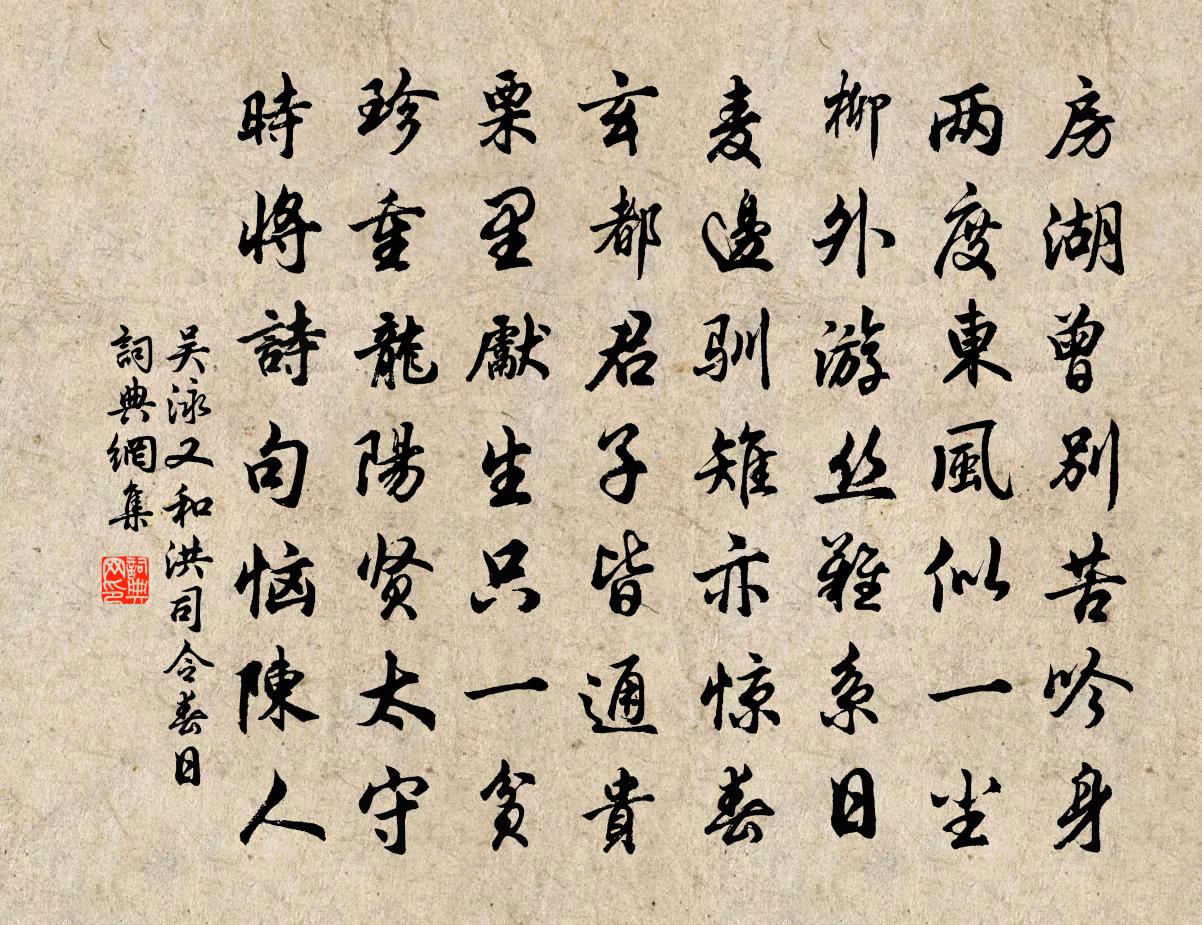 詩詞名句歷史字典書法欣賞書法字典國語詞典說文解字康熙字典古漢語字典標 題 作 者 詩 句 又和洪司令春日作者:吳泳 朝代:宋代又和洪司令春日原文房湖曾別苦吟身,兩度東風似一塵。柳外遊絲難系日,麥邊馴雉亦驚春。玄都君子皆通貴,栗里先生只一貧。珍重龍陽賢太守,時將詩句惱陳人。詩詞問答問:又和洪司令春日的作者是誰?答:吳泳問:又和洪司令春日寫於哪個朝代?答:宋代吳泳又和洪司令春日書法欣賞又和洪司令春日書法作品詩詞推薦清平樂佚名〔宋代〕阿朗去日。不道長為客。底事桐廬無處覓。卻得廣州訊息。江頭一隻蘭船。風雨湘妃廟前。死恨無情江水,送郎一送楊六望赴金水宋之問〔唐代〕借問梁山道,嶔岑幾萬重。遙州刀作字,絕壁劍為峰。惜別路窮此,留歡意不從。憂來生白髮,時晚愛青松。勿以有客自關外來頗道邊亭暴露之苦時子止兄方趨晁公溯〔宋代〕平涼歃血不濡齒,奚車轔轔臨渭水。一丸未及封函關,已復胡歌飲都市。近聞移屯集岐下,戰聲日震長平瓦。兩軍奇見華岳〔宋代〕紅牙催拍燕飛忙,一片行雲繞畫堂。眉黛蹙成遊子恨,臉紅燒故人腸。榆錢不買千金笑,柳帶何須百寶妝。舞罷隔海口官舍劉克莊〔宋代〕曉起齋中望,千家未啟扉。潮能驅海走,風欲挾人飛。煙寺鐘初定,霜林葉半稀。客身偏畏冷,著盡帶來衣。贈鄭戶部陳師道〔宋代〕千載歸來遼海東,江山如舊里閭空。時平未覺身難遇,學贍依然說不窮。著繡晝行真細事,一車磬折得深衷。聖朝鄜州懷聶之美司馬光〔宋代〕何言內外家,憂患兩如麻。別淚行三歲,思心各一涯。海邊昏霧雨,塞外慘風沙。安得雲飛術,乘空去不遐。天辰歐陽修〔宋代〕天形如車輪,晝夜常不息。三辰隨出沒,曾不差分刻。北辰居其所,帝座嚴尊極。眾星拱而環,大小各有職。不動玩鞭亭韓元吉〔宋代〕黃須鮮卑勇無策,自馳駿馬來窺賊。賊奴但怪日繞營,起看飛塵已無跡。寶鞭不惜棄道傍,坐令老嫗知興亡。百年登樓寄王卿韋應物〔唐代〕踏閣攀林恨不同,楚雲滄海思無窮。數家砧杵秋山下,一郡荊榛寒雨中。李相薨後題斷金集(一作裴夷直詩)令狐楚〔唐代〕一覽斷金集,載悲埋玉人。牙弦千古絕,珠淚萬行新。閒居雜詠三十二首改過陳淳〔宋代〕過者動之差,毋容實諸已。才覺必速改,乃不為吾累。見道邊死人(一作劉元濟詩。《統簽》併入允濟詩內)劉允濟〔唐代〕淒涼徒見日,冥寞詎知年。魂兮不可問,應為直如弦。謝王庶軻秀才見贈諸篇文同〔宋代〕覽君山中詩,多有贈我篇。感此意愛厚,使我將潸然。世態日衰薄,交道君獨全。豈若賤丈夫,心醜貌甚妍。我已魯中送從事歸滎陽韓翃〔唐代〕故園衰草帶滎波,歲晚知如君思何。輕橐歸時魯縞薄,寒衣縫處鄭綿多。萬人都督鳴騮送,百里邦君枉騎過。累路夏日江行余靖〔宋代〕解組趨宸闕,扁舟泛江練。健艫雁齊鳴,輕帆雲一片。水闊煙難收,雨昏風易轉。曲浦逗留多,修程夢魂倦。舟子夢梅趙時韶〔宋代〕夢醒春風笑一場,攬衣推枕起思量。草塘夢句有何好,夢到梅花字字香。浣溪沙·漁父蘇軾〔宋代〕西塞山邊白鷺飛,散花洲外片帆微。桃花流水鱖魚肥。自庇一身青箬笠,相隨到處綠蓑衣。斜風細雨不須歸。鄉人或病予詩多道蜀中遨樂之盛適春日游鏡湖陸游〔宋代〕湖波綠似鴨頭深,一日春晴直萬金。好事誰家斗歌舞,方舟齊榜出花陰。三寄簡叔劉克莊〔宋代〕屢有詩貽田舍翁,燈花常至夜深紅。莫嫌雲榭文書冗,稍喜冰銜職任雄。健吏安知元結事,貪夫愧死伯夷風。得君名句推薦想邊鴻孤唳,砌蛩私語。王沂孫《掃花游·秋聲》 衣不如新,人不如故。佚名《古艷歌》 資之深,則取之左右逢其原。孟子《孟子·離婁章句下·第十四節》 南風吹其心,搖搖為誰吐?王冕《墨萱圖·其一》 是他春帶愁來,春歸何處。辛棄疾《祝英台近·晚春》 寫不了相思,又蘸涼波飛去。朱彝尊《長亭怨慢·雁》 綺席象床寒玉枕,美人何處醉黃花。汪元量《望江南·幽州九日》 歡笑情如舊,蕭疏鬢已斑。韋應物《淮上喜會梁川故人 / 淮上喜會梁州故人》 問元戎早晚,鳴鞭徑去,解天山箭。元好問《水龍吟·從商帥國器獵於南陽同仲澤鼎玉賦此》 塞上長城空自許,鏡中衰鬢已先斑。陸游《書憤五首·其一》