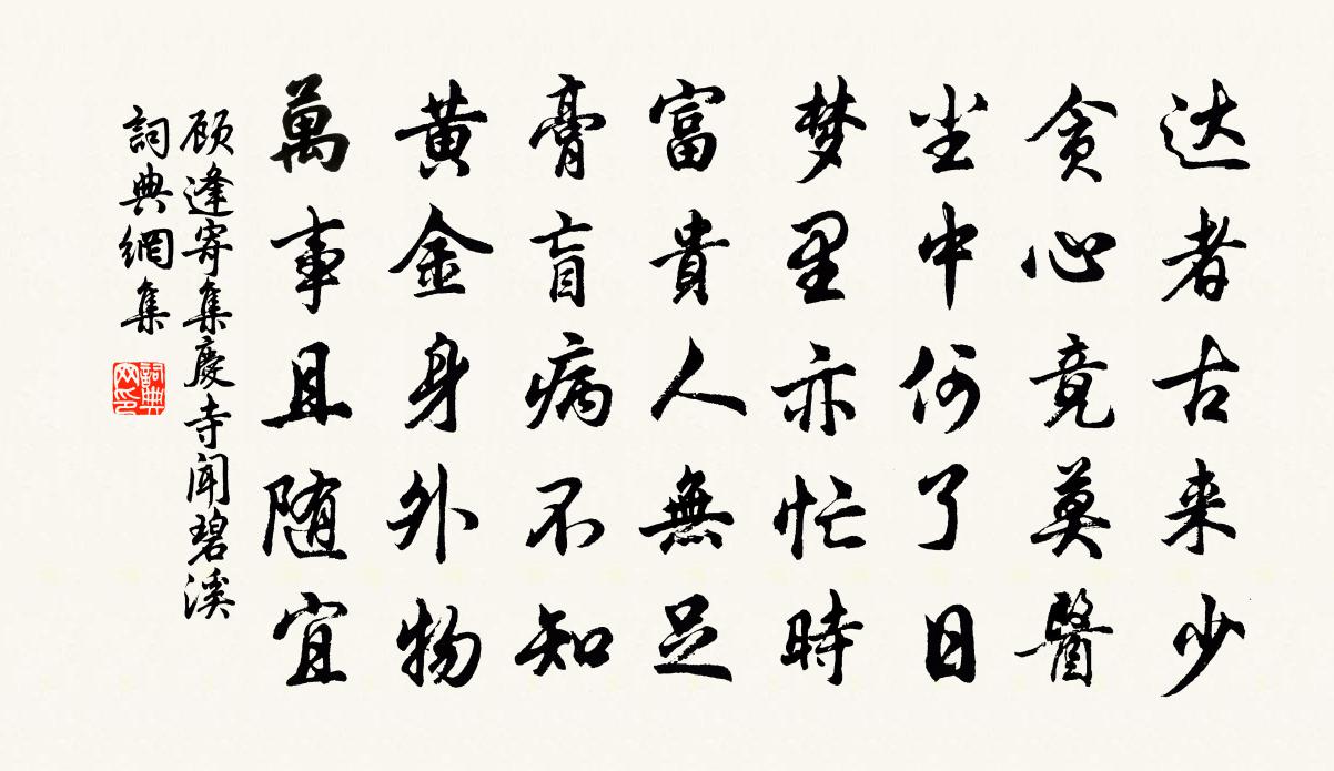 詩詞名句歷史字典書法欣賞書法字典國語詞典說文解字康熙字典古漢語字典標 題 作 者 詩 句 寄集慶寺聞碧溪作者:顧逢 朝代:宋代寄集慶寺聞碧溪原文達者古來少,貪心竟莫醫。塵中何了日,夢裡亦忙時。富貴人無足,膏盲病不知。黃金身外物,萬事且隨宜。詩詞問答問:寄集慶寺聞碧溪的作者是誰?答:顧逢問:寄集慶寺聞碧溪寫於哪個朝代?答:宋代顧逢寄集慶寺聞碧溪書法欣賞寄集慶寺聞碧溪書法作品詩詞推薦長安雜題長句六首杜牧〔唐代〕觚稜金碧照山高,萬國圭璋捧赭袍。舐筆和鉛欺賈馬,贊功論道鄙蕭曹。東南樓日珠簾卷,西北天宛玉厄豪。[詩紅梅蘇泂〔宋代〕天與清高孰我過,歲寒只合老岩阿。無端自學閒桃杏,只恐情多事亦多。過招隱寺李涉〔唐代〕每憶中林訪惠持,今來正遇早春時。自從休去無心事,唯向高僧說便知。虎跑泉蘇軾〔宋代〕亭亭石塔東峰上,此老初來百神仰。虎移泉眼趁行腳,龍作浪花供撫掌。至今遊人灌濯罷,臥聽空階環玦響。故知送人謁柳開釋正緣〔宋代〕柳牆高於花,怒飛方可至。奇哉游夏徒,吐辭作雄翅。木蘭花慢 武邑縣王楫善居室,母俎氏出隆平王惲〔元代〕精彩如五六十人。教授馬君向予方以善俗任責楫之孝養致樂,實有關於風化者,故作是詞以付,俾來者庶有所勸焉次韻小閣陳造〔宋代〕聞道委蛇地,金虬自炷香。心雖便靜默,時恐後騫翔。物外貯春色,人間占夜樂。定誰傳句法,俗骨點玄霜。游雲頂山晚望貫休〔唐代〕雲頂聊一望,山靈草木奇。黔南在何處,堪笑復堪悲。菊歇香未歇,露繁蟬不飢。明朝又西去,錦水與峨眉。送沈先輩歸送上嘉禮(一作送沈光及第後東歸兼赴嘉禮)羅隱〔唐代〕青青月桂觸人香,白薴衫輕稱沈郎。好繼馬卿歸故里,況聞山簡在襄陽。杯傾別岸應須醉,花傍徵車漸欲芳。擬把病起荊江亭即事十首黃庭堅〔宋代〕張子耽酒語蹇吃,聞道潁州又陳州。形模彌勒一布袋,文字江河萬古流。送阮子俊歸池陽陳著〔宋代〕袖攜諸老義門詩,燁燁精神起病衰。千里遠來風教地,一言不及浪遊私。山家飯粟論交淡,驛路逢梅信步遲。古道江城子·西城楊柳弄春柔秦觀〔宋代〕西城楊柳弄春柔,動離憂,淚難收。猶記多情、曾為系歸舟。碧野朱橋當日事,人不見,水空流。韶華不為少年留折縣道中二首孔武仲〔宋代〕柳堤桃塢未怡融,浣濯新梢上淺紅。一段春光來逼眼,棗騮嘶入柏林中。李處士郊居皮日休〔唐代〕石衣如發小溪清,溪上柴門架樹成。園裡水流澆竹響,窗中人靜下棋聲。幾多狎鳥皆諳性,無限幽花未得名。滿引吏隱宜春郡詩十首祖無擇〔宋代〕吏隱宜春郡,放懷詩酒間。未能慙下俚,幾欲郊中山。杜甫籓籬窄,劉伶幕帟慳。高吟與沈醉,榮辱詎相關。汲東山下井陸游〔宋代〕從來耽酒須微祿,絕祿三年酒盞疏。百尺轆轤新浚井,一杯聊慰渴相如。思齊佚名〔先秦〕思齊大任,文王之母,思媚周姜,京室之婦。大姒嗣徽音,則百斯男。惠於宗公,神罔時怨,神罔時恫。刑於寡妻謁廟馬上有感歐陽修〔宋代〕旌旆曉悠悠,行驚歲已遒。霜雲依日薄,野水帶冰流。富庶齊三服,山川禹九州。自憐思潁意,無異旅人愁。扇謝枋得〔宋代〕蒲葵也解歸掌握,紈素未應捐篋中。莫把暗塵涴明月,好驅大暑來清風。題耕織圖二十四首奉懿旨撰趙孟頫〔元代〕農家值豐年,樂事日熙熙。黑黍可釀酒,在牢羊豕肥。東鄰有一女,西鄰有一兒。兒年十五六,女大亦可笄。財禮名句推薦舉善從諫,在上之明規; 進賢謁言,為臣之令范。姚思廉《陳書·本紀·卷五》 水漲魚天拍柳橋。雲鳩拖雨過江皋。周邦彥《浣溪沙·水漲魚天拍柳橋》 風乍暖,日初長,裊垂楊。陳子龍《訴衷情·春遊》 拜迎長官心欲碎,鞭撻黎庶令人悲。高適《封丘作》 異鄉物態與人殊,惟有東風舊相識歐陽修《春日西湖寄謝法曹歌》 牽牛織女遙相望,爾獨何辜限河梁。曹丕《燕歌行二首·其一》 成敗相因,理不常泰李大師、李延壽《南史·本紀·卷一》 五月五日午,贈我一枝艾。文天祥《端午即事》 江流石不轉,遺恨失吞吳。杜甫《八陣圖》 君子有三樂,而王天下不與存焉。孟子《孟子·盡心章句上·第二十節》