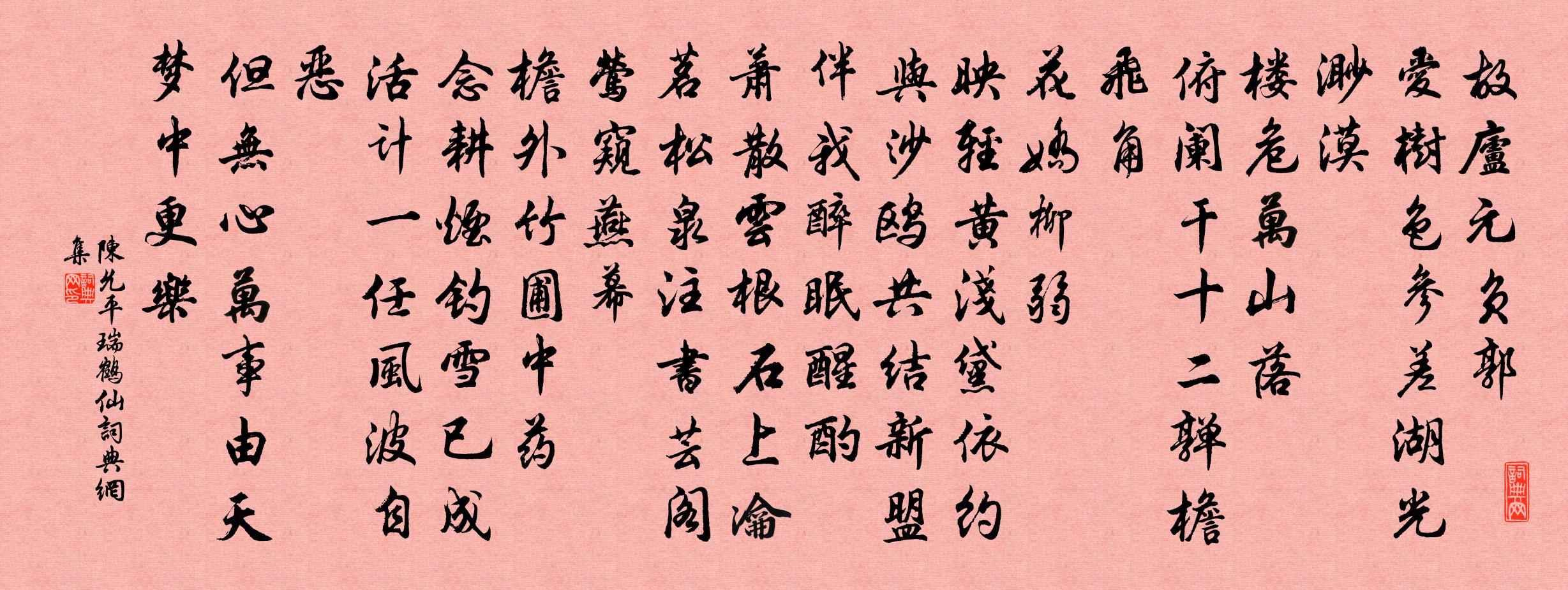 詩詞名句歷史字典書法欣賞書法字典國語詞典說文解字康熙字典古漢語字典標 題 作 者 詩 句 瑞鶴仙作者:陳允平 朝代:宋代瑞鶴仙原文故廬元負郭。愛樹色參差,湖光渺漠。樓危萬山落。俯闌乾十二,嚲檐飛角。花嬌柳弱。映輕黃、淺黛依約。與沙鷗、共結新盟,伴我醉眠醒酌。蕭散雲根石上,瀹茗松泉,注書芸閣。鶯窺燕幕。檐外竹、圃中藥。念耕煙釣雪,已成活計,一任風波自惡。但無心、萬事由天,夢中更樂。詩詞問答問:瑞鶴仙的作者是誰?答:陳允平問:瑞鶴仙寫於哪個朝代?答:宋代問:瑞鶴仙是什麼體裁?答:詞陳允平瑞鶴仙書法欣賞瑞鶴仙書法作品詩詞推薦晚晴仇遠〔宋代〕濃雲忽雨散秋聲,屋壁斜捎溝澮盈。一陣西南風截斷,月華且讓夕陽明。寄陸子靜先生朱桴〔宋代〕此理於人無間然,昏明何事異天淵。自從斷卻閒牽引,俯引周旋只事天。句鄭會〔宋代〕君未知人窮相事。絲瓜杜汝能〔宋代〕寂寥籬戶入泉聲,不見山容亦自清。數日雨晴秋草長,絲瓜沿上瓦牆生。孟子王霸陳普〔宋代〕德誠已有奚容力,假偽非由力莫為。若使桓文居萬里,不知功效竟何施。和楊教授張栻〔宋代〕道在無今昔,才難有屈伸。青編知了意,白眼付時人。鏡里顏容舊,胸中事業新。絕嘆知味鮮。渠自說甘辛。初秋普明寺竹林小飲餞梅聖俞分韻得亭皋木葉歐陽修〔宋代〕野水竹間清,秋山酒中綠。送子此酣歌,淮南應落木。寄小兒李覯〔宋代〕兩世煢煢各一人,生來且喜事精神。欲教齠齔從師學,祗恐文章誤爾身。但有犁鋤終得飽,莫看紈綺便嫌貧。不知送人之官嚴陵周文璞〔宋代〕如君風貌又精神,自合拖紳近紫宸。平地有心開洞穴,十年無俸著閒身。已看青舫垂垂去,須憶緋桃灩灩春。若向及第謝恩徐元傑〔宋代〕聖朝天子薦臨軒,嘉與愚臣究本原。天地兩間拊景運,唐虞三代印微言。慙無一德酬清問,猥玷初班誤聖恩。一節河瀆神溫庭筠〔唐代〕孤廟對寒潮,西陵風雨蕭蕭。謝娘惆悵倚蘭橈,淚流玉箸千條。暮天愁聽思歸樂,早梅香滿山郭。回首兩情蕭索,吳樵溪山居柴望〔宋代〕老子無家計,蕭然屋數間。頭邊惟白髮,眼底是青山。棋急鳥聲散,琴低鶴睡閒。片雲長似伴,朝去暮飛還。到平江遇雨次日見元鼎揚丈陳藻〔宋代〕此來便擬見揚雄,席帽那堪走雨中。漫刺修成還自袖,高門許入不能通。姓名多謝曾相問,糧屨從今未解窮。孟子經隱岩舊居(一作懷舊遊)張喬〔唐代〕夜久村落靜,徘徊楊柳津。青山猶有路,明月已無人。夢寐空前事,星霜倦此身。嘗期結茅處,來往躡遺塵。摸魚兒劉辰翁〔宋代〕三百年、人間天上,遽如許、遽如許。落花寒食東風雨,漠漠長陵抔土。魂歸否。怕些不分明,又墮人箋疏。且無十二時/憶少年佚名〔宋代〕雕戈偃玉塞清明。道德洽和平。龜疇鳳柙,騰實飛英。岱畎讓功成。汾水上、寅輅鑾聲。薦精誠。仙宇玉為京。圭謁金門·春欲去施紹莘〔明代〕春欲去,如夢一庭空絮。牆裡鞦韆人笑語,花飛撩亂處。無計可留春住,只有斷腸詩句。萬種消魂多寄與:斜陽天何斯舉惠酒張耒〔宋代〕孟夏飲燒酒,窮居莫致之。扣門聞好語,出應自披衣。雙榼儼在門,使者前致詞。斂衽受嘉貺,敬此旨且時。且喜晚眺 其一王冕〔元代〕密樹連江暗,殘陽隔浦明。不知秦塞遠,殊覺楚天平。故國人何在?荒城鳥亂鳴。徘徊吟未已,搔首忽傷神。過城南僧院姚合〔唐代〕寺對遠山起,幽居仍是師。斜陽通暗隙,殘雪落疏籬。松靜鶴棲定,廊虛鍾盡遲。朝朝趨府吏,來此是相宜。名句推薦聞道梅花坼曉風,雪堆遍滿四山中。陸游《梅花絕句》 西北望長安,可憐無數山辛棄疾《菩薩蠻·書江西造口壁》 兩岸人家微雨後,收紅豆,樹底纖纖抬素手。歐陽炯《南鄉子·路入南中》 君子之於子,愛之而勿面,使之而勿視,道之以道而勿強。荀子《荀子·大略》 還將兩行淚,遙寄海西頭。孟浩然《宿桐廬江寄廣陵舊遊》 驛寄梅花,魚傳尺素。秦觀《踏莎行·郴州旅舍》 我亦且如常日醉,莫教弦管作離聲。歐陽修《別滁》 貞女貴徇夫,捨生亦如此。孟郊《列女操 / 烈女操》 一番荷芰生池沼,檻前風送馨香。尹鶚《臨江仙·一番荷芰生池沼》 戰戰慄栗,日慎一日,苟慎其道,天下可有。韓非及後人《韓非子·初見秦》