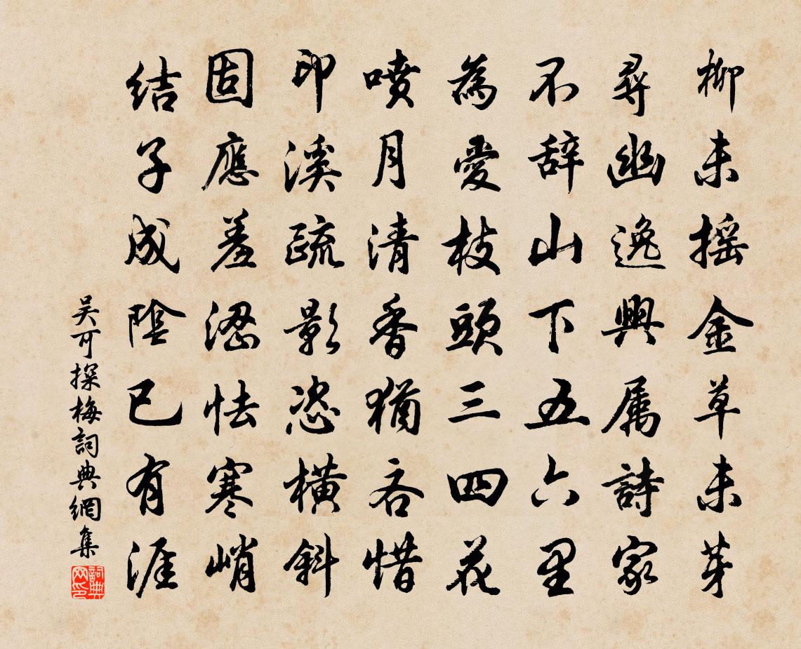 詩詞名句歷史字典書法欣賞書法字典國語詞典說文解字康熙字典古漢語字典標 題 作 者 詩 句 探梅作者:吳可 朝代:宋代探梅原文柳未搖金草未芽,尋幽逸興屬詩家。不辭山下五六里,為愛枝頭三四花。噴月清香猶吝惜,印溪疏影恣橫斜。固應羞澀怯寒峭,結子成陰已有涯。詩詞問答問:探梅的作者是誰?答:吳可問:探梅寫於哪個朝代?答:宋代吳可探梅書法欣賞探梅書法作品詩詞推薦梅花引朱雍〔宋代〕梅亭別。梅亭別。梅亭回首都如雪。粉融融。月濛濛。月上小車,歸去小樓空。當時曾傅新妝薄。而今一任花零落賦得泛泛水中鳧詩江總〔隋代〕歸鳧沸卉同。亂下芳塘中。出沒時銜藻。飛鳴忽揚風。浮深或不息。戲廣若乘空。春鸚徒有賦。還笑在金籠。雨夜讀陸放翁集樂雷發〔宋代〕爐冷童吹火,山房夜黯然。濕薪添茭爇,苦茗帶芎煎。燈暗瀟江雨,詩吟笠澤煙。老仙何處去,搔首跺塵編。安樂窩中吟邵雍〔宋代〕生為男子偶昌辰,安樂窩中富貴身。大字寫詩夸壯健,小杯飲酒惜輕醇。山川澄淨初經雨,草木暄妍正遇春。造化送潘景純王安石〔宋代〕東都曾以一當千,場屋聲名十五年。晚賜綠衣隨宦牒,始操丹筆事戎旃。明時正欲精搜選,榮路何當力薦延。賴有送袁偁盧綸〔唐代〕諫獵名空久,多因病與貧。買書行幾市,帶雨別何人。客路山連水,軍州日映塵。淒涼一分手,俱恨老相親。酬岑勛見尋就元丹丘對酒相待以詩見招。李白〔唐代〕黃鶴東南來,寄書寫心曲。倚鬆開其緘,憶我腸斷續。不以千里遙,命駕來相招。中逢元丹丘,登嶺宴碧霄。對酒守居園池雜題荻浦文同〔宋代〕枯荻饊霜風,暮寒聲索索。無限有微禽,捉之宿如客。用宇文龍圖韻贈龍華印老李流謙〔宋代〕少年一口吸西江,聖處端能走季鹹。淨觀清冷橫一水,遠懷孤秀揖千岩。溪雲臥久看頻度,山日談余訝半銜。便欲南鄉子沈唐〔宋代〕朝觀俯堯階。寵拜新恩天上回。歡動邊城十萬戶,民懷。榮見旌旗卻再來。清曉敞鈴齋,庭下鳴鼉綺宴開。紅袖兩江南弄 龍笛曲蕭衍〔南北朝〕美人綿眇在雲堂。雕金鏤竹眠玉床。婉愛寥亮繞紅梁。繞紅梁。流月台。駐狂風。郁徘徊。送湯子才晁公溯〔宋代〕江湖此去水連空,萬賈連檣浩渺中。帆影浸斜青草月,笛聲吹盡碧蘆風。未論魏闕功名錠,不與巴山氣象同。更到正月十六日雪趙蕃〔宋代〕竹屋偏宜雪,江亭更受風。一杯時自酌,五字不須工。柳色全然未,梅花半墮空。東江雖可住,吾志在江東。次韓無咎途中寄陸務觀章甫〔宋代〕園筍看成竹,庭榴已著花。老來猶是客,歸去亦無家。萬事大槐國,一身焦谷芽。心閒聊默坐,紅日下天涯。次韻劉元煇喜予還家攜酒見訪三首方回〔宋代〕白紵烏紗巾,久不見此客。眉長耳有毫,眸子秋水碧。惠然顧柴門,坐對山氣夕。荒蕪淵明徑,寂寞子云宅。攜酒紹興親享明堂二十六首佚名〔宋代〕皇皇后帝,周覽四方。眷我前烈,燕娭此堂。金支秀髮,黼帳高張。世歆明祀,日宋是常。龍鬚道中周必大〔宋代〕客勞田頭餉,渠憐馬上郎。作勞並罄控,未用別閒忙。先天易吟三十首方回〔宋代〕天地有定位,地天陽泰三。更於通氣處,細認澤山鹹。暮春滻水送別 / 一作暮春送客韓琮〔唐代〕綠暗紅稀出鳳城,暮雲樓閣古今情。行人莫聽官前水,流盡年光是此聲。三奠子 辛卯七月,時久雨未霽,中以感寓為王惲〔元代〕湛新秋風露,曖曖微霄。梧葉下,桂香飄。鵲翻銀漢水,人渡玉蘭橋。歡能幾,虹影斷,渚宮遙。人閒多巧,天上名句推薦彼此當年少,莫負好時光。李隆基《好時光·寶髻偏宜宮樣》 龍蛇四海歸無所,寒食年年愴客心。屈大均《壬戌清明作》 萬頃風濤不記蘇。雪晴江上麥千車。蘇軾《浣溪沙·萬頃風濤不記蘇》 傷心莫語,記那日旗亭,水嬉散盡,中酒阻風去。納蘭性德《摸魚兒·午日雨眺》 何時更杯酒,再得論心胸。李白《魏郡別蘇明府因北游》 我來圯橋上,懷古欽英風。李白《經下邳圯橋懷張子房》 人煙寒橘柚,秋色老梧桐。李白《秋登宣城謝朓北樓》 上不失天時,下不失地利,中得人和,而百事不廢。荀子《荀子·王霸》 花開不並百花叢,獨立疏籬趣未窮。鄭思肖《畫菊》 大樹底下好遮陰張南莊《何典·第十回》