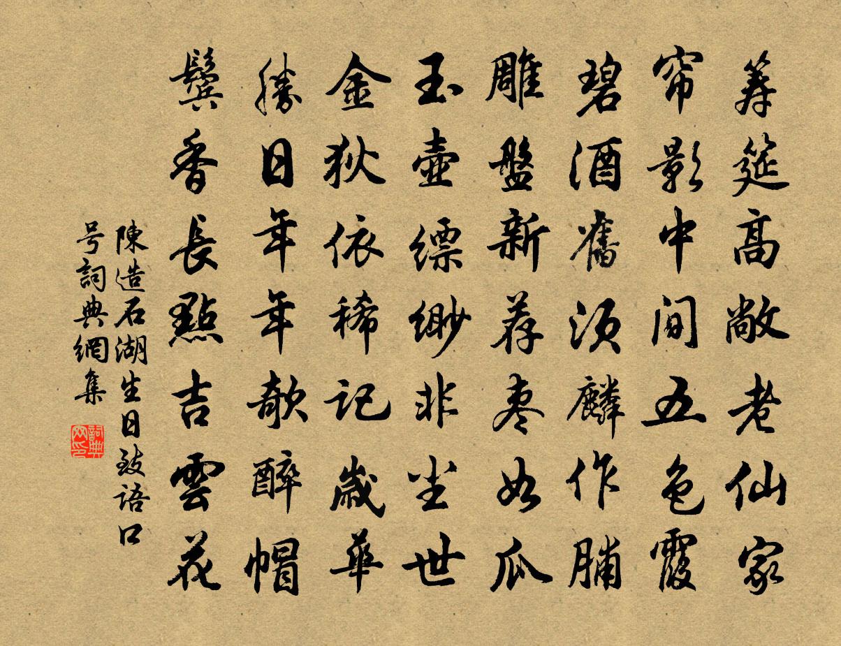 詩詞名句歷史字典書法欣賞書法字典國語詞典說文解字康熙字典古漢語字典標 題 作 者 詩 句 石湖生日致語口號作者:陳造 朝代:宋代石湖生日致語口號原文籌筵高敞老仙家,簾影中間五色霞。碧酒舊須麟作脯,雕盤新薦棗如瓜。玉壺縹緲非塵世,金狄依稀記歲華。勝日年年欹醉帽,鬢香長點吉雲花。詩詞問答問:石湖生日致語口號的作者是誰?答:陳造問:石湖生日致語口號寫於哪個朝代?答:宋代陳造石湖生日致語口號書法欣賞石湖生日致語口號書法作品詩詞推薦次韻彥遠相州道中二首晁補之〔宋代〕朝入一幾縱,暮入一幾橫。黃卷值昔人,歡與相逢迎。孫子謝口語,阮生勞目睛。登亦豈必喑,籍猶未能盲。學非范儀下第東歸楊億〔宋代〕君住武夷鄉,思歸便促裝。溪鱗絲縷細,園茗露牙香。雷火悲三上,金錢困一囊。長纓塵土滿,會待濯淪浪。夢尋西山準上人錢起〔唐代〕別處秋泉聲,至今猶在耳。何嘗夢魂去,不見雪山子。新月隔林時,千峰翠微里。言忘心更寂,跡滅雲自起。覺來菩薩蠻張孝祥〔宋代〕雪消牆角收燈後。野梅官柳春全透。池閣又東風。燭花燒夜紅。一尊留好客。敧盡闌乾月。已醉不須歸。試聽烏夜草鞋歌釋梵琮〔宋代〕村里人,有意知,就手織成最容易。長短大小在目前,密用工夫多快利。草窠裡面跳出來,結卻繩頭有巴鼻。牢束太湖館送殷秀才赴舉皎然〔唐代〕春風洞庭路,搖盪暮天多。衰疾見芳草,別離傷遠波。詩名推首薦,賦甲擬前科。數日聞天府,山衣制芰荷。傳言玉女姬翼〔元代〕覿面相逢,一顧眼中人識。會心冥處,遙山寸碧。洞天雲影,磊落翠岩蟠石。芝莫好在,幾經秋色。淺淺蓬瀛,談浣溪沙(韓彥古)韓彥古〔宋代〕一縷金香永夜清。殘編未掩古琴橫。繡衾寒擁寶缺明。坐聽竹風敲石磴,旋傾花水漱春酲。落梅和雨打簾聲。題僧房雙桐李頎〔唐代〕青桐雙拂日,傍帶凌霄花。綠葉傳僧磬,清陰潤井華。誰能事音律,焦尾蔡邕家。雜感六首黎廷瑞〔宋代〕孫子傳世世,木石窮年年。太行亦可移,滄海終欲填。入聖諒非難,懼君心不怪。滿江紅(同襄陽帥泛湖)劉過〔宋代〕獵獵風蒲,畫船轉、碧灣沙浦。都不是、蓼汀桃岸,橘洲梅渚。指點山公騎馬地,經是羊祜登山處。悄一如、人在宿西山修下元齋詠於鵠〔唐代〕幽人在何處,松檜深冥冥。西峰望紫雲,知處安期生。沐浴溪水曖,新衣禮仙名。脫屐入靜堂,繞像隨禮行。碧紗太府寺梅花盛開和曾玉堂韻二首李曾伯〔宋代〕蕭蕭官舍自寒芳,清夢何從至玉堂。唱徹涼州太催逼,何如鐵石廣平腸。贈朋詩魏朋妻〔唐代〕孤墳臨清江,每睹白日晚。松影搖長風,蟾光落岩甸。故鄉千里余,親戚罕相見。望望空雲山,哀哀淚如霰。恨為病中散步六絕岳珂〔宋代〕絕憐倦翼晚風高,解枼歸來得故巢。物態隨人也歡喜,遊絲不住舞蠨蛸。雜詠一百首荀陳劉克莊〔宋代〕彧作操謀主,群為丕上公。暮年翻有愧,膝上與車中。洞仙歌范成大〔宋代〕碧城風物,有湖中天地。長笑羲娥不停軌。記蟠桃枝上,金母嗔嘗,回首處,還又三千歲矣。料仙人拊頂,曾授長偈頌一百二十三首釋普度〔宋代〕落葉飄飄,秋江清淺。烈士相逢,干戈不殿。言多去,道轉遠。和判官喜雨李建勛〔唐代〕去禱山川尚未還,雲雷尋作遠聲寒。人情便似秋登悅,天色休勞夜起看。高檻氣濃藏柳郭,小庭流擁沒花壇。須知還諸君唱和雪詩次韻二首晁說之〔宋代〕胸中磈磥若為平,今日相如雪賦成。廣野喜逢三得白,高山真遇四邊明。瑤音顧我何能和,玉色煩君幾見傾。形穢名句推薦借問江潮與海水,何似君情與妾心?白居易《浪淘沙·借問江潮與海水》 女媧鍊石補天處,石破天驚逗秋雨。李賀《李憑箜篌引》 春日遲遲春草綠,野棠開盡飄香玉。李洞《繡嶺宮詞》 深山畢竟藏猛虎,大海終須納細流。佚名《增廣賢文·上集》 笙歌散盡遊人去,始覺春空。歐陽修《採桑子·群芳過後西湖好》 空山不見人,但聞人語響。王維《鹿柴》 不是冤家不聚頭,冤家相聚幾時休?馮夢龍《警世通言·卷二》 軍中無戲言羅貫中《三國演義·第二十五回》 謂女子,先生為姊,後生為妹。佚名《爾雅·釋親》 孤之有孔明,猶魚之有水也。陳壽《隆中對》