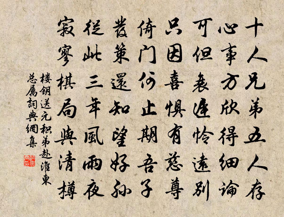 詩詞名句歷史字典書法欣賞書法字典國語詞典說文解字康熙字典古漢語字典標 題 作 者 詩 句 送元積弟赴淮東總屬作者:樓鑰 朝代:宋代送元積弟赴淮東總屬原文十人兄弟五人存,心事方欣得細論。可但衰遲憐遠別,只因喜懼有慈尊。倚門何止期吾子,發策還知望好孫。從此三年風雨夜,寂寥棋局與清樽。詩詞問答問:送元積弟赴淮東總屬的作者是誰?答:樓鑰問:送元積弟赴淮東總屬寫於哪個朝代?答:宋代樓鑰送元積弟赴淮東總屬書法欣賞送元積弟赴淮東總屬書法作品詩詞推薦赤松觀趙肅遠〔宋代〕入門蒼翠合,地暖不知冬。羊化屋頭石,鶴歸山下松。溪清雲影動,碑老蘚痕封。帝者師何在,清游未許從。寄廣東提乾田子真曾豐〔宋代〕初悔投身落海涯,擁車猶幸襲蹤來。畏途機械鹿{左豸右區}虎,晏歲風霜松竹梅。分首二年眉慣郁,舉頭千里眼祖龍行常楚老〔唐代〕黑雲兵氣射天裂,壯士朝眠夢冤結。祖龍一夜死沙丘,胡亥空隨鮑魚轍。腐肉偷生三千里,偽書先賜扶蘇死。墓接賦得聽邊鴻白居易〔唐代〕驚風吹起塞鴻群,半拂平沙半入雲。為問昭君月下聽,何如蘇武雪中聞?季夏宿省前董家樓曾豐〔宋代〕明朝從伏末,今日幸秋初。御閣斜陽里,天溝小雨余。風吹塵陌靜,月照堊窗虛。一枕三更夢,清涼意自如。釣台李廌〔宋代〕此地有天險,雙台千仞岡。眼寬知世窄,望極使神傷。慘澹諸峰立,縈紆一水長。振衣懷古罷,新句入陽斜。春望杜甫〔唐代〕國破山河在,城春草木深。感時花濺淚,恨別鳥驚心。烽火連三月,家書抵萬金。白頭搔更短,渾欲不勝簪。賦得玉水記方流王鑑〔唐代〕玉潤在中洲,光臨碕岸幽。氤氳冥瑞影,演漾度方流。乍似輕漣合,還疑駭浪收。夤緣知有異,洞徹信無儔。比德兌女余最小孫也慧而夭悼以六言二首劉克莊〔宋代〕性慧於靈照女,年小似善財童。急急之符奪汝,琅琅之音惱翁。贈墨士程雲翁許月卿〔宋代〕滿地干戈正擾攘,君家猶自搗龍香。輕清披就煙雲質,堅勁磨來金玉相。倚馬喜資揮露布,飛鸞端藉發天章。山屋山中月夜張嵲〔宋代〕中原群盜幾時平,避地荒山萬慮驚。霜月有情凝夜色,溪流無盡落寒聲。滿山林影龍蛇動,繞屋風枝劍佩鳴。自惜置酒北郊外送張真甫還什邡晁公溯〔宋代〕高木已在望,不妨寬作程。相看愁饌徹,未用遽杯行。春暖姜肱被,川平雍齒城。遙知喜公至,雞犬亦歡迎。張仲謨許送河鯉未至戲督以詩黃庭堅〔宋代〕浮蛆琰琰動春醅,張仲臨津許鱠材。鹽豉欲催蓴菜熟,霜鱗未貫柳條來。日晴魚網應曾曬,風軟河冰必暫開。莫誤夜歸王令〔宋代〕沖沖行路自多岐,已踏歸途尚慮非。迄犬只知人是盜,不知人亦夜來歸。遠公墓靈澈〔唐代〕古墓石稜稜,寒雲晚景凝。空悲虎溪月,不見雁門僧。疏山塔釋紹曇〔宋代〕活被人埋汝水濆,新豐一曲杳無聞。可憐嬌舞曹家女,不嫁春風嫁白雲。次韻葉秀實縣治環翠亭陳棣〔宋代〕亭高望遠破天慳,萬疊晴嵐俯仰間。著屐好追靈運逸,垂簾尤愛愷之閒。詩豪會見揮銀筆,酒聖端能倒玉山。杖履奉和竟陵王經劉瓛墓詩沈約〔南北朝〕表閭欽逸軌。軾墓禮真魂。化塗終眇默。神理曖猶存。塵經未輟幌。高衡已委門。日蕪子云舍。徒望董生園。華陰梅釋行海〔宋代〕竹友當年已化龍,松朋久亦受秦封。此花有味調無鼎,且吐芳心過一冬。春晚書村落閒事陸游〔宋代〕千古會稽城,閭閻樂太平。豐年觀米價,霽色聽禽聲。俗儉憎浮侈,民淳力釣耕。豳詩有七月,字字要躬行。名句推薦靜言庸違,像恭滔天。佚名《尚書·虞書·堯典》 永豐柳,無人盡日飛花雪。張先《千秋歲·數聲鶗鴂》 行善不以為名,而名從之;名不與利期,而利歸之;利不與爭期,而爭及之:故君子必慎為善。列子及其弟子《列子·說符》 漢女輸橦布,巴人訟芋田。王維《送梓州李使君》 素衣莫起風塵嘆,猶及清明可到家。陸游《臨安春雨初霽》 天涯倚樓新恨,楊柳幾絲碧。晏幾道《六么令·雪殘風信》 獨眠林下夢魂好,回首人間憂患長。蘇軾《捕蝗至浮雲嶺山行疲苶有懷子由弟二首·其二》 君似孤云何處歸,我似離群雁。周紫芝《卜運算元·席上送王彥猷》 篤志而體,君子也。荀子《荀子·修身》 顧此耿耿存,仰視浮雲白。文天祥《正氣歌》