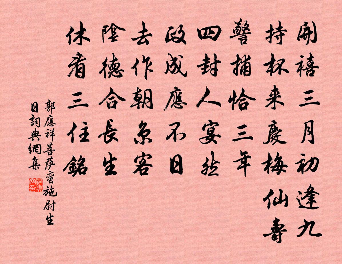 詩詞名句歷史字典書法欣賞書法字典國語詞典說文解字康熙字典古漢語字典標 題 作 者 詩 句 菩薩蠻(施尉生日)作者:郭應祥 朝代:宋代菩薩蠻(施尉生日)原文開禧三月初逢九。持杯來慶梅仙壽。警捕恰三年。四封人宴然。政成應不日。去作朝京客。陰德合長生。休看三住銘。詩詞問答問:菩薩蠻(施尉生日)的作者是誰?答:郭應祥問:菩薩蠻(施尉生日)寫於哪個朝代?答:宋代問:菩薩蠻(施尉生日)是什麼體裁?答:詞郭應祥菩薩蠻(施尉生日)書法欣賞菩薩蠻(施尉生日)書法作品詩詞推薦寫意二首牟融〔唐代〕寂寥琴荒館閉閒琴門,苔徑琴陰陰屐少痕。白髮顛狂塵夢斷,青氈泠落客心存。高山流水琴三弄,明月清風琴一樽露荷王鎡〔宋代〕滿湖雲氣曉生寒,蘸影蒸香潤石闌。萬斛銀珠無用處,翠盤擎到日光乾。偈頌二十一首釋智愚〔宋代〕乾坤之內,宇宙之間,中有一寶,秘在形山。南平驛寇準〔宋代〕心隨流水還鄉國,身向青山上屈盤。秋夢不成秋雨細,西風一夜客亭寒。聽子規有感潘璵〔宋代〕客邊聽了規,忍見百花飛。喚得春先去,如何汝未歸。蜀山仍舊在,世事覺今非。只合三緘口,空林伴夕暉。四和二首劉克莊〔宋代〕夢魂久不到清朝,縱遣巫鹹未易招。塞北今惟一韋叡,江南前此幾陳喬。扶顛個個無長策,徘悶時時引大瓢。它日挽故知容州朝請陶公危彪〔宋代〕世態紛紛等觸蠻,惟公打透利名關。八州不作士衡夢,三徑謾為元亮還。苦淡平生安北巷,孤高一節照西山。想應題翠蛟羅相〔宋代〕坡仙已跨老鯨去,夭矯一蛟留翠岑。頭角要歸滄海闊,鬐鱗聊舞小亭陰。停杯欲共馮夷語,倚杖不知嵐氣深。休用賀新郎(錢郭府判趨朝)徐鹿卿〔宋代〕解組輕千里。趁朝來、風高氣爽,波平如砥。試問餘恩深幾許,江闊秋清無底。看兩徑、棠陰舞翠。明月歸艎輕似偈傾一百三十三首釋法薰〔宋代〕指天指地,小兒子戲。無可殷勤,澆杓惡水。採蓮舞史浩〔宋代〕草軟沙平風掠岸。青蓑一釣煙江畔。荷葉為裀花作幔。知誰伴。醇醪只把鱸魚換。盤縷銀絲杯自暖。篷窗醉著無人奉和扈從溫泉宮承恩賜浴蔡希周〔唐代〕天行雲從指驪宮,浴日餘波錫詔同。彩殿氤氳擁香溜,紗窗宛轉閉和風。來將蘭氣沖皇澤,去引星文捧碧空。自憐同王子和過張氏小園吳則禮〔宋代〕永夏追涼得午陰,扶藜仍有小叢林。應憐老子腰腳健,可是禪房花木深。捲簾高竹與佳色,隱几黃鸝供好凌晨。更旅感杜荀鶴〔唐代〕白髮根叢出,鑷頻愁不開。自憐空老去,誰信苦吟來?客路東西闊,家山早晚回。翻思釣魚處,一雨一層苔。韓退之廟林概〔宋代〕退之皆負□□志,作邑當年來此中。謾道陽山是窮處,先生於道未嘗窮。不睡四首楊萬里〔宋代〕夜永無眠非為茶,無風燈影自橫斜。擁禂仰面書帷薄,數盡承塵一簟花。山中小雨得宇文使君簡問嘗見張僊翁乎戲作一陸游〔宋代〕張僊挾彈知何往,清嘯穿林但可聞。拾得鐵丸無處用,為君打散四山雲。江上阻風鄭谷〔唐代〕水天春暗暮寒濃,船閉篷窗細雨中。聞道漁家酒初熟,晚來翻喜打頭風。紅藤杖(杖出南蠻)白居易〔唐代〕南詔紅藤杖,西江白首人。時時攜步月,處處把尋春。勁健孤莖直,疏圓六節勻。火山生處遠,瀘水洗來新。粗細石塘感舊十絕劉克莊〔宋代〕禪學年來亦自衰,大叢林屬小闍梨。寒翁庵子如蝸殻,卻有彌天釋住持。名句推薦若問相思甚了期,除非相見時。晏幾道《長相思·長相思》 香爐初上日,瀑水噴成虹。孟浩然《彭蠡湖中望廬山》 無執滯心,才是通方士;有做作氣,便非本色人。王永彬《圍爐夜話·第八六則》 縱被無情棄,不能羞。韋莊《思帝鄉·春日游》 林花謝了春紅,太匆匆。無奈朝來寒雨晚來風。李煜《相見歡·林花謝了春紅》 野曠天低樹,江清月近人。孟浩然《宿建德江》 彼此當年少,莫負好時光。李隆基《好時光·寶髻偏宜宮樣》 林外鳴鳩春雨歇,屋頭初日杏花繁。歐陽修《田家》 敗垣芳草,空廊落葉,深砌蒼苔。徐再思《人月圓·甘露懷古》 悲懷感物來,泣涕應情隕。潘安《悼亡詩三首》