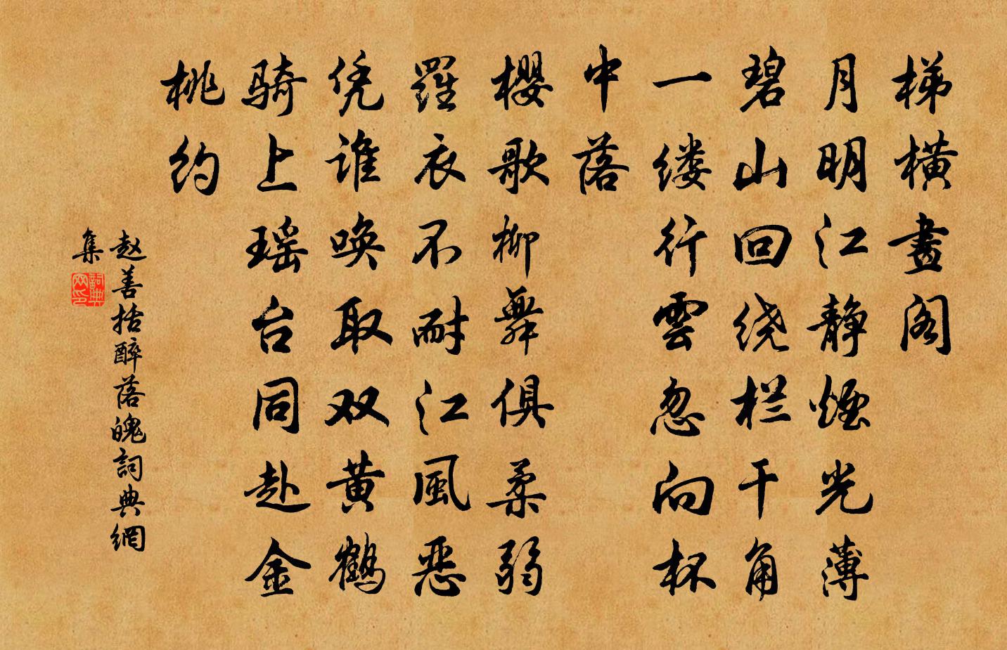 詩詞名句歷史字典書法欣賞書法字典國語詞典說文解字康熙字典古漢語字典標 題 作 者 詩 句 醉落魄/一斛珠作者:趙善括 朝代:宋代醉落魄/一斛珠原文梯橫畫閣。月明江靜煙光薄。碧山迴繞欄乾角。一縷行雲,忽向杯中落。櫻歌柳舞俱柔弱。羅衣不耐江風惡。憑誰喚取雙黃鶴。騎上瑤台,同赴金桃約。詩詞問答問:醉落魄/一斛珠的作者是誰?答:趙善括問:醉落魄/一斛珠寫於哪個朝代?答:宋代問:醉落魄/一斛珠是什麼體裁?答:詞趙善括醉落魄/一斛珠書法欣賞醉落魄/一斛珠書法作品詩詞推薦緣識宋太宗〔宋代〕阮鹹初立意,偷得姮娥月。三柱應琴徽,五音更互發。堪聽諸調弄,勾鏁無休歇。閒暇優遊子,順風吟案揭。時聞送苗贇赴陽翟丞耿湋〔唐代〕夕陽秋草上,去馬弟兄看。年少初辭闕,時危遠效官。山行獨夜雨,旅宿二陵寒。詩興生何處,嵩陽羽客壇。悼吳居厚喻良能〔宋代〕學問從來著月評,慈恩何事欠題名。賢哉難老堂雖就,惜也陳情表未成。疇昔幾回同把酒,於今一涕獨沾纓。張公太常樂章三十首其二十三引群官作正安之曲楊億〔宋代〕萬邦來同,九賓在位。奉璋薦紳,陟降庭止。文思安安,威儀棣棣。臣哉鄰哉,介爾蕃祉。金剛隨機無盡頌知見不生分第三十一釋印肅〔宋代〕有解卻成非,猶未盡離微。一體含法界,無知無不知。留題太山倪適〔宋代〕下列群山谷萬道,霞瑞重重絕項高。獨判天涯第一□,洞天深影無人□。挽畢宰二首汪炎昶〔宋代〕極窮如自眼,篤養有餘嘆。動以古為法,事皆人所難。凶奸多上壽,庸鄙或高官。為喜才堪恃,業深謝砌蘭。木蘭花慢盧祖皋〔宋代〕向蒲江佳處,報新葺、小亭軒。有碧嶂青池,幽花瘦竹,白鷺蒼煙。年華再周甲子,對黃庭、心事只然。都占壺天水龍吟(別故人)曾協〔宋代〕楚鄉菰黍初嘗,馬蹄偶踏揚州路。蓴絲向老,江鱸堪膾,催人歸去。秋氣蕭騷,月華如洗,一天風露。望重重煙水道中即事釋紹嵩〔宋代〕饒水回迴轉,白雲西復東。日斜喧急雨,天闊退飛鴻。薄暮沿西峽,隆寒正北風。茲行有勝事,未敢嘆途窮。題雍丘崔明府丹灶李白〔唐代〕美人為政本忘機,服藥求仙事不違。葉縣已泥丹灶畢,瀛洲當伴赤松歸。先師有訣神將助,大聖無心火自飛。九轉挽崔丞相三首劉克莊〔宋代〕昔侍瓊花宴,回頭二紀餘。嵇康作書懶,魏勃掃門疏。尚意開黃閣,安知尾素車。蕭然旋馬第,人指相君居。冬夜戲書陸游〔宋代〕東歸剡曲寄彷徉,閒日雖冬亦自長。梅瘦有情橫淡月,雲輕無力護清霜。長魚通印鹽花白,珍鮓披綿麴糝香。一飽偈頌一百零二首釋慧遠〔宋代〕當年四月初八,老胡舊病再發。雲門遇水脫鞵,且莫隨佗孟八。九龍吐水沫金軀,七步周行總不如。稽首歸依乾屎秋浦樓趙葵〔宋代〕麗譙岧曉壯城關,萬里關河歸日睫。雨餘漁釣玉奮開,煙生芙蓉翠屏列。吳頭楚尾二十秋,滿耳鉉歌聲未絕。不才奉和聖制送張說上集賢學士賜宴(賦得私字)李元紘〔唐代〕碩儒延鳳沼,金馬被鴻私。饌玉趨丹禁,箋花降紫墀。銜恩傾旨酒,鼓舞詠康時。暫覯群書緝,逾昭盛業丕。接筵燕春台(送鄭毅齋入觀)趙以夫〔宋代〕錦里春回,玉墀天近,東風穩送雕韉。祖帳移來,光流萬斛金蓮。十分香月娟娟。照人間、一點魁躔。此時新事,偈頌一百二十三首釋普度〔宋代〕憶昔當年錯訪尋,被他用盡毒肝心。賺來賺到凌霄頂,火冷雲寒恨轉深。冤可解,不可結,必竟如今甚時節。打拳詩送讀易堂張碧窗之揚陳著〔宋代〕占得資身話柄高,六鰲島上足逍遙。南風又送飛霞佩,北道相期明月橋。要坐虎皮專說易,肯攜鳳侶共 * 。此行野廟司馬光〔宋代〕古廟崩榱在,牆間雜樹荒。依稀余像設,寂寞必祠堂。舊日牲豭地,今晨孤兔鄉。英靈如未滅,何以度淒涼。名句推薦愛人者此為博焉,利人者此為厚焉。墨子《墨子·26章 天志(上)》 願天上人間,占得歡娛,年年今夜。柳永《二郎神·炎光謝》 意長翻恨遊絲短。盡日相思羅帶緩。嚴仁《玉樓春·春思》 試上超然台上看,半壕春水一城花。蘇軾《望江南·超然台作》 春眠不覺曉,處處聞啼鳥。孟浩然《春曉》 身有傷,貽親憂。德有傷,貽親羞。李毓秀《弟子規·入則孝》 夢入藍橋,幾點疏星映朱戶。吳文英《荔枝香近·七夕》 等閒識得東風面,萬紫千紅總是春。朱熹《春日》 芳草已雲暮,故人殊未來。韋莊《章台夜思》 驚塞雁,起城烏,畫屏金鷓鴣。溫庭筠《更漏子·柳絲長》