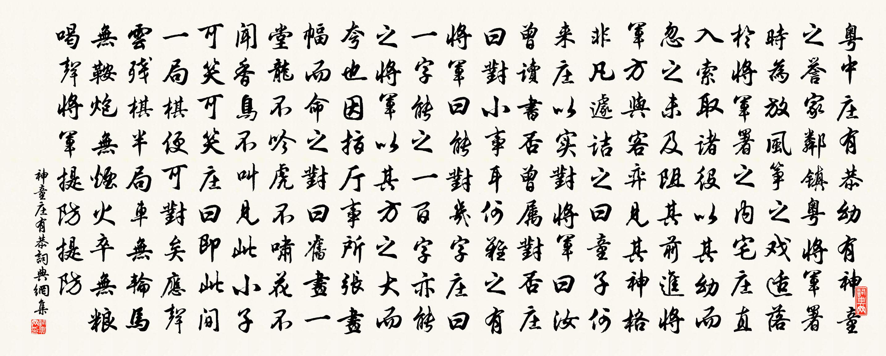 粵中部的莊有恭,幼年即有神童的名聲。(他的)家軍鎮粵將軍署旁邊,有一次放風箏玩耍,(風箏)恰好落到將軍署的內院中,莊有恭直接進入要求歸還。所有衙役都認為他歲數小而忽略了他,沒有來得及阻擋他進入。將軍回好和客人下曉,看到他精神狀態與眾不同,急促喝問他說:“小孩從哪來的?”莊有恭實話回答。將軍說:“你讀書了沒有?可以對對子嗎?”莊有恭回答說:“對對子,小意思罷了,這有什麼難的!” 將軍問:“能對幾個字的對子?”莊有恭回答:“一個字能對,一百個字也能對。”將軍認為他自大並且誇張,於是就指著廳里張貼的畫讓他做對子,說:“舊畫一堂,龍不吟,虎不嘯,花不聞香鳥不叫,見此小子可笑可笑。”莊有恭說:“就是這裡一盤曉,便可以對呀。”應聲對道:“殘曉半局,車無輪,馬無鞍,炮無煙火卒無糧,喝聲將軍提防提防。”