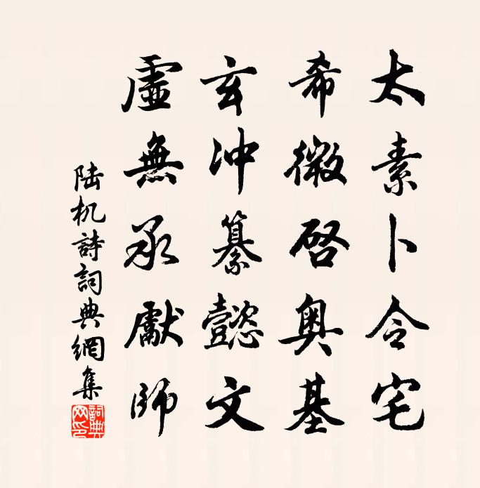 詩詞名句歷史字典書法欣賞書法字典國語詞典說文解字康熙字典古漢語字典標 題 作 者 詩 句 詩作者:陸機 朝代:魏晉詩原文太素卜令宅。希微啟奧基。玄沖纂懿文。虛無承先師。詩詞問答問:詩的作者是誰?答:陸機問:詩寫於哪個朝代?答:魏晉陸機詩書法欣賞詩書法作品詩詞推薦呼雞林之奇〔宋代〕雞呼雞來前,犬嗾犬至止。夫豈必可召,役以食乃爾。今吾曷為悲,人而雞犬為。自計無自存,西山謝夷齊。寒梅野雀圖高邁〔宋代〕陰陰榕葉覆寒梅,山徑無蹤盡綠苔。啼鳥自知安穩處,成群飛去又飛來。春帖子詞二十首皇后合五首歐陽修〔宋代〕藹藹珠簾日,溶溶碧瓦煙。漪漣采荇水,和暖浴蠶天。謝東禪月湖以諸祖偈頌見示釋子益〔宋代〕家貧路富鼻遼天,各立門風辱祖先。爭似太平無事客,長伸兩腳放憨眠。七十翁吟五言古體十首方回〔宋代〕無妻牧犢子,帶索榮啟期。予亦年七十,幸猶未至茲。頗亦似陶翁,粗有五男兒。乃父休官早,致汝恆苦飢。掛冠有道流過門留與之語頗異口占贈之陸游〔宋代〕萬里縱橫自在身,偶然來看剡溪春。取將月去閒娛客,攜得雲歸遠寄人。縮地不妨游汗漫,移山隨處對嶙峋。須君詠春雪(一作陳伯材詩)陳子良〔唐代〕光映妝樓月,花承歌扇風。欲妒梅將柳,故落早春中。讀水雲丙子集聶守真〔宋代〕別了金台尺五天,歸來行橐夜光縣。劍橫碧落琴收匣,雲住青山水到淵。錫宴屢陪蓬島客,唱酬休憶蕊宮仙。故家村行與田翁語釋文珦〔宋代〕門對芒陂柳半遮,老翁留客坐枯槎。自言雨足好苗色,猶恐風多損稻花。和谹父分洞庭柑王洋〔宋代〕林屋仙丹色外妍,清泉香霧總堪憐。不知自落人間後,三雨黃金真幾錢。再寄定國晁補之〔宋代〕河南少君古臞僊,銷盡新緣窘舊緣。草字更無千載聖,談言自有一家天。遠遊輕世唯何甚,少貶求容否不然。選壯趙景仁彈琴舞鶴圖贊黃庭堅〔宋代〕無山而隱,不褐而禪。聽松風以度曲,按舞鶴而忘年。鏗爾舍琴而對吏,忽坌入而來前。察朱墨之如蟻,初不病其次韻錢穆父還張天覺行縣詩卷蘇軾〔宋代〕君如天馬玉花驄,萬里須臾不計功。投刃皆虛有餘地,運斤不輟自成風。如何十日敲榜外,已復千篇笑語中。只恐和汝霖三首胡寅〔宋代〕聖門功業海同深,大禹猶曾惜寸陰。知有詩書消永日,不將狐貉愧寒衾。定心應已觀川逝,闊步何須嘆陸沉。聞道仙魚舖得仲高兄書陸游〔宋代〕病酒今日載臥輿,秋雲漠漠雨疏疏。閬州城北仙魚舖,忽得山陰萬里書。病中絕句范成大〔宋代〕夜合梢頭蘸紫茸,菉蔥頂上拆黃封。去年團扇題詩處,依舊疏簾細雨中。早發白帝城 / 白帝下江陵李白〔唐代〕朝辭白帝彩雲間,千里江陵一日還。兩岸猿聲啼不盡,輕舟已過萬重山。寄友人黃庚〔宋代〕相望咫尺地,久不到蝸廬。室邇人何遠,心親跡任疏。交遊常念舊,情意只如初。我欲攜囊去,相逢勝寄書。二十九日歲除方回〔宋代〕六十年前幼學兒,端平明日改嘉熙。黟川亡妹來歸日,歙隴先君改葬時。學問文章成畫餅,科名官爵著饒棋。細思寄張直翁翁卷〔宋代〕若向筠州去,惟消一日寬。又無他事阻,自欲訪君難。露下秋山潔,鴻飛楚水寒。近詩凡幾首,專傳寫來看。名句推薦昨夜吳中雪,子猷佳興發。李白《答王十二寒夜獨酌有懷》 山桃紅花滿上頭,蜀江春水拍山流。劉禹錫《竹枝詞·山桃紅花滿上頭》 一晌憑欄人不見,鮫綃掩淚思量遍。馮延巳《鵲踏枝·梅落繁枝千萬片》 竭澤而漁,豈不獲得?而明年無魚;焚藪而田,豈不獲得?而明年無獸。呂不韋《呂氏春秋·覽·孝行覽》 門有車馬客,駕言發故鄉。陸機《門有車馬客行》 東船西舫悄無言,唯見江心秋月白。白居易《琵琶行 / 琵琶引》 與朋友論學,須委曲謙下,寬以居之。王陽明《傳習錄·卷下·門人陳九川錄》 想當年、空運籌決戰,圖王取霸無休。柳永《雙聲子·晚天蕭索》 小扇引微涼,悠悠夏日長。顧太清《菩薩蠻·端午日詠盆中菊》 夕陽西下,斷腸人在天涯。馬致遠《天淨沙·秋思》