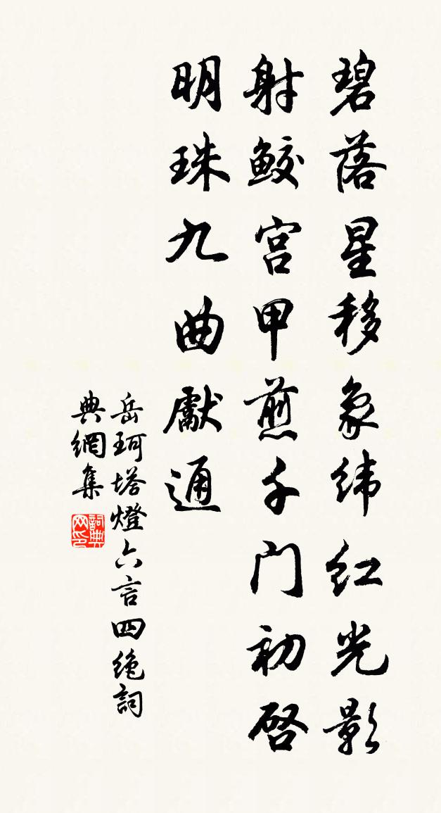 詩詞名句歷史字典書法欣賞書法字典國語詞典說文解字康熙字典古漢語字典標 題 作 者 詩 句 塔燈六言四絕作者:岳珂 朝代:宋代塔燈六言四絕原文碧落星移象緯,紅光影射鮫宮。甲煎千門初啟,明珠九曲先通。詩詞問答問:塔燈六言四絕的作者是誰?答:岳珂問:塔燈六言四絕寫於哪個朝代?答:宋代岳珂塔燈六言四絕書法欣賞塔燈六言四絕書法作品詩詞推薦出京孔武仲〔宋代〕整頓歸裝夜不眠,籃輿出趁早涼天。東南爽氣來相逼,葉底初聞一片蟬。哭張十八校書(數日前辱書,未及還答,俄承凶訃)權德輿〔唐代〕芸閣為郎一命初,桐州寄傲十年餘。魂隨逝水歸何處,名在新詩眾不如。蹉跎江浦生華髮,牢落寒原會素車。更憶題望海亭亭在臥龍絕頂陸游〔宋代〕瑞龍千丈何蜿蜒,蒼鱗翠鬣翔江邊。路逢鏡湖乃下駐,玩珠不去知何年。七州元帥擁畫戟,全家終日樓居仙。霜笳題王文孺臞庵向子諲〔宋代〕仙翁五十鬢猶青,高臥柴門晝亦扃。茅舍已忘鐘鼎夢,蒲輪休過薜蘿亭。陰森門巷先生柳,寂寞江天處士星。晚歲重陽不見菊宋祁〔宋代〕戲馬佳辰菊未黃,有人惆悵獨持觴。心知不作匆匆意,故欲凌寒報早霜。清陰館種楠蔣堂〔宋代〕手植楩楠二千樹,時當慶曆五年春。還期莫道空歸去,留得清陰與後人。潭州新學詩王安石〔宋代〕有嘉新學,潭守所作。守者誰歟,仲庶氏吳。振養矜寡,衣之褰襦。黔首鼓歌,吏靜不求。乃相廟序,生師所廬。泊昭亭山下得亭字梅堯臣〔宋代〕雲中峰午午,潭上樹亭亭。久作大梁客,貧留小阮醒。灘愁江舸澀,祠信楚巫靈。日暮渡頭立,山歌不可聽。送同年潘昌朝戴表元〔宋代〕客路秋深又送迎,狂歌爛飲慰飄零。風前數發莖莖白,馬上看山段段青。古穴無丹生洞氣,高林有鶴避潮腥。明年久雨秋懷二首劉學箕〔宋代〕漢陰抱瓮自其志,彭澤折腰非本心。碧梧委路霜信早, * 護籬秋氣深。稻場可羨西疇老,紅釀黃雞醉翁媼。自笑豆葉黃/憶王孫呂渭老〔宋代〕玉蕭風外一聲清。粉面嬋娟月對明。紫府樓台夜不扃。羽衣輕。穩駕雙鸞謁帝庭。更漏子(暮春)趙長卿〔宋代〕日彤彤,風蕩蕩。簾外柳花飛揚。紅有限,綠無窮。雨晴芳徑中。腸寸結。縈離別。還是去年時節。春暮也,子歸句梅詢〔宋代〕先帝遺弓劍,排雲上紫清。同時受顧托,今日見昇平。潯陽三題。湓浦竹白居易〔唐代〕潯陽十月天,天氣仍溫燠。有霜不殺草,有風不落木。玄冥氣力薄,草木冬猶綠。誰肯湓浦頭,回眼看修竹?其有【雙調】沉醉東風 宮詞孫周卿〔元代〕雙拂黛停分翠羽,一窩雲半吐犀梳。寶靨香,羅襦素,海棠嬌睡起誰扶?腸斷春風倦繡圖,生怕見紗窗唾縷。花月燭影搖紅(麓翁夜宴園堂)吳文英〔宋代〕新月侵階,彩雲林外笙簫透。銀台雙引繞花行,紅墜香沾袖。不管簽聲轉漏。更明朝、棋消永晝。靜中閒看,倦羽水龍吟呂渭老〔宋代〕年年九月西湖,繡船繼日笙簫擁。五雲深處,紅簾一桁,語鶯歌鳳。群玉峰頭,影娥池畔,煙霞飛動。認蓬瀛仙子偈七首釋法泰〔宋代〕南山起雲,北山下雨。老僧更為震雷聲,助發威光令遠布。平山堂杜東〔宋代〕平山堂下水雲重,孤笛淒涼淡月中。不見龍蛇飛素壁,只科狐兔戍離宮。仙翁已逐風流盡,世事俱隨夢幻空。廣武秀實再用前韻惠詩再答答見贈王洋〔宋代〕身似鷦鷯寄遠林,仍將病骨卜晴陰。有情緣墮有情法,無處雲知無處心。棋對僧窗時自縱,詩傳人口不堪吟。感君名句推薦蛛絲暗鎖紅樓,燕子穿簾處。吳文英《荔枝香近·七夕》 臥聞兒女夸翁健,詩句年光一樣新劉克莊《戊午元日二首》 涼月如眉掛柳灣,越中山色鏡中看。戴叔倫《蘭溪棹歌》 息徒蘭圃,秣馬華山。嵇康《贈秀才入軍·其十四》 古之得道者,窮亦樂,達亦樂,所樂非窮達也。呂不韋《呂氏春秋·覽·孝行覽》 風送梅花過小橋,飄飄。趙顯宏《晝夜樂·冬》 責其所難,則其易者不勞而正;補其所短,則其長者不勸而遂。司馬光《資治通鑑·漢紀二十》 寧做太平犬,莫做離亂人!佚名《增廣賢文·下集》 雲銷雨霽,彩徹區明。王勃《滕王閣序》 無人調護,自去經心。沈復《浮生六記·閨房記樂》