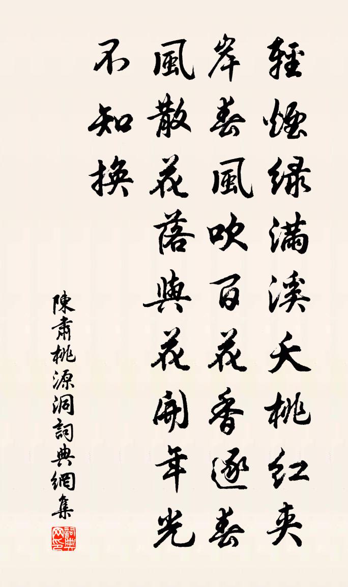 詩詞名句歷史字典書法欣賞書法字典國語詞典說文解字康熙字典古漢語字典標 題 作 者 詩 句 桃源洞作者:陳肅 朝代:宋代桃源洞原文輕煙綠滿溪,夭桃紅夾岸。春風吹百花,香逐春風散。花落與花開,年光不知換。詩詞問答問:桃源洞的作者是誰?答:陳肅問:桃源洞寫於哪個朝代?答:宋代陳肅桃源洞書法欣賞桃源洞書法作品詩詞推薦離婺源過古薦注口張村三渡遂登五嶺方回〔宋代〕臥聞鄰客曉先發,亦束寢衣辭旅榻。急雨頓止風稍動,空山微涼路不滑。溪流向西吾適東,舟渡者三更橫縱。人心深村艾性夫〔宋代〕索居無遠興,晚憩傍深村。(左石右問)澀水爭道,桑空草托根。斷橋回老馬,熟果聚飢猿。解後僧同話,歸來人滿江紅(孟史君禱而得雨)臞翁〔宋代〕禱雨文昌,只全靠、心香一瓣。才信宿,沛然膏澤,來從方寸。早稻含風香旖旎,晚秧飽水青蔥茜。問螺江、恰見又敬和寓舍洪咨夔〔宋代〕借得廬仝屋數間,不為太窄不為寬。胸中鵬背三千里,膜外羊腸百八盤。薜荔水中摽本遠,菖蒲石上見花難。粗茶夏至范成大〔宋代〕石鼎聲中朝暮,紙窗影下寒溫。踰年不與廟祭,敢雲孝子慈孫。【正宮】醉太平_寒食珠簾外王元鼎〔元代〕寒食珠簾外燕飛,喬木上鶯啼,鶯鶯燕燕正寒食,想人生有幾。有花無酒難成配,無花有酒難成對。今日有花有酒丁未仲夏季弟海陵官舍家大人賞月作詩和韻孫應求〔宋代〕銀蟾憂易缺,彩侍喜長圓。豈意他鄉會,均同一樂全。杯行驚知舊,星聚敢占天。但願人常久,頻將桂影延。好事近·搖首出紅塵朱敦儒〔宋代〕搖首出紅塵,醒醉更無時節。活計綠蓑青笠,慣披霜沖雪。晚來風定釣絲閒,上下是新月。千里水天一色,看孤鴻文宗元聖昭獻孝皇帝輓歌三首劉禹錫〔唐代〕繼體三才理,承顏九族親。禹功留海內,殷歷付天倫。調露曲常在,秋風詞尚新。本支方百代,先讓棣華春。月落送李端叔從定州先生辟晁補之〔宋代〕中山老帥岩廊姿,不用猶作諸侯師。毛錐變化有風雨,餘事亦足疲群兒。龍門爭騖貨趨肆,求貨安知於此市。百年賀孫知從改章服唐仲友〔宋代〕蚤歲蹉蛇晚節全,舉觴猶自吸長川。紫泥優渥逢熙事,朱紱榮華慰暮年。強效瓊杯喔慶語,欲將鐵杖壽真仙。明堂和韓丈雪晴章甫〔宋代〕天公逞巧逐時新,戲把乾坤作爛銀。淨壓邊塵無戰馬,寒持使節有詩人。夜長霜月爭催曉,年近江山逼放春。歸壽偈頌七十六首釋師觀〔宋代〕晷運推移,日南長至。自古自今,同天同地。靈山一會尚儼然,雷音堂中談不二。題潘師房劉商〔唐代〕渡水傍山尋石壁,白雲飛處洞門開。仙人來往行無跡,石徑春風長綠苔。挽上官茂叔曾豐〔宋代〕讀書初有激,知命復何營。熊掌酒中趣,鴻毛身後名。山川揫寶氣,學校戛金聲。老驥隨駒逝,若為泉下情。浣溪沙(癸已豫章)趙師俠〔宋代〕日麗風和春晝長。杏花枝上正芬芳。無情社雨亦何狂。一洗嬌紅啼嫩臉,半開新綠映殘妝。畫梁空有燕泥香。眼兒媚(效易安體)侯置〔宋代〕花信風高雨又收。風雨互遲留。無端燕子,怯寒歸晚,閒損簾鉤。彈棋打馬心都懶,攛掇上春愁。推書就枕,鳧煙薊丘覽古贈盧居士藏用七首。樂生陳子昂〔唐代〕王道已淪昧,戰國競貪兵。樂生何感激,仗義下齊城。雄圖竟中夭,遺嘆寄阿衡。次韻古梅蘇泂〔宋代〕獨立枝南萬事非,歲寒引去合知幾。伯夷自信西山餓,公望何須東海歸。笛外數聲空入夢,江頭一樹忽斜暉。相看送夏侯秀才李中〔唐代〕江村搖落暮蟬鳴,執手臨岐動別情。古岸相看殘照在,片帆難駐好風生。牽吟一路逢山色,醒睡長汀對月明。況是名句推薦征人去日殷勤囑,歸雁來時數附書。王維《伊州歌》 多少天涯未歸客,盡借籬落看秋風。唐寅《菊花》 日高煙斂,更看今日晴未。李清照《念奴嬌·春情》 只應守寂寞,還掩故園扉。孟浩然《留別王侍御維 / 留別王維》 遙知湖上一樽酒,能憶天涯萬里人。歐陽修《春日西湖寄謝法曹歌》 兒不嫌母醜,狗不嫌家貧。佚名《增廣賢文·下集》 兩株桃杏映籬斜,妝點商州副使家。王禹偁《春居雜興·兩株桃杏映籬斜》 永憶江湖歸白髮,欲回天地入扁舟。李商隱《安定城樓》 千點寒梅曉角中,一番春信畫樓東。楊慎《鷓鴣天·元宵後獨酌》 見而不見,聞而不聞,知而不知。韓非及後人《韓非子·主道》