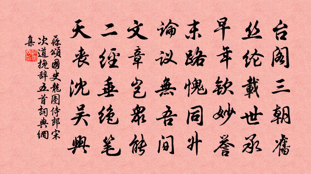 詩詞名句歷史字典書法欣賞書法字典國語詞典說文解字康熙字典古漢語字典標 題 作 者 詩 句 國史龍圖侍郎宋次道輓辭五首作者:蘇頌 朝代:宋代原文台閣三朝舊,絲綸載世承。早年欽妙譽,末路愧同升。論議無吾間,文章豈眾能。二經垂絕筆,天喪沈吳興。詩詞問答問:《國史龍圖侍郎宋次道輓辭五首》的作者是誰?答:蘇頌問:該詩寫於哪個朝代?答:宋代書法欣賞國史龍圖侍郎宋次道輓辭五首書法作品詩詞推薦雜興四首於石〔宋代〕四圍綠樹岩藏屋,一枕清風竹滿軒。醉里不知山雨過,醒來惟怪瀑聲喧。菩薩蠻高觀國〔宋代〕玉闌秋色知誰主。隔闌一架葡萄雨。綠蘚怕啼螿。可堪宮漏長。烏絲吟古怨。清淚消塵硯。夢冷不成雲。□峰峰外奉和襲美太湖詩二十首三宿神景宮陸龜蒙〔唐代〕靈蹤未遍尋,不覺溪色暝。回頭問棲所,稍下杉蘿徑。岩居更幽絕,澗戶相隱映。過此即神宮,虛堂愜雲性。四軒落花嚴惲〔唐代〕春光冉冉歸何處,更向花前把一杯。盡日問花花不語,為誰零落為誰開。游澹岩張釜〔宋代〕澹岩類古隊君子,一見可洗千劫塵。清曠信出世間境,經行如畫圖中人。幽泉涓涓不硋墜,靈草苒苒非關春。題詩次韻林子中蒜山亭見寄蘇軾〔宋代〕奇逸多聞老敬通,何人慷慨解憐翁。十年簿領催衰白,一笑江山發醉紅。聞道賦詩臨北固,未應舉扇向西風。叩頭懷山居二絕鄭剛中〔宋代〕披聳尋得晚花瘦,帶雨翦來春韭香。憶把餘醺付松枕,明朝春夢不勝長。晚花虞儔〔宋代〕花開春已去,春在此中藏。可恨芳菲晚,翻令氣味長。繁陰供翠幄,輕暑絢紅妝。莫起後時嘆,時來未遽央。寄報德寺從上人(鼓吹山在寺西)皎然〔唐代〕宗流許身子,物表養高閒。空色清涼寺,秋聲鼓吹山。看心水磬後,行道雨花間。七葉翻章句,時時啟義關。塞上司馬光〔宋代〕節物正防秋,關山落葉稠。霜風壯金鼓,霧氣濕旌裘。未得西羌滅,終為大漢羞。慚非班定遠,棄筆取封侯。失調名佚名〔宋代〕蹙繡圈金,盤囊密約,未赴意先警。欲罷還休,臨行又怯,倚定畫欄痴等。簾風漸冷。先自慮、春宵不永。更那堪重憶舊句蘇泂〔宋代〕太飽傷清氣,微寒最好詩。白鷗沒浩蕩,天馬謝羈維。矯矯真無敵,飄飄信所之。百年龍變化,萬事燕差池。和張器先十絕楊萬里〔宋代〕漏黃官柳巳垂牆,針水公畦未種秧。多謝詩人來得得,蹈開三徑雨中荒。秋晚雜書三十首方回〔宋代〕三歲出瘴嶺,弱冠歷吳楚。晚涉大漠寒,遠吊長城古。失□得謗讟,少樂多辛苦。侵尋四十年,復此守環堵。松楸聯句嘲僧蘇轍〔宋代〕玉籌扦銀河,紅裙蔈碧波。更行三五步,浸著老僧窠。觀釣熊禾〔宋代〕暫停窗間詩,觀此池上釣。魚尾何沉沉,竹午何嫋嫋。一絲波面動,搖曳出深沼。校人畜我時,活我良謂厚。作鱠送武廣叔游浙東二首李洪〔宋代〕嬴相去千載,規摹筆勢難。空興黃絹語,誰把翠珉刊。並海歲雲暮,耶溪春更寒。知君四方誌,無璧薦盤餐。滿江紅(京口鳳凰池和蘆川“春水連天”韻。池,蘇魏公舊遊也。)吳潛〔宋代〕借問如何,春能好、客懷偏惡。消遣底、閒言閒語,近都慵作。歲月從今休點檢,江湖自古多流落。倚危亭、目斷用前韻再簡明叔仲威趙蕃〔宋代〕晨興襖子欠黃綿,宿火灰深更苦翻。官冷自疏鳧鶩進,兒飢不作雁鵝喧。孰雲數口須微祿,已料此身終灌園。二子【雙調】大德歌 四關漢卿〔元代〕謝家村,賞芳春,疑怪他桃花冷笑人。著誰傳芳信,強題詩也斷魂。花陰下等待無人問,則聽得黃犬吠柴門。名句推薦集韻增廣,多見多聞。佚名《增廣賢文·上集》 教人學而執有命,是猶命人葆而去其冠也。墨子《墨子·48章 公孟》 此地別燕丹,壯士發衝冠。駱賓王《於易水送人 / 於易水送別》 春風旍旗擁萬夫,幕下諸將思草枯。黃庭堅《送范德孺知慶州》 不挾長,不挾貴,不挾兄弟而友。孟子《孟子·萬章章句下·第三節》 乖僻自是,悔誤必多;頹惰自甘,家道難成。朱柏廬《朱子家訓·全文》 久廢山行疲犖确,尚能村醉舞淋浪。蘇軾《捕蝗至浮雲嶺山行疲苶有懷子由弟二首·其二》 池花春映日,窗竹夜鳴秋。李白《謝公亭·蓋謝朓范雲之所游》 君人者,愛民而安,好士而榮,兩者無一焉而亡。荀子《荀子·君道》 舊時王謝堂前燕,飛入尋常百姓家。劉禹錫《烏衣巷》