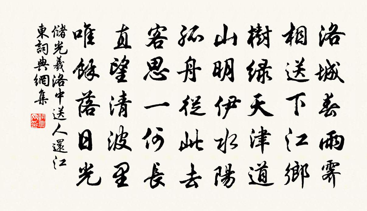 詩詞名句歷史字典書法欣賞書法字典國語詞典說文解字康熙字典古漢語字典標 題 作 者 詩 句 洛中送人還江東作者:儲光羲 朝代:唐代洛中送人還江東原文洛城春雨霽,相送下江鄉。樹綠天津道,山明伊水陽。孤舟從此去,客思一何長。直望清波里,唯餘落日光。詩詞問答問:洛中送人還江東的作者是誰?答:儲光羲問:洛中送人還江東寫於哪個朝代?答:唐代問:洛中送人還江東是什麼體裁?答:五律儲光羲洛中送人還江東書法欣賞洛中送人還江東書法作品注釋全唐詩:卷139_22全唐詩:卷139_22詩詞推薦早秋感懷張耒〔宋代〕永日付悠悠,年華逝不留。風聲送殘暑,雲色淡新秋。吾道倘有待,窮通寧遽憂。朝來望清潁,一雁下汀洲。湖口和全父弟韻陽枋〔宋代〕翻陽湖口縣,山合鎖人煙。石壁排屏翠,臨江障百川。次韻王得之禮部夜直有作李彌遜〔宋代〕緱仙勇於詩,若醉得全者。百川供微吟,不復事杯斝。五車載胸中,萬卷生笑下。一一成丹青,遇物輒圖寫。昨朝都梁亭下張耒〔宋代〕金塔青冥上,孤城蒼莽中。淺山寒帶水,旱日白吹風。人事劇翻手,生涯真轉蓬。高眠待春漲,鮭菜伴南公。鷓鴣天陳克〔宋代〕禁罥余寒酒半醒。蒲萄力軟被愁侵。鯉魚不寄江南信,綠盡菖蒲春水深。疑夢斷,愴離襟。重簾復幕靜愔愔。赤闌後游杜甫〔唐代〕寺憶新游處,橋憐再渡時。江山如有待,花柳更無私。野潤煙光薄,沙暄日色遲。客愁全為減,舍此復何之。女筵樂語姚勉〔宋代〕馬前喝道狀元歸,舊婿重新此事奇。駕鶴驂鸞來錦水,烹龍炰鳳宴瑤池。滿斟蕉葉融春色,共指蟠桃祝壽期。後會過龍潭澳陳耆卿〔宋代〕久闊松楸信,因為龍澳來。四山黃戀葉,一水綠澄苔。地曠樵聲出,天寒雁影回。無人且無酒,清坐興悠哉。念奴嬌趙長卿〔宋代〕夕陽底盡,望楚天空闊,稀星簾幕。暮靄橫江煙萬縷,照水參差樓閣。兩兩三三,樓前歸鷺,飛過欄乾角。霜風何胡季亨圃中有觀生亭取觀天地萬物生意楊誠齋周必大〔宋代〕只道春榮夏乃亨,誰知四序總生生。黃鐘大呂還相處,上下方能著五聲。大牆上蒿行曹丕〔魏晉〕 陽春無不長成,草木群類,隨大風起。零落若何翩翩,中心獨立一何煢。四時舍我驅馳,今我隱約欲何為?生頌古釋道顏〔宋代〕心不是佛,智不是道。青山白雲,落花芳草。若是靈利阿師,終不回頭轉腦。採桑子何〔宋代〕百花叢里花君子,取信東君。取信東君。名策花中第一勛。結成寶鼎和羹味,多謝東君。多謝東君。香遍還應號令次韻東廳韓侍郎齋居晚興王安石〔宋代〕齋禁雖嚴異太常,蕭然高臥意何長。煙含欲暝宮庭紫,日映新秋省闥黃。壯節易摧行踽踽,華年相忠去堂堂。追攀斷橋西人家三首方回〔宋代〕望極蘇堤欲盡頭,叢篁老柳水天秋。船中遙看家家好,卻恐君來住亦愁。送王伯初通判婺州梅堯臣〔宋代〕隱侯沒來久,八詠無繼作。星宿少光芒,虹霓掛樓角。邇來數百年,才彥森台閣。君平請是行,有意在岩壑。手持閏七夕姜特立〔宋代〕此夕從來天上少,斜河休問夜何其。不須更恨歡娛短,已是人間十日期。頌古五十五首釋紹曇〔宋代〕落賴兒郎自小愚,為貪花酒廢詩書。當時早得嚴師訓,破壞箕裘未到渠。句韋奇〔宋代〕黃犢拖犁倦,青簾說酒清。奉酬王知縣賞春不與以詩見贈蔡襄〔宋代〕仙陬翠觀盡繁英,朱白相兼照眼明。池浸嵐光生晚碧,鳥驚人語斷春聲。談諧遽喜開懷久,骩骳終慚走筆成。佳致名句推薦何用慰相思,裁書寄關右。李益《送諸暨王主簿之任》 闌乾倚遍重來憑。淚粉偷將紅袖印。歐陽修《玉樓春·去時梅萼初凝粉》 攜來百侶曾游,憶往昔崢嶸歲月稠。 * 《沁園春·長沙》 微微風簇浪,散作滿河星。查慎行《舟夜書所見》 聞道閶門萼綠華,昔年相望抵天涯李商隱《無題二首》 故音樂者,所以動盪血脈,通流精神而和正心也。司馬遷《史記·樂書》 東風兮東風,為我吹行雲使西來。李白《久別離》 見碧水丹山,黃蘆苦竹。宋江《滿江紅·喜遇重陽》 吾以為古之善者則述之,今之善者則作之,欲善之益多也。墨子《墨子·46章 耕柱》 棲霞山裂;沂水陷穴,廣數畝蒲松齡《地震》