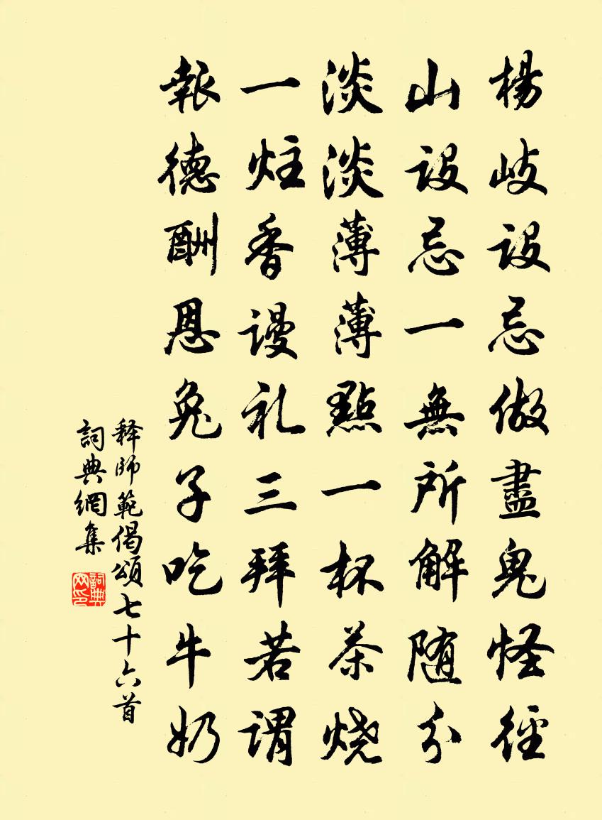 詩詞名句歷史字典書法欣賞書法字典國語詞典說文解字康熙字典古漢語字典標 題 作 者 詩 句 偈頌七十六首作者:釋師範 朝代:宋代偈頌七十六首原文楊岐設忌,做盡鬼怪。徑山設忌,一無所解。隨分淡淡薄薄,點一杯茶,燒一炷香,謾禮三拜。若謂報德酬恩,兔子吃牛奶。詩詞問答問:偈頌七十六首的作者是誰?答:釋師範問:偈頌七十六首寫於哪個朝代?答:宋代釋師範偈頌七十六首書法欣賞偈頌七十六首書法作品詩詞推薦中元甲子以辛丑駕幸蜀四首羅隱〔唐代〕子儀不起渾瑊亡,西幸誰人從武皇?四海為家雖未遠,九州多事竟難防。已聞旰食思真將,會待畋游致假王。應感同劉武子孫李和游鐘山和劉武子韻任希夷〔宋代〕有客新從蜀道不,共招北隱步松間。何人寫出秋風句,付與淮南大小山。次韻王茶馬海棠四絕魏了翁〔宋代〕一春風雨亂書堆,掛口林閒未放開。浩蕩和風褰客袂,來看大樹簇池台。洞仙歌(惜春和李元膺)吳泳〔宋代〕翠柔香嫩,乍春風庭院。換卻幽人讀花眼。淡花黃裊裊,玉破梢頭,鶯未囀,綠皺池波尚淺。王孫才別後,長負芳節夫釋紹曇〔宋代〕一生堅守居延操,歷盡間關見老成。菊噀晚香松傲雪,短筇扶瘦日尋盟。短歌行李白〔唐代〕白日何短短,百年苦易滿。蒼穹浩茫茫,萬劫太極長。 * 垂兩鬢,一半已成霜。天公見玉女,大笑億千場。吾欲送智齊師出峽王灼〔宋代〕齊師成都來,春風掀竹笠。自雲十五年,參學事未畢。得錢買小舟,湖南尋佛日。胸中有此老,如飯不下嗌。誓竭蝶戀花張掄〔宋代〕碧海沈沈西極遠。間訪□□,□□□□□。恰值群仙來閬苑。相將□□□□□。□□□□誰得見。五彩□□,□□賦張舍人抱嘯堂五首姜特立〔宋代〕餘子紛紛見每卑,鸞鳳雞鶩謾相隨。當時一笑無人解,此意寧容俗士知。春日秦國懷古周朴〔唐代〕荒郊一望欲消魂,涇水縈紆傍遠村。牛馬放多春草盡,原田耕破古碑存。雲和積雪蒼山晚,煙伴殘陽綠樹昏。數里殘句:快晴似為酴醿計范成大〔宋代〕快晴似為酴醿計,急雨還妨燕子飛。和陶飲酒二十首蘇軾〔宋代〕嘵嘵六男子,弦誦各一經。復生五丈夫,戢戢丁欲成。歸田了門戶,與國充踐更。普兒初學語,玉骨開天庭。淮老送趙公遠往健康張元乾〔宋代〕王孫朝謁去,功業嘆流年。強項今三已。棲遲未九遷。笑談曾擊賊,謀畧合臨邊。秋雨長幹路,歸時且著鞭。題黃犢嶺呂弘〔宋代〕疇昔聞高隱,紅塵隔遠林。間乘黃犢出,踏破白雲深。自得忘歸樂,應多扣角吟。如今秋草沒,幾約與僧尋。食薺陸游〔宋代〕小著鹽醯助滋味,微加薑桂發精神。風爐歙缽窮家活,妙訣何曾肯授人。挽史魯公李曾伯〔宋代〕自出權衡下,當從履屐間。舊遊今歷落,往事幾危艱。紀德哀辭痛,酬知老淚潸。哲人今已矣,魂夢繞鄞山。滿江紅 方城商帥國器軍中寄同年李欽用,時元好問〔金代〕漢水窗方城,今窗古道、幾窗回投跡。留滯久、浩歌狂醉,此心誰識。渭北清光搖草樹,故人對窗相應識。記雨窗寄盧威仲中書劉克莊〔宋代〕艾翁孝廟老詞臣,曾許樗翁接後塵。想見柳邊飛蓋客,不忘花外小車人。無斜封出公嚴憚,有賜金揮仆未貧。聞上題女唱驛蘇軾〔宋代〕攪轡金房道,崎嶇難具陳。浮嵐常作雨,冷氣不知春。少見寬平路,多逢臃腫民。欲知何處遠,巫峽是西鄰。贈張建韓翃〔唐代〕結客平陵下,當年倚俠游。傳看轆轤劍,醉脫驌驦裘。翠羽雙鬟妾,珠簾百尺樓。春風坐相待,晚日莫淹留。名句推薦君子恥不修,不恥見污。荀子《荀子·非十二子》 柳葉開銀鏑,桃花照玉鞍。駱賓王《送鄭少府入遼共賦俠客遠從戎》 廢一善,則眾善衰。賞一惡,則眾惡歸。黃石公《三略·下略》 有孫母未去,出入無完裙。杜甫《石壕吏》 觀其交遊,則其賢不肖可察也管仲《管子·權修》 來歲花前。又是今年憶去年。呂本中《減字木蘭花·去年今夜》 一年最好,偏是重陽。吳文英《惜黃花慢·菊》 看風流慷慨,談笑過殘年辛棄疾《八聲甘州·故將軍飲罷夜歸來》 漁父天寒網罟凍,莫徭射雁鳴桑弓。杜甫《歲晏行》 浮雲不系名居易,造化無為字樂天李忱《吊白居易》