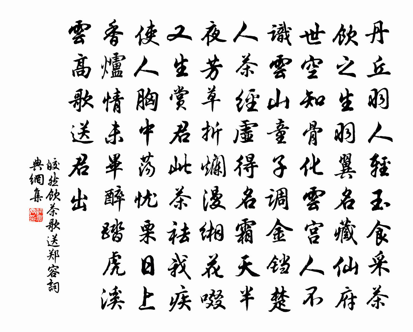 詩詞名句歷史字典書法欣賞書法字典國語詞典說文解字康熙字典古漢語字典標 題 作 者 詩 句 飲茶歌送鄭容作者:皎然 朝代:唐代飲茶歌送鄭容原文丹丘羽人輕玉食,採茶飲之生羽翼。名藏仙府世空知,骨化雲宮人不識。雲山童子調金鐺,楚人茶經虛得名。霜天半夜芳草折,爛漫緗花啜又生。賞君此茶祛我疾,使人胸中盪憂栗。日上香爐情未畢,醉踏虎溪雲,高歌送君出。詩詞問答問:飲茶歌送鄭容的作者是誰?答:皎然問:飲茶歌送鄭容寫於哪個朝代?答:唐代問:飲茶歌送鄭容是什麼體裁?答:雜言皎然飲茶歌送鄭容書法欣賞飲茶歌送鄭容書法作品注釋全唐詩:卷821-23詩詞推薦其二但令朱雀長金花,此別還同一轉車。五百蘇軾〔宋代〕窈窕山頭井,潛通伏澗清。欲知深幾許,聽放轆轤聲。戲題襲美書印囊陸龜蒙〔唐代〕鵲銜龜顧妙無餘,不愛封侯愛石渠。應笑休文過萬卷,至今誰道沈家書。漁父詞張雨〔元代〕上釣金鱗不用多。踏翻船子便高歌。猶有在,問如何。問取儂家張志曉入東谷文同〔宋代〕振纓效王官,釋耒去鄉縣。十年始還此,景物覺盡變。東谷素所愛,乍到若創見。煙雲引晨策,數里入蔥蒨。明霞鹿邑道中張耒〔宋代〕去歲秋時去,今年秋又來。浮名何所得,歲月苦相催。贈劉羲仲吳炯〔宋代〕束帶真成屈壯圖,寧思飽死嘆侏儒。便拈手版還丞相,卻覓芒鞋踏故廬。少日縈心但黃嬭,暮年使鬼勾青奴。他時送隱者一絕杜牧〔唐代〕無媒徑路草蕭蕭,自古雲林遠市朝。公道世間唯白髮,貴人頭上不曾饒。目痛一月未愈自和前九首劉克莊〔宋代〕朱顏無藥能駐,白髮緣愁許長。昏昏枉讀萬卷,蹙蹙起瞻四方。登齊雲亭宋祁〔宋代〕少城西北最高處,憑檻極眺襟懷開。糢糊煙樹鳥邊靜,突兀雲山天外來。歸檣櫛櫛逗淮浦,涼颸獵獵生岩隈。雖非經士馬中作貫休〔唐代〕偷兒成大寇,處處起煙塵。黃葉滿空宅,青山見俗人。妖星芒刺越,鬼哭勢連秦。惆悵還惆悵,茫茫江海濱。偈頌二百零五首釋正覺〔宋代〕蛇鑽不入,鳥飛不度,我道人人在里許。三更明月下西山,一陣清霜脫寒樹。陸發荊南始至商洛李商隱〔唐代〕昔去真無奈,今還豈自知。青辭木奴橘,紫見地仙芝。四海秋風闊,千岩暮景遲。向來憂際會,猶有五湖期。閏月二十日離玉山八月到餘干易舟又二日抵鄱趙蕃〔宋代〕草草天涯棹,悠悠江上鷗。琵琶千古恨,蓑笠十年游。莫向官亭泊,閒為佛界流。明朝更西去,依舊覓扁舟。鳳鸞雙舞汪元量〔宋代〕慈元殿、薰風寶鼎,噴香雲飄墜。環立翠羽,雙歌麗調,舞腰新束,舞纓新綴。金蓮步、輕搖彩鳳兒,翩翻作戲。寄方叔姜特立〔宋代〕落葉滿滄灣,墜露濕疏柳。幽人曉無事,杖策經林阜。忽焉若有省,懷此山中友。便欲借風翰,翩翩插雙肘。送王使君赴太原拜節度副使司空曙〔唐代〕新從劉太尉,結束向并州。絡腦青絲騎,盤囊錦帶鉤。出關逢將校,下嶺擁戈矛。匣閉黃雲冷,山傳畫角秋。劍鋒松門歐陽修〔宋代〕島嶼松門數里長,懸崖對起碧峰雙。可憐勝境當窮塞,翻使留人戀此邦。亂石驚灘喧醉枕,淺沙明月入船窗。因游同諸韓飲曼叔家梅堯臣〔宋代〕富貴豐盤餐,日可侑清角。不與賢者俱,飽食何所學。吾友雖日貧,邀賞不辭數。質衣為酒肴,出論輕管樂。其饌賀吳興郡王生日四絕王炎〔宋代〕黃門宣賜出丹墀,花萼樓邊禁漏遲。天上龍顏生喜色,鶺鴒飛在萬年枝。問月台蘇竹莊同賦白玉蟾〔宋代〕千山萬山翠交鎖,何處瑤台天上墮。台前吟久忽登樓,樓前開窗天入座。留天且莫放天歸,問天明月來幾時。青天名句推薦失之東隅,收之桑榆。范曄《後漢書·列傳·馮岑賈列傳》 此地朝來餞行者,翻向此中牧征馬。孟浩然《高陽池送朱二》 吹笳暮歸野帳,雪壓青氈。陸游《漢宮春·初自南鄭來成都作》 文官不愛錢,武官不惜死,則天下太平。張廷玉《明史·列傳·卷一百四十三》 鳥啼官路靜,花發毀垣空。張繼《清明日自西午橋至瓜岩村有懷》 蓋鍾子期死,伯牙終身不復鼓琴。班固《漢書·傳·司馬遷傳》 不期修古,不法常可。韓非及後人《韓非子·五蠹》 黃鶯不語東風起,深閉朱門伴舞腰。溫庭筠《楊柳八首·其三》 直道相思了無益,未妨惆悵是清狂。李商隱《無題·重幃深下莫愁堂》 卻恨悲風時起,冉冉雲間新雁,邊馬怨胡笳。葉夢得《水調歌頭·秋色漸將晚》