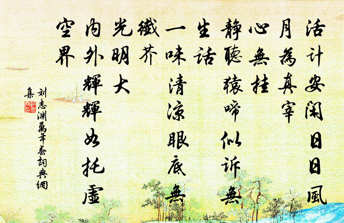 詩詞名句歷史字典書法欣賞書法字典國語詞典說文解字康熙字典古漢語字典標 題 作 者 詩 句 萬年春作者:劉志淵 朝代:元代萬年春原文活計安閒,日日風月為真宰。心無掛。靜聽猿啼,似訴無生話。一味清涼,眼底無纖芥。光明大。內外輝輝,如托虛空界。詩詞問答問:萬年春的作者是誰?答:劉志淵問:萬年春寫於哪個朝代?答:元代問:萬年春是什麼體裁?答:詞劉志淵萬年春書法欣賞萬年春書法作品詩詞推薦贈僧雪翁姚勉〔宋代〕雪翁來覓雪坡詩,冰雪相看太絕奇。一片紅爐參徹了,梅花香透玉橫枝。安分吟邵雍〔宋代〕輕得易失,多謀少成。德無盡利,善無近名。夏日陪馮許二侍郎與嚴秘書游昊天觀覽…同里楊華州中丞武元衡〔唐代〕三伏草木變,九城車馬煩。碧霄回騎射,丹洞入桃源。台殿雲浮棟,緌纓鶴在軒。莫將真破妄,聊用靜持喧。石甃鐵冠道士寄書李若水〔宋代〕金甲將軍傳好夢,鐵冠道士寄新書。我與雲長隔異代,翻疑此事太荒虛。幽居初夏陸游〔宋代〕鬢毛禿盡齒牙疏,難受人間折簡呼。詩酒本來無藉在,形骸況復不枝梧。槐陰漸密能鄣日,池水新生可浴鳧。移得黃鶴洞中仙 俗喝馬卜運算元王哲〔元代〕正被離家遠。衰草寒煙染。水隔孤村兩三家,你不牽上他馬,獨立沙汀岸。叫得船離岸。舉棹波如練。漁叟停船問和人游嵩山十二題其十二中峰范仲淹〔宋代〕嵩高最高處,逸客偶登臨。回看日月影,正得天地心。念此非常游,千載一披襟。題太平興國寺壁老妓〔宋代〕曾趁東風看幾巡,冒霜開喚滿城人。殘脂剩粉憐猶在,欲向彌陀借小春。水調歌頭夏元鼎〔宋代〕盡性之道。願方為世唾棄,曷能明子貢不傳之旨。荷來誠既切,竟以誕聖於北方壬癸之位,為水調一詞以謝,並呈峽山寺竹枝詞五首楊萬里〔宋代〕峽里撐船更不行,棹郎相語改行程。卻從西岸拋東岸,依舊船頭不可撐。潮州禮長老請贊釋法薰〔宋代〕面如死灰,匙挑不上。祖翁活業,盡情破盪。無星秤子拈來,也解袋子分斤定兩。禮長老,少思算。鱷魚幸自徙化雜劇·沙門島張生煮海李好古〔元代〕第一折(外扮東華仙上,詩云)海東一片暈紅霞,三島齊開爛熳花。秀出紫芝延壽算,逍遙自在樂仙家。貧道乃東西湖壽星院明遠堂蘇軾〔宋代〕十年不向此憑欄,景象依然一望間。龍蜃吐雲天入水,樓台倒影日銜山。僧於僻寺難為隱,人在扁舟未是閒。孤鶴訪許用晦張祜〔唐代〕遠郭日曛曛,停橈一訪君。小橋通野水,高樹入江雲。酒興曾無敵,詩情舊逸群。怪來音信少,五十我無聞。吳宮怨張籍〔唐代〕吳宮四面秋江水,江清露白芙蓉死。吳王醉後欲更衣,座上美人嬌不起。宮中千門復萬戶,君恩反覆誰能數。君心挽孫謙伯二首洪咨夔〔宋代〕日月無多子,鄉邦失兩賢。直為吾黨慟,不作世情憐。握手春風醉,論心夜雨眠。耳言猶歷歷,何忍表君阡。鳳棲梧/蝶戀花高觀國〔宋代〕雲喚陰來鳩喚雨。謝了江梅,可踏江頭路。拚卻一番花信阻。不成日日春寒去。見說東風桃葉渡。岸隔青山,依舊蘇學十題石楠朱長文〔唐代〕昔年曾賞玩,移自碧山遙。古乾磨文石,寒枝熨翠綃。雖殊楩梓用,終免雪霜凋。來者宜珍護,毋令困采樵。遷居(有引)蘇軾〔宋代〕吾紹聖元年十月二日至惠州,寓合江樓,是月十八日遷於嘉祐寺。二年三月十九日復遷於合江樓,三年四月二十日寄雪竇性首座釋智愚〔宋代〕祝融峰下燒紅葉,應夢山中看白雲。足跡未教容易見,誰知天外貌人聞。名句推薦寄書長不達,況乃未休兵。杜甫《月夜憶舍弟》 讀書志在聖賢,非徒科第;為官心存君國,豈計身家?朱柏廬《朱子家訓·全文》 看似尋常最奇崛,成如容易卻艱辛。王安石《題張司業詩》 白頭燈影涼宵里,一局殘棋見六朝。錢謙益《金陵後觀棋絕句六首·選一》 無情燕子,怕春寒、輕失花期。晁沖之《漢宮春·梅》 遠夢歸侵曉,家書到隔年。杜牧《旅宿》 梅似雪,柳如絲。試聽別語慰相思。辛棄疾《鷓鴣天·送歐陽國瑞入吳中》 彼竊鉤者誅,竊國者為諸侯,諸侯之門而仁義存焉莊子《莊子·外篇·胠篋》 迢遞嵩高下,歸來且閉關。王維《歸嵩山作》 欲剪箱中一尺天,吳娥莫道吳刀澀李賀《羅浮山父與葛篇》