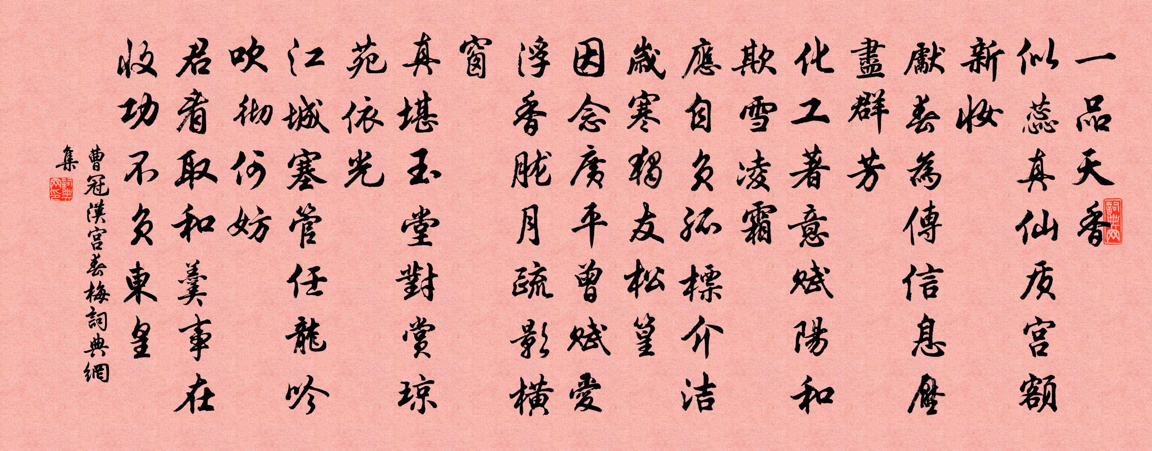 詩詞名句歷史字典書法欣賞書法字典國語詞典說文解字康熙字典古漢語字典標 題 作 者 詩 句 漢宮春(梅)作者:曹冠 朝代:宋代漢宮春(梅)原文一品天香。似蕊真仙質,宮額新妝。先春為傳信息,壓盡群芳。化工著意,賦陽和、欺雪凌霜。應自負,孤標介潔,歲寒獨友松篁。因念廣平曾賦,愛浮香朧月,疏影橫窗。真堪玉堂對賞,瓊苑依光。江城塞管,任龍吟、吹徹何妨。君看取,和羹事在,收功不負東皇。詩詞問答問:漢宮春(梅)的作者是誰?答:曹冠問:漢宮春(梅)寫於哪個朝代?答:宋代問:漢宮春(梅)是什麼體裁?答:詞曹冠漢宮春(梅)書法欣賞漢宮春(梅)書法作品詩詞推薦寧宗朝享三十五首真宗〔宋代〕旅楹有閒,人神允葉。福以德昭,鄉以誠接。六樂宜揚,百禮類燁。對越在天,流祚萬葉。次韻楊樞喜雨陳造〔宋代〕神護天關色正莊,挽回帝眷一絲香。人間雨信先鳴鸛,仙界雷翁叱臥羊。剡剡青身迷迥野,浮浮白水溜方塘。豐年送王都曹李覯〔宋代〕古木亭邊夜向晨,餞壺重疊擁雙輪。高文健筆科場手,白髮青衫宦路人。十月霜風還劈面,六街塵土會欺貧。麻源白龍寺徐網〔宋代〕萬木梢頭見塔尖,道人於此卜幽潛。深林六月風敲竹,古寺三更月入龕。天旱蛟龍藏窟宅,水枯魚鱉露須髯。我來龜堂雨後作陸游〔宋代〕澤國春多雨,龜堂病少悰。雖名舊朝士,其實老耕農。一點葦間火,數聲煙外鍾。詩材故不乏,處處起衰慵。再美勸農胡寅〔宋代〕邦本古攸重,民天辭匪夸。詎能皆辟穀,漫道獨餐霞。一笑為良繭,力耕無賣花。信知豳七月,於耜起周家。送友人游嵩山陳羽〔唐代〕嵩山歸路繞天壇,雪影松聲滿谷寒。君見九龍潭上月,莫辭清夜訪袁安。憶舍弟王翥〔宋代〕藥物吾仍病,花時汝未歸。不眠愁月落,獨立看雲飛。詩禮自持律,饑寒誰解圍。遙知理舟楫,西望涕沾衣。琅邪山清風亭張澤〔宋代〕滁陽承乏多閒暇,時入山中訪道安。何處披襟卻煩暑,清風亭上久盤還。寄韋子春(一作山中贈十四秘書兄)王季友〔唐代〕出山秋雲曙,山木已再春。食我山中藥,不憶山中人。山中誰余密,白髮日相親。雀鼠晝夜無,知我廚廩貧。依依北山移文哨遍王安中〔宋代〕嵩少為仕宦捷徑者,讀而羞之,是足為勇退者之鼓吹。陽翟蔡侯原道,恬於仕進。其內呂夫人有林下風。相與營歸夜行船仇遠〔宋代〕十二闌乾和露倚。銀潢淡、玉蟾如洗。萬籟無聲,纖雲不染。目斷楚天千里。自把黃花閒數蕊。空招隱、湘君山鬼楚中作張俞〔宋代〕渺渺洞庭野,蕭蕭黃鶴樓。水通雲夢浦,人渡沔陽舟。廣澤侵吳壤,孤城接郢丘。山分三楚斷,溪入九江流。寂寞附:郭翰酬織女織女〔唐代〕人世將天上,由來不可期。誰知一回顧,更作兩相思。贈枕猶香澤,啼衣尚淚痕。玉顏霄漢里,空有往來魂。富春山人為予道其所獲石於江中者狀甚怪偉欲文同〔宋代〕奇礓巑岏倚秋江,俗眼過幾多所忽。風霜鍛鏈愈堅重,怒浪噴激不可沒。富春山人好尚古,見此便以作吾物。鐫鑱賀新郎 壽清尹靳從矩朱唏顏〔元代〕懸古槐成幄。燕泥香、繁紅墜雨,半簾花落。一夜江皋黃犢雨,萬頃綠雲噴薄。聽四野、田家歡樂。堂上琴聲堂下陶榖贈詞圖唐寅〔明代〕一宿姻緣逆旅中,短詞聊以識泥鴻。當時我作陶承旨,何必尊前面發紅。 次韻古梅虞儔〔宋代〕怪底昌園一種梅,老枝強項獨遲開。伶俜鶴膝翻嫌瘦,皴皵龍鱗不受摧。羞把冰肌混桃李,故將粉面映莓苔。廣平和馮亞寄進士孫磻魏野〔宋代〕閒思生白髮,懶更把菱花。久別何州住,相尋恐路差。獨飛傷寒雁,會宿羨林鴉。猶得君為友,時過老母家。秋懷三十六首邵雍〔宋代〕良月滿高樓,高樓仍中秋。午夜冷露下,千里寒光流。何人將此鑒,拂拭新磨休。照破萬古心,白盡萬古頭。名句推薦驛外斷橋邊,寂寞開無主。陸游《卜運算元·詠梅》 橫眉冷對千夫指,俯首甘為孺子牛。魯迅《自嘲》 西風烈,長空雁叫霜晨月。 * 《憶秦娥·婁山關》 海日生殘夜,江春入舊年。王灣《次北固山下》 人生自古誰無死?留取丹心照汗青。文天祥《過零丁洋》 懷君屬秋夜,散步詠涼天。韋應物《秋夜寄邱員外 / 秋夜寄丘二十二員外》 流星透疏木,走月逆行雲。賈島《宿山寺》 人逢喜事精神爽,月到中秋分外明。馮夢龍《醒世恆言·卷十八》 夫妻反目,不能正室也。佚名《易傳·象傳上·小畜》 君不見,黃河之水天上來,奔流到海不復回。李白《將進酒》