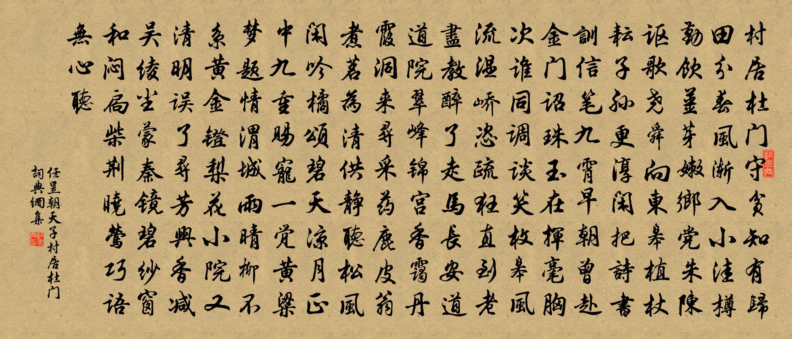 詩詞名句歷史字典書法欣賞書法字典國語詞典說文解字康熙字典古漢語字典標 題 作 者 詩 句 【中呂】朝天子_村居杜門,作者:任昱 朝代:元代原文村居杜門,守貧,知有歸田分。春風漸入小窪樽,勤飲姜芽嫩。鄉黨朱陳,謳歌堯舜,向東皋植杖耘。子孫,更淳,閒把詩書訓。信筆九霄,早朝,曾赴金門詔。珠玉在揮毫,胸次誰同調?談笑枚皋,風流溫嶠,恣疏狂直到老。盡教,醉了,走馬長安道。道院翠峰,錦宮,香靄丹霞洞。來尋採藥鹿皮翁,煮茗為清供。靜聽松風,閒吟《橘頌》,碧天涼月正中。九重,賜寵,一覺黃粱夢。題情渭城,雨晴,柳不系黃金鐙。梨花小院又清明,誤了尋芳興。香減吳綾,塵蒙秦鏡,碧紗窗和悶扃。柴荊,曉鶯,巧語無心聽。詩詞問答問:《【中呂】朝天子_村居杜門,》的作者是誰?答:任昱問:該詩寫於哪個朝代?答:元代書法欣賞【中呂】朝天子_村居杜門,書法作品詩詞推薦雨後病起二首陳造〔宋代〕旱歲仍無麥,淮民食正艱。幾時占雨信,今日破天慳。盡息田家嘆,聊開病客顏。何由長歲稔,金火莫循環。雜興陸游〔宋代〕病養精神過服藥,貧知儉約勝營生。皋夔事業今何有,且與心君致太平。春晝李賀〔唐代〕朱城報春更漏轉,光風催蘭吹小殿。草細堪梳,柳長如線。卷衣秦帝,掃粉趙燕。日含畫幕,蜂上羅薦。平陽花塢代意二首楊億〔宋代〕夢蘭前事悔成占,卻羨歸飛拂畫簷。錦瑟驚弦愁別鶴,星機促杼怨新縑。舞腰罷試收紈袖,博齒慵開委玉奩。幾夕君子有所思行李白〔唐代〕紫閣連終南,青冥天倪色。憑崖望鹹陽,宮闕羅北極。萬井驚畫出,九衢如弦直。渭水銀河清,橫天流不息。朝野秋夕趙希桐〔宋代〕霄虛白露溥,木葉下危闌。月澹鐘聲曉,燈青劍影寒。人心正莽莽,世事海漫漫。何日平胡虜,西風望眼寬。赴官鹹平蔡河阻水泊舟宛兵皇華亭下三首張耒〔宋代〕夜空如監碧新磨,倒影疏星亂素波。天色水光無別處,為君垂手攬銀河。淳化鄉飲酒三十三章佚名〔宋代〕嬉嬉南陔,眷眷慈顏。和氣怡色,奉甘興鮮。事親是宜,事君是思。虔勖忠孝,邦家之基。和竹軒張史君來字韻二首王邁〔宋代〕金鳳傳呼紫馬來,壺山真面氣佳哉。朝天有路鹿呈瑞,應物無心鷗不猜。黍穋熟時農洗甑,芰荷香客銜杯。官穹職秋夜黃庚〔宋代〕博山香冷夜將闌,紅影搖窗燈未殘。庭樹露濃花氣濕,井悟風老葉聲乾。世情冷暖知心少,朋舊東西會面難。一段軍中樂二首王鎡〔宋代〕靼衫閃色織雲羅,白馬金鞍載翠娥。把盞醉歸營月上,胡琴捍撥採茶歌。山墅陸游〔宋代〕煙水煙林老結廬,人間用短更誰知?軟蒲穩背供危坐,小幟障燈便細書。莫欺衰病歸山墅,曾領諸儒上石渠。貞觀詠竹五首憨山德清〔明代〕寒飛千尺玉,清灑一林霜。縱是塵心重,相看亦頓忘。矯矯凌雲姿,風生龍夜吼。霜雪不知年,真吾歲寒友。霜乾侍宴詠反舌詩沈約〔南北朝〕假容不足觀。遺音猶可薦。幸蒙喬樹恩。得以聞高殿。再題小西湖姚勉〔宋代〕記得臨風玉樹前,聽詩長愛思飄然。肯來重結鷗盟否,新有湖亭 * 椽。寄題相台太尉韓公晝錦堂宋祁〔宋代〕瑞節前驅晝錦身,堂成署榜示州民。遷鶯賀燕翩翻集,大樹甘棠次第春。漳岸夕波能沼溜,魏堂暾日弄梁塵。君看詠史孫應時〔宋代〕絳帳何人拜馬融,已應羞面見兒童。早知自照頭顱醜。枉用文章殺李公。木蘭花慢(柳浪聞鶯)周密〔宋代〕晴空搖翠浪,畫禽靜、霽煙收。聽暗柳啼鶯,新簧弄巧,如度秦謳。誰綢。翠絲萬縷,颺金梭、宛轉織芳愁。風裊淮捷一首劉克莊〔宋代〕掃地南來蜂出窠,裔夷謀夏欲如何。傳聞撻覽斃一矢,驚走單于騎六騾。匹馬只輪番部曲,寸天尺地漢山河。晉公宿寺徐照〔宋代〕古殿清燈冷,虛堂葉掃風。掩關人跡外,得句佛香中。鶴睡應無夢,僧談必悟空。坐驚窗欲曉,片月在林東。名句推薦允恭克讓,光被四表,格於上下。佚名《尚書·虞書·堯典》 楚王好細腰,宮中多餓死。佚名《無題》 三月殘花落更開,小檐日日燕飛來。王令《送春》 天與秋光,轉轉情傷,探金英知近重陽。李清照《行香子·天與秋光》 悠悠洛陽道,此會在何年。陳子昂《春夜別友人二首·其一》 南朝千古傷心事,猶唱後庭花。吳激《人月圓·南朝千古傷心事》 方舟安可極,離思故難任!曹植《雜詩六首·其一》 久住令人賤,頻來親也疏。佚名《增廣賢文·上集》 從臣皆半醉,天子正無愁。李商隱《陳後宮》 山光悅鳥性,潭影空人心。常建《題破山寺後禪院》