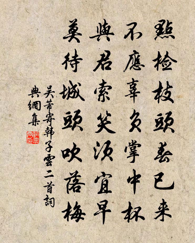 詩詞名句歷史字典書法欣賞書法字典國語詞典說文解字康熙字典古漢語字典標 題 作 者 詩 句 寄韓子云二首作者:吳芾 朝代:宋代寄韓子云二首原文點檢枝頭春已來,不應辜負掌中杯。與君索笑須宜早,莫待城頭吹落梅。詩詞問答問:寄韓子云二首的作者是誰?答:吳芾問:寄韓子云二首寫於哪個朝代?答:宋代吳芾寄韓子云二首書法欣賞寄韓子云二首書法作品詩詞推薦和韓毅伯擬別王炎〔宋代〕踉蹡揖客客為誰,依舊驪珠色陸離。不謂遠遊來此地,未能小隱待何時。慣看覆手仍翻手,休問開眉與皺眉。歸去桐廬縣釋文珦〔宋代〕瀟灑桐廬縣,名聞漢代余。民風尚耕釣,土物富薪蔬。江水連衢港,雲山帶越墟。終期置茅屋,鄰近釣台居。贈易道士趙師秀〔宋代〕仙帔畫霞雪,多年侍玉宸。古於莊子貌,貴似呂公身。詩好當開板,丹靈不化銀。舊山新築觀,惟夢得歸頻。滿江紅(大熱臥疾,浸石種蒲,強作涼想)朱敦儒〔宋代〕竹翠陰森,寒泉浸、幾峰奇石。銷畏日、溪蒲呈秀,水蕉供碧。筠簟平鋪光欲動,紗B23B高掛空無色。似月明遣僧通嗣書釋悟本〔宋代〕射殺南山老大蟲,行人從此路頭通。年來獵犬渾無用,臥對千峰與萬峰。上已日予與沈虞卿、尤延之、莫仲謙招陸務觀楊萬里〔宋代〕東風吹我入錦幄,海棠點注燕支薄。不論宜雨更宜晴,莫愁傾國與傾城。半濃半淡晚明滅,欲開未開最奇絕。只銷即事三首劉克莊〔宋代〕抽簪脫袴滿城忙,大半人多在戲場。膈膊雞猶金爪距,勃跳狙亦袞衣裳。湘纍無奈眾人醉,魯蠟曾令一國狂。空巷清平樂晏幾道〔宋代〕可憐嬌小,掌上承恩早。把鏡不知人易老,欲占朱顏長好。畫堂秋月佳期,藏鉤賭酒歸遲。紅燭淚前低語,綠箋花歸雁范仲淹〔宋代〕稻梁留不得,一一起江天。帶雪南離楚,和春北入燕。依依前伴侶,歷歷舊山川。林葉程猶遠,梅花信可傳。子規米元章賞心詩帖贊岳珂〔宋代〕金陵之賞心,天下之奇觀,真足以當南宮之詩翰。予之持節登覽大一旦,而得此詩八年之泮奐。吁嗟公兮,豈料百戰城南李白〔唐代〕去年戰,桑乾源,今年戰,蔥河道。洗兵條支海上波,放馬天山雪中草。萬里長征戰,三軍盡衰老。匈奴以殺戮為山家司馬光〔宋代〕林下脫雙履,窗邊掛幅巾。閒堂風掩戶,斷嶺月窺人。建安遣興陸游〔宋代〕錦城重到嘆無期,忽憶書台步月時。白浪黏天鮫鱷橫,夢中識路亦何為?用韻贈傅學士兼述懷思古洪皓〔宋代〕萬里求成質鬼神,頻年虎執誤斯民。忘憂每藉杯中物,積閨頻迎塞外春。顧我蹣跚仍久困,觀君慷慨豈長貧。如聞客意陸游〔宋代〕山行曳杖水拏舟,走遍茫茫禹畫州。蝴蝶夢魂常是客,芭蕉身世不禁秋。早因食少妨高臥,晚憶茶甘作遠遊。龍焙冬日陸游〔宋代〕客至惟清坐,真貧不是慳。援琴排遣悶,合藥破除閒。引鶴時穿屐,逢梅一破顏。怪來寒徹骨,夜雪冒南山。謝夢庵居士性宗集釋智愚〔宋代〕性本無宗夢亦非,萬機難透一真機。有時暗與乾坤合,笑看春花秋葉飛。新月陳著〔宋代〕老天大巧亦兒嬉,磨出霜鐮僅一眉。掛向西園瘦梅樹,閒心渾怯損南枝。題汪水雲詩卷秦嗣彭〔宋代〕禾黍興悲兩鬢皤,千年荊棘幾銅駝。義熙處士流風遠,天寶詩人舊恨多。雨露又新周草木,煙塵空想漢山河。庾郎客中二絕李流謙〔宋代〕客中有夢自難成,未了風聲又雨聲。二十五聲秋夜點,誰人數得甚分明。名句推薦粉骨碎身全不怕,要留清白在人間。于謙《石灰吟》 歌里千重意,才欲歌時淚已流,恨應更、多於淚杜安世《卜運算元·樽前一曲歌》 燕子來時新社,梨花落後清明。晏殊《破陣子·春景》 差之毫厘,失之千里。佚名《增廣賢文·上集》 誰知萬里客,懷古正躊躕。陳子昂《峴山懷古》 春日游,杏花吹滿頭。韋莊《思帝鄉·春日游》 萬里辭家事鼓鼙,金陵驛路楚雲西。劉長卿《送李判官之潤州行營》 未能拋得杭州去,一半勾留是此湖。白居易《春題湖上》 鐵衣霜露重,戰馬歲年深。戎昱《塞下曲·其六》 對此懷素心,千里共明月德隱《新秋晚眺》