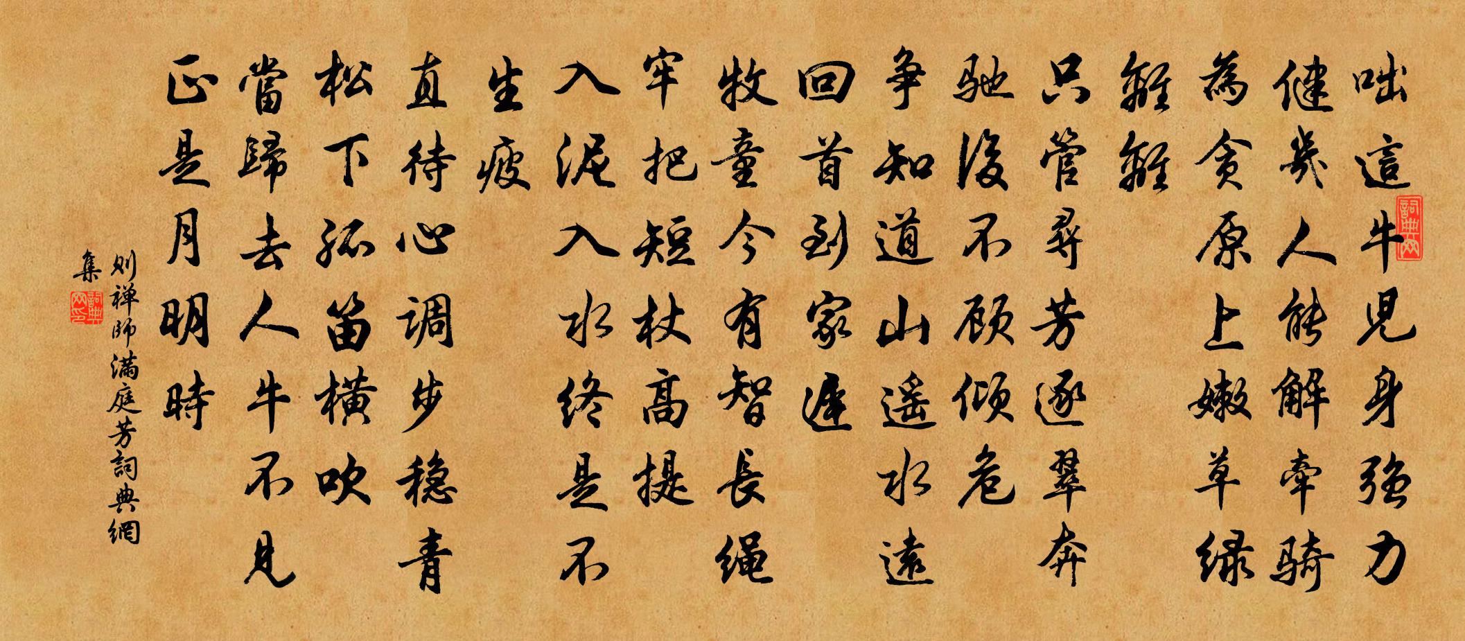 詩詞名句歷史字典書法欣賞書法字典國語詞典說文解字康熙字典古漢語字典標 題 作 者 詩 句 滿庭芳作者:則禪師 朝代:宋代滿庭芳原文咄這牛兒,身強力健,幾人能解牽騎。為貪原上,嫩草綠離離。只管尋芳逐翠,賓士後、不顧傾危。爭知道,山遙水遠,回首到家遲。牧童,今有智,長繩牢把,短杖高提。入泥入水,終是不生疲。直待心調步穩,青松下、孤笛橫吹。當歸去,人牛不見,正是月明時。詩詞問答問:滿庭芳的作者是誰?答:則禪師問:滿庭芳寫於哪個朝代?答:宋代問:滿庭芳是什麼體裁?答:詞則禪師滿庭芳書法欣賞滿庭芳書法作品詩詞推薦安期生蘇軾〔宋代〕安期本策士,平日交蒯通。嘗乾重瞳子,不見隆準公。應如魯仲連,抵掌吐長虹。難堪踞床洗,寧挹扛鼎雄。事既句孔文仲〔宋代〕一莖青竹初出水,數個黃蜂占作窠。望江南張繼先〔宋代〕西源好,神洞自相求。傍水墾田流澗急,砍山開徑小花浮。蹤跡舊人留。忘萬物,爽氣白雲收。司命暫曾尋寢靜,送談星辰吳山人楊萬里〔宋代〕牙籌入手風前快,玉李行天鏡里看。紫闈青規吾不夢,子言欲試故應難。和昌英叔夏至喜雨楊萬里〔宋代〕清酣暑雨不緣求,猶似梅黃麥欲秋。去歲如今禾半死,吾曹遍禱汗交流。此生未用慍三已,一飽便應喔四休。花外送黃仲委秉少卿知瀘州二首楊萬里〔宋代〕補外公何辛,來歸我尚留。還為萬里別,又費半生愁。安得欹黃帽,相從卻白頭?醉中有話在,欲說忘來休。游道岩觀有引鄧希恕〔宋代〕乘雲不到玉皇家,岩上仙桃幾度花。今日喜偕三益友,看來丹灶煉黃芽。游道謙庵張嵲〔宋代〕中宵澍雨平明歇,諸嶺晴陰各自分。偶來共就藜壯坐,時看前山出白雲。道中登嶺趙汝績〔宋代〕慚愧輕輿寄仆肩,蛇蟠小逕入層巔。升高但覺少平地,視下方知在半天。尺壠寸田皆石級,堵牆椽屋即人煙。客程酬嚴給事(聞玉蕊花下有遊仙絕句)白居易〔唐代〕嬴女偷乘鳳去時,洞中潛歇弄瓊枝。不緣啼鳥春饒舌,青瑣仙郎可得知。句嚴陵士人〔宋代〕大柄如歸手,蚊虻莫浪飛。上田僕射王建〔唐代〕一方新地隔河煙,曾接諸生聽管弦。卻憶去年寒食會,看花猶在水堂前。落葉孔武仲〔宋代〕落葉不到地,隨風復飄揚。凋殘北窗陰,凌亂日西光。時節如未已,烏鳥情亦傷。何事千丈松,歲晚仍蒼蒼。將過湖南經馬當山廟因書三絕杜荀鶴〔唐代〕人說馬當波浪險,我經波浪似通衢。大凡君子行藏是,自有龍神衛過湖。貪殘官吏虔誠謁,毒害商人瀝膽過。只怕永遇樂史浩〔宋代〕桃李繁華,芰荷清淨,景物相繼。霜後橙黃,雪中梅綻,迤邐春還至。尋思天氣,寒暄涼燠,各有一時樂地。如何愁徐夤〔唐代〕夜長偏覺漏聲遲,往往隨歌慘翠眉。黃葉落催砧杵日,子規啼破夢魂時。明妃去泣千行淚,蔡琰歸梳兩鬢絲。四皓重餞李九時毅賦得南樓月揭傒斯〔元代〕娟娟臨古戍,晃晃辭煙樹。寒通雲夢深,白映蒼祠莫。胡床看逾近,楚酒愁難駐。雁背欲成霜,林梢初泫露。故人月岩吳儆〔宋代〕題詩山寺不勝多,人力爭如造物何。 安得短蓬岩下漱,長看清影照寒波。 塞上陸游〔宋代〕塞上今年有事宜,將軍承詔出全師。精金錯落八尺馬,刺繡鮮明五丈旗。上谷飛狐傳號令,蕭關積石列城陴。不應曲肱詩二十首白玉蟾〔宋代〕我有隨身一顆珠,見時似有覓時無。金雞叫罷無人見,月射寒光滿太虛。名句推薦芳草已雲暮,故人殊未來。韋莊《章台夜思》 獨自莫憑欄,無限江山,別時容易見時難。李煜《浪淘沙令·簾外雨潺潺》 右手畫圓,左手畫方,不能兩成。韓非及後人《韓非子·功名》 虢國夫人承主恩,平明騎馬入宮門。張祜《集靈台·其二》 舍南舍北皆春水,但見群鷗日日來。杜甫《客至》 城上春雲覆苑牆,江亭晚色靜年芳。杜甫《曲江對雨》 氣相得則和,不相得則病佚名《黃帝內經·素問·五運行大論》 天地無全功,聖人無全能,萬物無全用。列子及其弟子《列子·天瑞》 北風其涼,雨雪其雱。佚名《北風》 夫人雖有性質美而心辯知,必將求賢師而事之荀子《荀子·性惡》