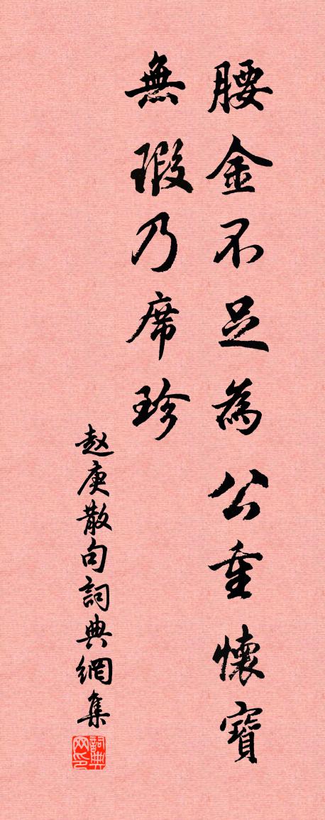 詩詞名句歷史字典書法欣賞書法字典國語詞典說文解字康熙字典古漢語字典標 題 作 者 詩 句 句作者:趙庚 朝代:宋代句原文腰金不足為公重,懷寶無瑕乃席珍。詩詞問答問:句的作者是誰?答:趙庚問:句寫於哪個朝代?答:宋代趙庚句書法欣賞句書法作品詩詞推薦密庵和尚贊釋智遇〔宋代〕行腳不到大徹堂前,剛要凌滅應庵門戶。指柳罵楊,吹沙嗅士,卻笑謝郎憂慮忒豎。欲識中峰個裡人,無尾大早不贈李將軍溫庭筠〔唐代〕誰言荀羨愛功勳,年少登壇眾所聞。曾以能書稱內史,又因明易號將軍。金溝故事春長在,玉軸遺文火半焚。不學唐懿仲諸公見過,小飲凌寒殘梅之下二絕范成大〔宋代〕春風動是隔年期,更對殘花把一卮。少待和煙和月看,依稀猶似未開時。五哀詩故太子中允知洛陽縣潁公王禹偁〔宋代〕洛陽富文彩,峭拔四子流。提筆入廣場,辭氣乾鬥牛。擢第在芸閣,言事觸冕旒。左降宰百里,道勝心無憂。才高夜坐中庭陸游〔宋代〕蕭散坐中庭,三更月未生。溯風涼醉頰,汲井濯塵纓。草露沾衣冷,天河隔樹明。裴回不能睡,鼓角下高城。休糧僧貫休〔唐代〕不食更何憂,自由中自由。身輕嫌衲重,天旱為民愁。應器誰將去,生台蟻不游。會須傳此術,相共老山丘。寓東陽劉過〔宋代〕元帥東陽主,令群吾故人。可憐九華客,猶是一窮民。古者狂狷士,人間自在身。化工都不管,何地有陽春。湖中夕泛歸南屏四絕釋道濟〔宋代〕湖上春光已破慳,湖邊楊柳拂雕闌。算來不用一文買,輸與山僧閒往還。秋思二首張仲素〔唐代〕碧窗斜日藹深暉,愁聽寒螿淚濕衣。夢裡分明見關塞,不知何路向金微。秋天一夜靜無雲,斷續鴻聲到曉聞。欲寄送客至無相蘭若歸過慈雲嶺小憩崇壽寺書所見張鎡〔宋代〕南山好處劉家寺,門裡松篁一逕沖。自有禽聲喜迎客,不須知事更鳴鐘。亞尹黃侯慮囚溫處婺三州戴表元〔宋代〕金華環秀抵仙都,雁宕石門天下無。眼見朱幡出雲霧,手提丹筆洗焦枯。海魚味爽休多食,嶺馬程艱合緩驅。定有野興陸游〔宋代〕早見高皇宇宙新,耄年猶作太平民。虛名僅可欺橫目,戇論曾經犯逆鱗。原野暮雲低欲雨,陂湖秋水浩無津。蕭條冬夜有懷柯田山人四首張元乾〔宋代〕聞說新居好,山樊卜築深。藥囊能濟物,龜策少知音。四海憂黔首,中原盡綠林。直須期雲屋,夜棹去相尋。答陳琯修職劉克莊〔宋代〕陳氏源流遠,吾猶及紀群。昔惟知伯氏,今又識郎君。後學尊師友,先賢賤藝文。滄洲書冊在,努力緝前聞。早秋二絕宋祁〔宋代〕斜規脈脈霞底去,早涼蕭蕭林際歸。年華搖落適誰怨,伯勞燕子東西飛。金井怨曹鄴〔唐代〕西風吹急景,美人照金井。不見面上花,卻恨井中影。夜泊陳昂〔明代〕此地知何處?扁舟系小亭。孤村低臥水,野屋大於瓶。卻少犁鋤樂,尚余鋒鏑腥。白頭萬里客,仰愧老人星。答馬侍御見贈白居易〔唐代〕謬入金門侍玉除,煩君問我意何如?蟠木詎堪明主用,籠禽徒與故人疏。苑花似雪同隨輦,宮月如眉伴直廬。淺薄晚寒(晚一作暝)白居易〔唐代〕急景流如箭,淒風利似刀。暝催雞翅斂,寒束樹枝高。縮水濃和酒,加綿厚絮袍。可憐冬計畢,暖臥醉陶陶。句晏殊〔宋代〕未暇南浮海,何妨夜把螯。名句推薦離愁正引千絲亂,更東陌、飛絮蒙蒙張先《一叢花令·傷高懷遠幾時窮》 律回歲晚冰霜少,春到人間草木知。張栻《立春偶成》 一年最好,偏是重陽。吳文英《惜黃花慢·菊》 為君憔悴盡,百花時。溫庭筠《南歌子·倭墮低梳髻》 鄉書何處達?歸雁洛陽邊。王灣《次北固山下》 水上遊人沙上女,回顧,笑指芭蕉林里住。歐陽炯《南鄉子·畫舸停橈》 招魂楚些何嗟及,山鬼暗啼風雨。元好問《摸魚兒·雁丘詞 / 邁陂塘》 待人寬一分是福,利人實利己的根基。洪應明《菜根譚·概論》 無功不賞,無罪不罰。荀子《荀子·王制》 烏鳥之狡,雖善不親。不重之結,雖固必解管仲《管子·形勢》