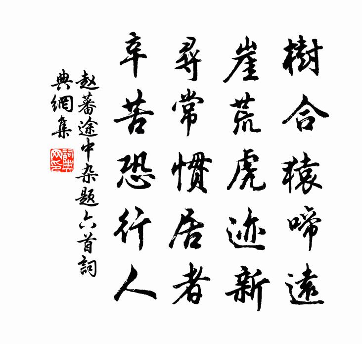 詩詞名句歷史字典書法欣賞書法字典國語詞典說文解字康熙字典古漢語字典標 題 作 者 詩 句 途中雜題六首作者:趙蕃 朝代:宋代途中雜題六首原文樹合猿啼遠,崖荒虎跡新。尋常慣居者,辛苦恐行人。詩詞問答問:途中雜題六首的作者是誰?答:趙蕃問:途中雜題六首寫於哪個朝代?答:宋代趙蕃途中雜題六首書法欣賞途中雜題六首書法作品詩詞推薦曲江亭晚望白居易〔唐代〕曲江岸北憑欄乾,水面陰生日腳殘。塵路行多綠袍故,風亭立久白須寒。詩成暗著閒心記,山好遙偷病眼看。不被偶成楊時〔宋代〕天遠何須問,勞生聽若何。犂鋤三畝足,棲息一枝多。白雪寧堪冒,清時只浪過。好尋明月影,醉舞自婆娑。昨日雪已佳約李令希孝晁補之〔宋代〕昨日雪已佳,今日雨亦好。冰膚解萬木,洗濯見枯槁。思君對此坐,孤詠廢幽討。明日尚相期,春禽聽清曉。有感今昔二首范成大〔宋代〕飄風驟雨謾驚春,掃蕩何煩臂屈伸。天識不衷宜不恕,神歆非類即非仁。休讎地下枯魚骨,且斗尊前健犢身。靜看參軍廳新池薛能〔唐代〕簾外無塵勝物外,牆根有竹似山根。流泉不至客來久,坐見新池落舊痕。錢唐見芮逢羅隱〔唐代〕蔡倫池北雁峰前,罹亂相兼十九年。所喜故人猶會面,不堪良牧已重泉。醉思把箸欹歌席,狂憶判身入酒船。今日送邢大聲宏音二首趙蕃〔宋代〕不獨論新昏,晏晁原老親。見來能幾日,別去忽今晨。新地無遷賈,明時豈避秦。長沙武陵地,行樂異傷神。綠頭鴨王哲〔元代〕嘆平生,景光奔走萬*。得名牽。休空勞攘,不須頻苦孜煎。這榮耀、趁時顯現,似風燭終勿牢堅。走玉常催,飛西軒賞芍藥羅原知〔宋代〕不用胭脂涴玉姿,精神偏在月明時。憑將一盞澆妝酒,博得花陰無限詩。二月二日阻風呈風行趙蕃〔宋代〕平居說江湖,似若苦饑渴。及今落吾手,謂可娛朝夕。胡為連日行,乃復形嘆息。使風不終朝,阻風有並日。欲行邂逅南昌簿孫正之劇談別後聊以記所期者曾豐〔宋代〕三秦擅淮石,三孔專江西。鼎足立世穩,文匠詩宗師。吾生亦太晚,流風殆誰歸。龍泉劍之精,夜氣貫斗箕。今其卜運算元(惜海棠)劉克莊〔宋代〕儘是手成持,合得天饒借。風雨於花有底讎,著意相陵藉。做暖逼教開,做冷催教謝。不負明年花下人,只負栽花紹興祈谷三首佚名〔宋代〕天錫勇智,允惟太宗。功隆德盛,興帝比崇。記岩陟配,誠過精長。尚其錫祉,幾以屢豈。游靈岩和韻三首李壁〔宋代〕蕭然陳跡寄林坰,千古誰分偽與真。惟有離宮歌舞地,遺簪墜珥付耕人。池邊即事白居易〔唐代〕氈帳胡琴出塞曲,蘭塘越棹弄潮聲。何言此處同風月,薊北江南萬里情。雜興十首劉克莊〔宋代〕曾忝開元供奉班,君恩全護放還山。諸公縱慾俎豆汝,老子安能筆硯間。試拂毛錐嗟已禿,便扶靈壽亦何顏。回頭玉漏遲樓采〔宋代〕絮花寒食路。晴絲罥日,綠陰吹霧。客帽欺風,愁滿畫船煙浦。彩柱鞦韆散後,悵塵鎖、燕簾鶯戶。從間阻。夢雲道中二首宋祁〔宋代〕故歲南趨壽,今茲北向陳。淹留桂枝客,還入玉關人。鬢髮都成葆,纓瓖幸濯塵。心知來往數,不敢問迷津。鬬鷄宋庠〔宋代〕對壘毰毸地,雙驚滅玉塵。長鳴非後郭,利嘴欲專秦。鴟領聊延敵,鷹揚願殺身。君恩定多少,引距即隨人。琴易士達〔宋代〕花間橫膝興何深,流水高山幾古今。一自杏壇聲響絕,不知誰解繼遺音。名句推薦夫魚食其餌,乃牽於緡;人食其祿,乃服於君。姜子牙《六韜·文韜·文師》 世上萬般哀苦事,無非死別與生離。馮夢龍《醒世恆言·卷十九》 孔雀東南飛,五里一徘徊。佚名《孔雀東南飛 / 古詩為焦仲卿妻作》 朗月清風,濃煙暗雨,天教憔悴度芳姿。李清照《多麗·詠白菊》 翅低白雁飛仍重,舌澀黃鸝語未成。白居易《南湖早春》 幾度思歸還把酒,拂雲堆上祝明妃。杜牧《題木蘭廟》 河橋送人處,涼夜何其。周邦彥《夜飛鵲·河橋送人處》 閣雪雲低,卷沙風急,驚雁失序。吳文英《永遇樂·探梅次時齋韻》 刑稱罪,則治;不稱罪,則亂。荀子《荀子·正論》 孔子亦矙其亡也,而往拜之。孟子《孟子·滕文公章句下·第七節》