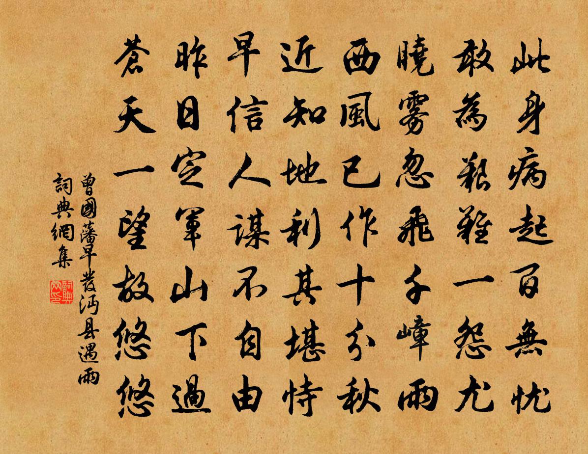 詩詞名句歷史字典書法欣賞書法字典國語詞典說文解字康熙字典古漢語字典標 題 作 者 詩 句 早發沔縣遇雨作者:曾國藩 朝代:清代早發沔縣遇雨原文此身病起百無憂,敢為艱難一怨尤。曉霧忽飛千嶂雨,西風已作十分秋。近知地利其堪恃,早信人謀不自由。昨日定軍山下過,蒼天一望故悠悠。詩詞問答問:早發沔縣遇雨的作者是誰?答:曾國藩問:早發沔縣遇雨寫於哪個朝代?答:清代曾國藩早發沔縣遇雨書法欣賞早發沔縣遇雨書法作品詩詞推薦食枸杞趙蕃〔宋代〕誰道春風未發生,杞苗試摘已堪羹。莫將口腹為人累,竹瘦殊勝豕腹亨。平湖秋月乾隆〔清代〕春水初生綠似油,新蛾瀉影鏡光柔。待予重命行秋棹,飽弄金波萬里流。拼桑得替題道院宋伯仁〔宋代〕煮海三年不等閒,幾多歸夢繞青山。鳶肩詩瘦羞郊島,蝸角名虛愧觸蠻。戈淅劍炊恬砑耐,雲翻雨覆任痴頑。知機秦後作曹鄴〔唐代〕大道不居謙,八荒安苟得。木中不生火,高殿禍頃刻。誰將白帝子,踐我禮義域。空持拔山志,欲奪天地德。軹道賽神曲王建〔唐代〕男抱琵琶女作舞,主人再拜聽神語。新婦上酒勿辭勤,使爾舅姑無所苦。椒漿湛湛桂座新,一雙長箭系紅巾。但願尚書左丞贈開府儀同三司鄧公輓辭三首蘇頌〔宋代〕氣緼江山秀,人如圭璧溫。一登文石陛,遂直紫微垣。論議中司見,謀猷內制存。公孫宿儒譽,垂老上金門。遣騎問訊范明州參政,報章寄二絕句和韻謝之楊萬里〔宋代〕一別姑蘇江上台,綠波碧草恨悠哉。忽然兩袖珠璣滿,割取三吳風月來。頌證道歌證道歌釋印肅〔宋代〕淨五眼,得五力,五通曾告瞿曇覓。證知見覺不相干,因邪打正連天碧。寄林可山胡仲弓〔宋代〕相去各天涯,江湖會面遲。數年不通問,一見便言詩。近世無和靖,今人說項斯。孤山梅已熟,滋味獨君知。題本覺寺趙善括〔宋代〕春禽嚼徵更含宮,喚我精藍路易窮。雨雪不垂成暮靄,花開都盡怨東風。一川芳草低隨水,滿眼青山半插空。躍馬送溫州學正陳希靜方回〔宋代〕多士推溫學,耆儒佐冷官。雖為絳帳亞,似可綿衣看。父老時枌社,師生日杏壇。在家書宦考,三歲定朝端。題倪處士舊居許渾〔唐代〕儒翁九十餘,舊向此山居。生寄一壺酒,死留千卷書。檻摧新竹少,池淺故蓮疏。但有子孫在,帶經還荷鋤。宮詞王仲修〔宋代〕春深百卉過芬芳,雕檻惟余芍藥香。應是東君偏著意,日華浮動御衣黃。觀馬院洗馬曹勛〔宋代〕本靡相踶性不同,金環壓轡照晴空。晚來洗罷游韁緩,喜聽驕嘶岸柳風。點絳唇佚名〔宋代〕二氣工夫,河車搬入崑崙腦。世人誰曉。此是玄元道。存得陽精,年老身不老。三田飽。行功都了。拂袖游蓬島。聞彥執熙仲有辣螺詩聊復有作張九成〔宋代〕乾坤中空繞滄溟,千奇百怪斗露形。鯨鯢黿鼉突相撐,蚶蜃蚌蛤角介獰。是中有物入眼生,羊腸蟻垤紛縱橫。入口移耶溪舊居呈陳元初校書陳孫〔唐代〕雞犬漁舟里,長謠任興行。即令邀客醉,已被遠山迎。書笈將非重,荷衣著甚輕。謝安無個事,忽起為蒼生。奉贈李八丈判官(曛)杜甫〔唐代〕我丈時英特,宗枝神堯後。珊瑚市則無,騄驥人得有。早年見標格,秀氣沖星斗。事業富清機,官曹正獨守。頃來成都蕭遘〔唐代〕月曉已開花市合,江平偏見竹簰多。好教載取芳菲樹,剩照岷天瑟瑟波。四言詩十一首 其四嵇康〔兩漢〕斂弦散思。游釣九淵。重流千仞。或餌者懸。猗與莊老。棲遲永年。寔惟龍化。盪志浩然。名句推薦對秋深,離恨苦,數夜滿庭風雨。孫光憲《更漏子·對秋深》 啼鶯舞燕,小橋流水飛紅。白樸《天淨沙·春》 冬夜兮陶陶,雨雪兮冥冥。王逸《九思》 送君如昨日,檐前露已團。江淹《古離別》 村北村南,穀雨才耕遍。范成大《蝶戀花·春漲一篙添水面》 聽元宵,往歲喧譁,歌也千家,舞也千家。王磐《古蟾宮·元宵》 君子之澤五世而斬孟子《孟子·離婁章句下·第二十二節》 一上高城萬里愁,蒹葭楊柳似汀洲。許渾《鹹陽城東樓 / 鹹陽城西樓晚眺 / 西門》 情如之何,暮塗為客,忍堪送君。吳文英《沁園春·送翁賓暘游鄂渚》 巧偽不如拙誠顏之推《顏氏家訓·名實篇》