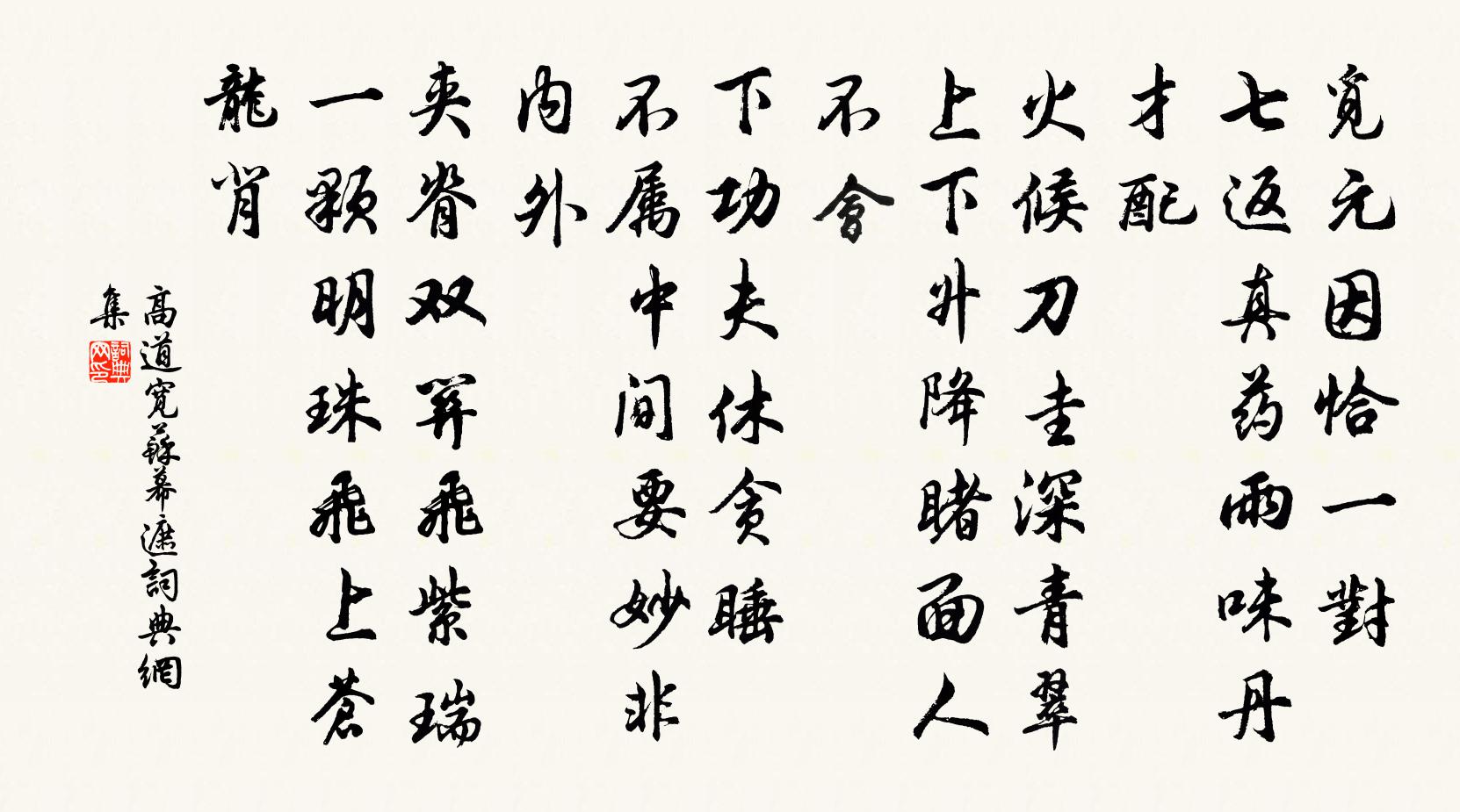 詩詞名句歷史字典書法欣賞書法字典國語詞典說文解字康熙字典古漢語字典標 題 作 者 詩 句 蘇幕遮作者:高道寬 朝代:元代蘇幕遮原文覓元因,恰一對。七返真藥,雨味丹才配。火候刀圭深青翠。上下升降,睹面人不會。下功夫,休貪睡。不屬中間,要妙非內外。夾脊雙關飛紫瑞。一顆明珠,飛上蒼龍背。詩詞問答問:蘇幕遮的作者是誰?答:高道寬問:蘇幕遮寫於哪個朝代?答:元代問:蘇幕遮是什麼體裁?答:詞高道寬蘇幕遮書法欣賞蘇幕遮書法作品詩詞推薦句楊蟠〔宋代〕動搖臘信隨征使,勾引春情出苑牆。錢清登舟釋紹嵩〔宋代〕日落相攜上小舟,客程難盡水空流。瀟瀟細雨蓬初閉,萬里一帆隨白鷗。送陸侍御餘慶北使沈佺期〔唐代〕古人貴將命,之子出輶軒。受委當不辱,隨時敢贈言。朔途際遼海,春思繞轘轅。安得回白日,留歡盡綠樽。送青苗鄭判官歸江西劉長卿〔唐代〕三苗餘古地,五稼滿秋田。來問周公稅,歸輸漢俸錢。江城寒背日,湓水暮連天。南楚凋殘後,疲民賴爾憐。百丈潭陳岩〔宋代〕目觀溶溶眩水精,耳根虩虩受雷聲。一杯更吸潭間味,並要胸中領此清。二月三十日方回〔宋代〕酒病專欺老,詩材苦欠新。客窗廬阜雨,故圃洛花香。歲支江聲急,家人夜夢頻。遙知掃松處,筍茗正芳辛。欄邊吳濟〔宋代〕潮信欄邊見,人家樹杪分。筍鞭遮過蟻,蛛網礙飛蚊。松古藏靈藥,山高落冷雲。吾廬遠城市,花草故欣欣。冬夜宴梁十三廳戎昱〔唐代〕故人能愛客,秉燭會吾曹。家為朋徒罄,心緣翰墨勞。夜寒銷臘酒,霜冷重綈袍。醉臥西窗下,時聞雁響高。東山俞桂〔宋代〕東山隨分作生涯,即是清高隱者家。粗有小園供日涉,不愁無地種梅花。感事鄭清之〔宋代〕退之硫黃藥成疾,伯仁金印恩為仇。眼前世事盡如此,十日峭寒春作秋。長安縣後亭看畫王建〔唐代〕水凍橫橋雪滿池,新排石筍繞巴籬。縣門斜掩無人吏,看畫雙飛白鷺鷥。胡季永輓詞二首楊萬里〔宋代〕一昨官都下,同時寄客間。相從湖上寺,覽遍浙西山。駿足應千里,彪文未一班。霜風吹病眼,老淚為渠潸。晚春歸思王維〔唐代〕新妝可憐色,落日卷羅帷。爐氣清珍簟,牆陰上玉墀。春蟲飛網戶,暮雀隱花枝。向晚多愁思,閒窗桃李時。花前獨酌二絕句姚孝錫〔宋代〕粉署標名舊,山城識面新。青雲摧勸翮,空谷滯幽人。世路謀身拙,心田育德醇。久要知可卜,傾蓋已情親。句竇叔向〔唐代〕禁兵環素帟,宮女哭寒雲。(《哀輓》第三首,止存二句。見《聯珠集敘》)。贈張童子真德秀〔宋代〕聞君早號張童子,雇我初非韓退之。可惜浪拋洙江業,只看風鑒學希夷。二十四夜夢到何許植物多瑞香覺而賦此艾性夫〔宋代〕春風吹我遊仙夢,夢到廬山頂上來。不記花多與花少,怳然如步紫雲回。寄題元華書齋宋祁〔宋代〕比日投簪隱,孟逢列舍椽。值岩因鑿牖,仍磵即疏泉。斧爛仙棋路,花飛佛雨天。諫帷他夜夢,猶在翠微顛。海上載筆依韻酬左偃見寄李中〔唐代〕都城分別後,海嶠夢魂迷。吟興疏煙月,邊情起鼓鼙。戍旗風颭小,營柳霧籠低。草檄無餘刃,難將阮瑀齊。秋蝶白居易〔唐代〕秋花紫蒙蒙,秋蝶黃茸茸。花低蝶新小,飛戲叢西東。日暮涼風來,紛紛花落叢。夜深白露冷,蝶已死叢中。朝生名句推薦以身教者從,以言教者訟。范曄《後漢書·列傳·第五鍾離宋寒列傳》 繁枝容易紛紛落,嫩葉商量細細開。杜甫《江畔獨步尋花七絕句》 碧野朱橋當日事,人不見,水空流。秦觀《江城子·西城楊柳弄春柔》 念佳人、音塵別後,對此應解相思。晁端禮《綠頭鴨·詠月》 紅樹青山日欲斜,長郊草色綠無涯。歐陽修《豐樂亭遊春·其三》 攜扙來追柳外涼,畫橋南畔倚胡床。秦觀《納涼》 油壁香車不再逢,峽雲無跡任西東。晏殊《無題·油壁香車不再逢》 深宮桃李無人問,舊愛玉顏今自恨。元好問《玉樓春·驚沙獵獵風成陣》 春風十里揚州路,卷上珠簾總不如。杜牧《贈別》 丈夫不能再辱。班固《漢書·傳·李廣蘇建傳》