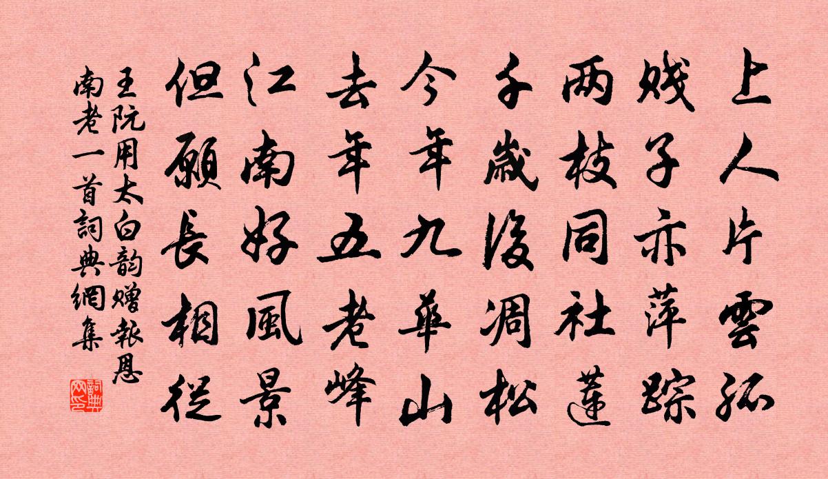 詩詞名句歷史字典書法欣賞書法字典國語詞典說文解字康熙字典古漢語字典標 題 作 者 詩 句 用太白韻贈報恩南老一首作者:王阮 朝代:宋代用太白韻贈報恩南老一首原文上人片雲孤,賤子亦萍蹤。兩枝同社蓮,千歲後凋松。今年九華山,去年五老峰。江南好風景,但願長相從。詩詞問答問:用太白韻贈報恩南老一首的作者是誰?答:王阮問:用太白韻贈報恩南老一首寫於哪個朝代?答:宋代王阮用太白韻贈報恩南老一首書法欣賞用太白韻贈報恩南老一首書法作品詩詞推薦過陸鴻漸舊居齊己〔唐代〕楚客西來過舊居,讀碑尋傳見終初。佯狂未必輕儒業,高尚何妨誦佛書。種竹岸香連菡萏,煮茶泉影落蟾蜍。如今偈頌十七首釋師範〔宋代〕言無展事,語不投機。承言者喪,滯句者迷。千頃廨院小憩老僧舊爇左臂乾緣寶叔塔一絕憫錢時〔宋代〕見說當年老比丘,茶毗一臂作重修。山頭寶叔成新塔,泉下應貽父母憂。伊周衛宗武〔宋代〕誓征黜夏命,武成有商邑。惟王弗率祖,沖人初嗣因。既放奉歸毫,已攝復明辟。前此所未聞,浮言曾罔恤。二公寒食山館書情來鵠〔唐代〕獨把一杯山館中,每經時節恨飄蓬。侵階草色連朝雨,滿地梨花昨夜風。蜀魄啼來春寂寞,楚魂吟後月朦朧。分明謁金門曾紆〔宋代〕風淅瀝。窗外雪花初積。夢破小窗人寂寂。寒威無處敵。強起飲君涓滴。清淚醉來沾臆。歧路即今多擁隔。弟兄無夜思陸游〔宋代〕風掃浮雲作快晴,窗聲終夜雜簾聲。月明滿院鵲驚起,霜冷壓棲雞嬾鳴。名字虛稱舊朝士,門庭元是老書生。尚余南岩留宿分韻落字戴表元〔宋代〕游觀值暄秋,飲狎得嘉客。嵌岩復在眼,徘徊忘還郭。款款坐向疲,喧喧笑多謔。短檐近見出,竇乳時聞落。防暗將入靖州界適值肩吾生日為詩以壽之魏了翁〔宋代〕道亨初不關窮達,身健何須問去留。但原王明天地泰,此竹長共國同休。再和靜樂鄭清之〔宋代〕夫君論事回天力,期文如貢厥篚織。天葩瑞時來帝傍。天香染衣未渠息。因攜天上白琅玕,散作天花天女識。冰清有感十首吳芾〔宋代〕延福池台荊棘深,上皇無復更登臨。寂寥崇觀當年事,愁絕關河萬里心。清貧軒白玉蟾〔宋代〕一味逍遙不管天,日高丈五尚閒眠。溪魚村酒別般味,野蔌山餚不用錢。翁牖蓽門關小逕,乾柴白米煮清泉。有時次韻解君接感懷李新〔宋代〕能向風塵識馬周,新豐飲盡得相留。後車貫載胡王縛,衰草頻驚戰馬秋。靈武須公來闢土,桃林他日待歸牛。承平三月八日挈家赴官常熟孫應時〔宋代〕又別吾廬去,從今復幾回。宦情真漫爾,世路變悠哉。事業針千里。文章水一不。公田定難必,早擬賦歸來。句宋度宗〔宋代〕歸仁由克已,學道在存心。憶鄉歌四首馮夢得〔宋代〕炎夏天頗熱,儂門對溪住。搖盪採蓮舟,深處疑風露。將入閩夜行之雲門陸游〔宋代〕東騖並偏門,籃輿兀睡昏。紡燈穿壁罅,吠犬闖籬根。久客悲行役,清愁怯夢魂。餘生猶幾齣,回首付乾坤。暮春二十八夜枕上有懷汪莘〔宋代〕邇來尤覺光陰速,晝夜分明似水流。卻是光陰無變動,謾教浮世有春秋。雜詩 其三陶淵明〔魏晉〕榮華難久居,盛衰不可量。昔為三春蕖,今作秋蓮房。嚴霜結野草,枯悴未遽央。日月還復周,我去不再陽。眷眷泛湖十絕句陳造〔宋代〕浦漵樓台遠近殊,樽罍隨處小踟躕。高郎頗勝高常侍,解把西湖敵孟諸。名句推薦驚鳥去無際,寒蛩鳴我傍。馬戴《楚江懷古三首》 故其樂逾繁者,其治逾寡。自此觀之,樂非所以治天下也。墨子《墨子·07章 三辯》 蒲生我池中,其葉何離離。甄宓《塘上行》 空山新雨後,天氣晚來秋。王維《山居秋暝》 死去元知萬事空,但悲不見九州同。陸游《示兒》 沅水通波接武岡,送君不覺有離傷。王昌齡《送柴侍御》 孤雁飛南遊,過庭長哀吟。曹植《雜詩六首·其一》 雪聲偏傍竹,寒夢不離家。戎昱《桂州臘夜》 明日客程還幾許,沾衣況是新寒雨。納蘭性德《蝶戀花·又到綠楊曾折處》 九日登高處,群山入望賒。趙時春《原州九日》