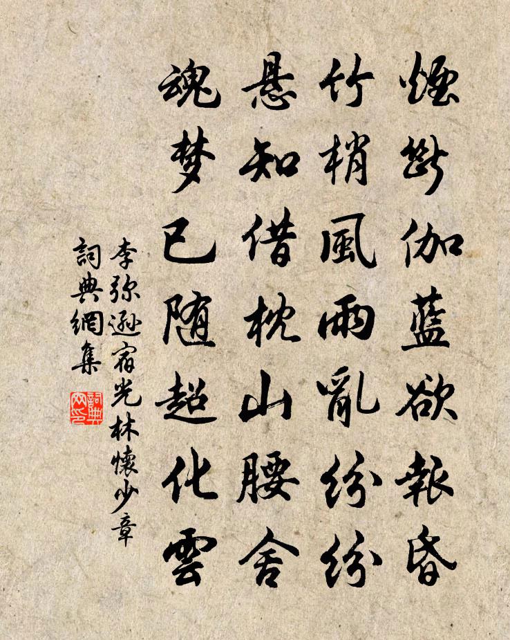 詩詞名句歷史字典書法欣賞書法字典國語詞典說文解字康熙字典古漢語字典標 題 作 者 詩 句 宿光林懷少章作者:李彌遜 朝代:宋代宿光林懷少章原文煙斷伽藍欲報昏,竹梢風雨亂紛紛。懸知借枕山腰舍,魂夢已隨超化雲。詩詞問答問:宿光林懷少章的作者是誰?答:李彌遜問:宿光林懷少章寫於哪個朝代?答:宋代李彌遜宿光林懷少章書法欣賞宿光林懷少章書法作品詩詞推薦真州東園梅堯臣〔宋代〕國賦有常計,計者豈不賢。日夜疲精神,自鑒膏火前。新春力有餘,鋤荒東相偏。壘土以起榭,掘沼以秧蓮。竹柏郊廟歌辭。梁太廟樂舞辭。撤豆佚名〔唐代〕笙鏞洋洋,庭燎煌煌。明星有爛,祝史下堂。籩豆斯撤,禮容有章。克勤克儉,無怠無荒。借丹岩韻貽青溪衛宗武〔宋代〕良朋有約著書催,未到愁雲擬不開。丹穴孤雲宜間見,青溪只鶴喜重來。有誰剖玉明荊璞,愧我無金築隗台。鄭校三月十日曹勛〔宋代〕才看桃李錦成圍,忽使園林綠作堆。遠草將人雙眼去,飛花引蝶過牆來。簿書節里無多著,懷抱朝來得好開。已是和陸司業習靜寄所知張籍〔唐代〕幽室獨焚香,清晨下未央。山開登竹閣,僧到出茶床。收拾新琴譜,封題舊藥方。逍遙無別事,不似在班行。紹興以後祀五方帝六十首佚名〔宋代〕西顥肅清,群生茂遂。有嚴報典,孔明祀事。珪幣告虔,神靈燕喜。麥我豐年,以錫民祉。世事陸游〔宋代〕世事說來猶可厭,宦情夢裡亦應無。山林已結三生願,朝市誰非九折途?醉舞杯盤無藉在,狂吟風月不枝梧。何人和劉汝州酬侍中見寄長句因書集賢坊勝事戲而問之白居易〔唐代〕洛川汝海封畿接,履道集賢來往頻。一復時程雖不遠,百餘步地更相親。[汝去洛程一宿,履道、集賢兩宅相去一和微之詩二十三首和新樓北園偶集,從孫公白居易〔唐代〕聞君新樓宴,下對北園花。主人既賢豪,賓客皆才華。初筵日未高,中飲景已斜。天地為幕席,富貴如泥沙。嵇劉端午帖子太上皇后閣周必大〔宋代〕對席瑤池宴,憑欄競渡船。薰風清漏坐,鉤月夕侵筵。浪淘沙(再和)張榘〔宋代〕雨過暮天南。高下青巒。小樓燕子話春寒。多少夕陽芳草地,霧掩煙漫。別恨正相關。心上眉間。離歌一曲間悲歡存沒口號蘇泂〔宋代〕陶山松柏日夜長,屋下兒孫漸滿堂。當時侍傍五男子,考叔之羹曾未嘗。雜曲歌辭楊白花柳宗元〔唐代〕楊白花,風吹度江水。坐令宮樹無顏色,搖盪春光千萬里。茫茫曉日下長秋,哀歌未斷城鴉起。黃沙書院辛棄疾〔宋代〕隱几南窗萬念灰,只疑土木是形骸。柴門不用常關著,怕有文殊問疾來。簾二首羅隱〔唐代〕疊影重紋映畫堂,玉鉤銀燭共熒煌。會應得見神仙在,休下真珠十二行。翡翠佳名世共稀,玉堂高下巧相宜。殷勤龍女泉袁甫〔宋代〕錄泉何事迸幽岩,龍女分從萬丈潭。一勺之多龍在否,煩君試向此中參。用諸公本韻各和一篇共三首蘇頌〔宋代〕早陪鵷鷺侍丹闈,旋見夔龍陟近司。西閣屢觀新詔草,東曹猶記舊文移。半途霄壤成分異,幾歲江湖役夢思。席面昌谷詩(五月二十七日作)李賀〔唐代〕昌谷五月稻,細青滿平水。遙巒相壓疊,頹綠愁墮地。光潔無秋思,涼曠吹浮媚。竹香滿淒寂,粉節塗生翠。草發南鄉子蕭廷之〔宋代〕盡淨露天機。只恐時人自執迷。頷下藏珠當猛取,休遲。道在身中更問誰。塵綱忽拋離。百歲年華七十稀。莫待老偈頌八十五首釋妙倫〔宋代〕紅日升兮,慧目明而不晦。白雲吐兮,慈容露而不遮。林木交加兮胸題卐字,峰巒重疊兮足躡千花。好個天然古釋名句推薦記取江湖泊船處,臥聞新雁落寒汀。陸游《夜泊水村》 秋雨一何碧,山色倚晴空。方岳《水調歌頭·平山堂用東坡韻》 牽牛織女遙相望,爾獨何辜限河梁。曹丕《燕歌行二首·其一》 用貧求富,農不如工,工不如商。司馬遷《史記·貨殖列傳》 鹿車何日駕,歸去潁東田。歐陽修《秋懷》 繁枝容易紛紛落,嫩葉商量細細開。杜甫《江畔獨步尋花七絕句》 如知其非義,斯速已矣,何待來年。孟子《孟子·滕文公章句下·第八節》 千里之行,始於足下。老子《老子·德經·第六十四章》 讀書不作儒生酸,躍馬西入金城關。謝逸《送董元達》 忽如一夜春風來,千樹萬樹梨花開。岑參《白雪歌送武判官歸京》