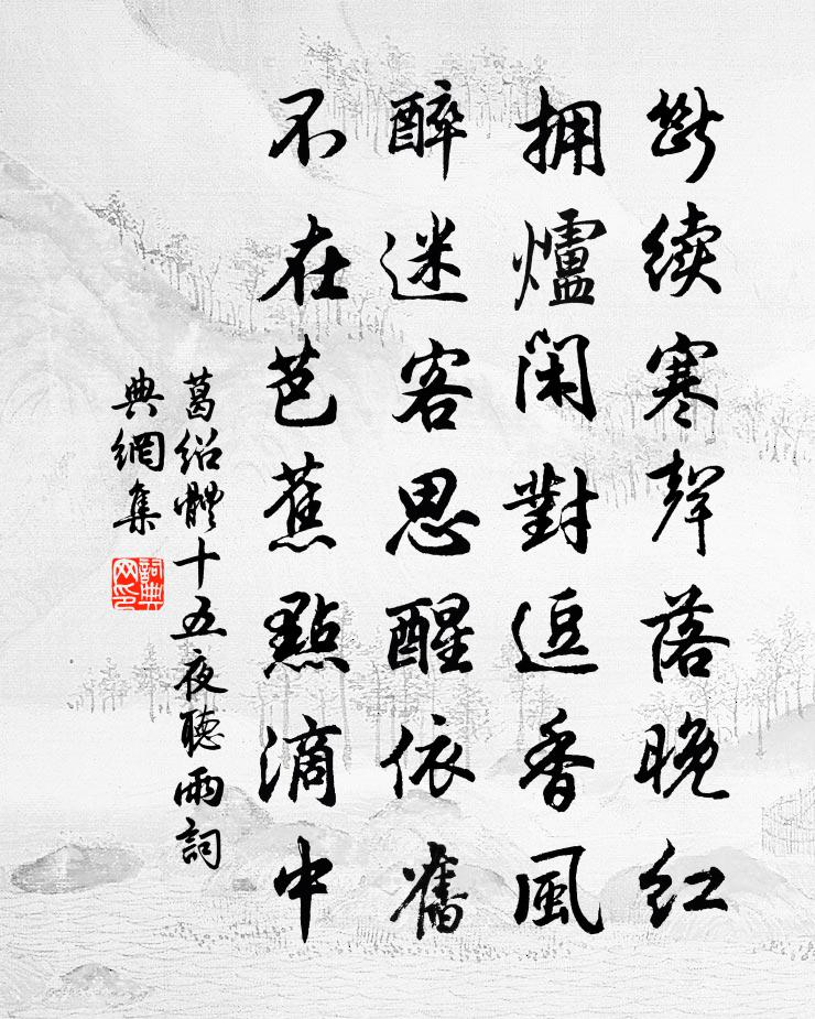 - 林花著雨胭脂濕,水荇牽風翠帶長。杜甫《曲江對雨》
