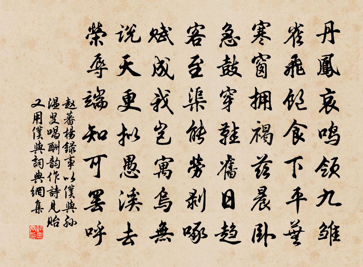 詩詞名句歷史字典書法欣賞書法字典國語詞典說文解字康熙字典古漢語字典標 題 作 者 詩 句 楊錄事以仆與孫溫叟唱酬韻作詩見貽又用仆與作者:趙蕃 朝代:宋代原文丹鳳哀鳴領九雛,雀飛飽食下平蕪。寒窗擁褐茲晨臥,急鼓穿鞋舊日趨。客至渠能勞剝啄,賦成我豈寓烏無。說天更擬愚溪去,榮辱端知可罷呼。詩詞問答問:《楊錄事以仆與孫溫叟唱酬韻作詩見貽又用仆與》的作者是誰?答:趙蕃問:該詩寫於哪個朝代?答:宋代書法欣賞楊錄事以仆與孫溫叟唱酬韻作詩見貽又用仆與書法作品詩文賞析【原題】:楊錄事以仆與孫溫叟唱酬韻作詩見貽又用仆與吳夢與詩韻作詩贈夢與兼以見及並次韻二首詩詞推薦南鄉子吳潛〔宋代〕黃耳訊初收。為說鷗汀與鷺洲。爭問主人歸近遠,颼颼。定是登高九月頭。有酒且相酬。莫管西風滿鬢秋。今日是【雙調】胡十八張養浩〔元代〕正妙年,不覺的老來到。思往常,似昨朝,好光陰流水不相饒,都不如醉了,睡著。任金烏搬廢興,我只推不知道無愁果有愁曲北齊歌李商隱〔唐代〕東有青龍西 * ,中含福星包世度。玉壺渭水笑清潭,鑿天不到牽牛處。騏驎踏雲天馬獰,牛山撼碎珊瑚聲。秋娥殘句:二月探供三月酒王禹偁〔宋代〕二月探供三月酒,今年未得去年錢。江南雜體二首王建〔唐代〕江上風翛翛,竹間湘水流。日夜桂花落,行人去悠悠。復見離別處,蟲聲陰雨秋。處處江草綠,行人發瀟湘。瀟湘題張簿尉槎溪集劉克莊〔宋代〕千載枯槎無主名,才翁子晦各偷撐。分明博望升天訴,不許人間別姓爭。歲晚言事寄鄉中親友方乾〔唐代〕急景蒼茫晝若昏,夜風乾峭觸前軒。寒威半入龍蛇窟,暖氣全歸草樹根。蠟燼凝來多碧焰,香醪滴處有冰痕。尺書雜詩劉楨〔魏晉〕職事相填委。文墨紛消散。馳翰未暇食。日昃不知晏。沉迷簿領間。回回自昏亂。釋此出西域。登高且游觀。方塘大夢誰先覺羅貫中〔明代〕大夢誰先覺?平生我自知。草堂春睡足,窗外日遲遲。送故人赴江陵尋庾牧韓翃〔唐代〕主人持節拜荊州,走馬應從一路游。斑竹岡連山雨暗,枇杷門向楚天秋。佳期笑把齋中酒,遠意閒登城上樓。文體踏雪行 此下原有柳梢青依稀曉星明滅一首示佚名〔宋代〕曉古通今,明經解義。紛紛說得天花墜。逐朝看畫餅怎充飢,竹影難掃堂前地。寡慾少思,忘言得意。諸家放下難鷓鴣天(昌甫同明叔飲趙崇公家)韓淲〔宋代〕莫道龐公不入州。為誰歌酒也遲留。襟期別乘真難事,領略同游豈易謀。他擾擾,自悠悠。香浮茉莉笑花頭。一簾成都蕭寺度臘鄧事示彥威侄二首程公許〔宋代〕掣電光陰不可追,回頭四十九年非。萬緣勘破姑隨順,至道精探識指歸。感慨未有忘世慮,因循深恐悞時機。寒窗讀陳平傳晃沖之〔宋代〕劉郎白首尚多疑,百戰功臣跡轉危。致使文成謝封邑,未如還薦魏無知。知府黃寺簿生日釋紹嵩〔宋代〕文章士海已多傳,供奉班中須此賢。美化事多難諷誦,自宜松鶴伴長年。家人生朝吳芾〔宋代〕相從四十年,於今成二老。向來苦宦遊,頗恨歸不早。我家枕湖山,仿佛如蓬島。今始得歸來,方喜開懷抱。復值離居夜雨,奉寄李京兆錢起〔唐代〕永夜不可度,蛩吟秋雨滴。寂寞想章台,始嘆雲泥隔。雷聲匪君車,猶時過我廬。電影非君燭,猶能明我目。如何送樂貢父赴書館廖行之〔宋代〕秀出書堂雋有聲,又攜琴劍主文盟。師承自得春秋學,經行俱高月旦評。援繳解令專志慮,窺園那肯亂精明。安昌菩薩蠻·憶郎還上層樓曲張先〔宋代〕憶郎還上層樓曲。樓前芳草年年綠。綠似去時袍。回頭風袖飄。郎袍應已舊。顏色非長久。惜恐鏡中春。不如花草遇李山人施肩吾〔唐代〕游山游水幾千重,二十年中一度逢。別易會難君且住,莫交青竹化為龍。名句推薦胡蝶夢中家萬里,子規枝上月三更。崔塗《春夕》 入苑白泱泱,宮人正靨黃。李賀《同沈駙馬賦得御溝水》 幽徑無人獨自芳,此恨憑誰訴。曹組《卜運算元·蘭》 漢甲連胡兵,沙塵暗雲海。李白《經亂離後天恩流夜郎憶舊遊書懷贈江夏韋太守良宰》 不知細葉誰裁出,二月春風似剪刀。賀知章《詠柳 / 柳枝詞》 湘西一杯酒,渺渺紅葉換。趙蕃《次韻酬吳德夫去秋送行之作》 孤鴻號外野,翔鳥鳴北林。阮籍《詠懷八十二首·其一》 獵人箭底求傷雁,釣戶竿頭乞活魚。王建《寄舊山僧》 陰陽者,天地之道也,萬物之綱紀,變化之父母,生殺之本始,神明之府也。治病必求於本。佚名《黃帝內經·陰陽應象大論》 兩處春光同日盡,居人思客客思家。白居易《望驛台》