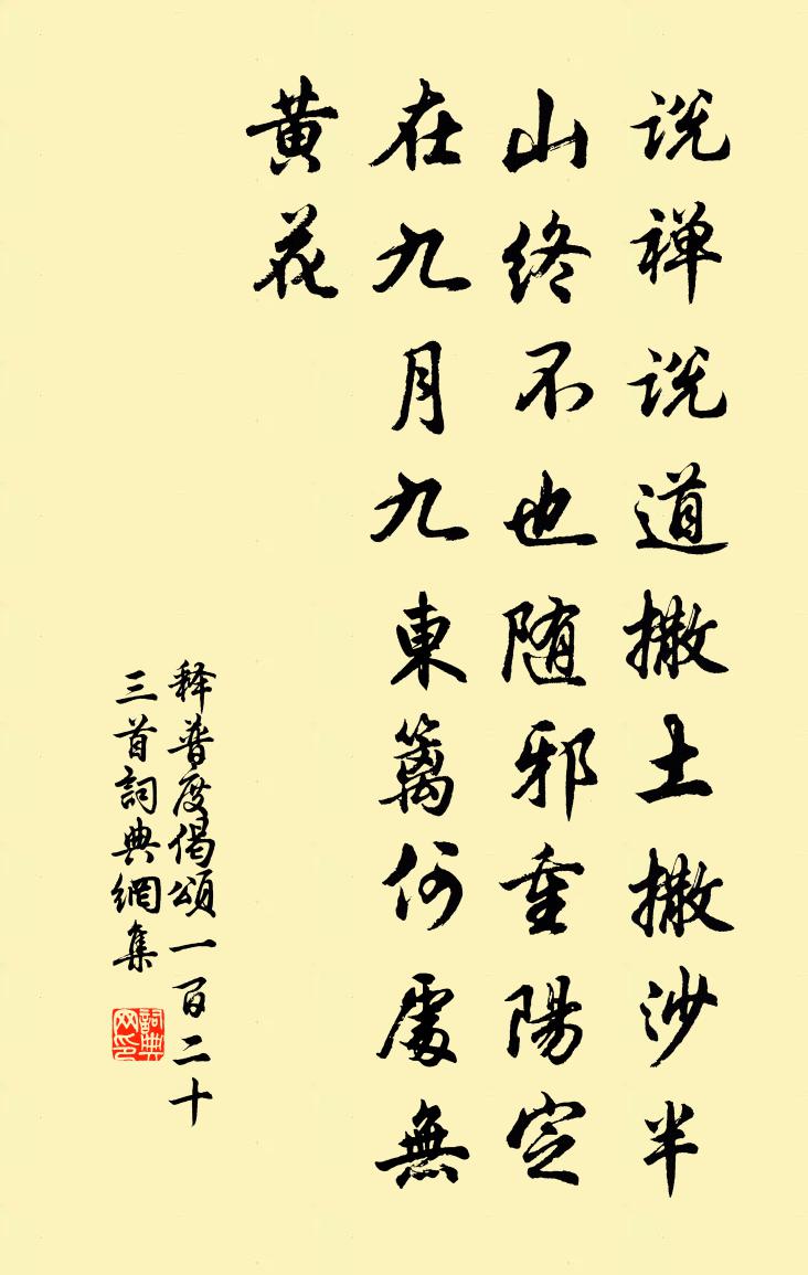 詩詞名句歷史字典書法欣賞書法字典國語詞典說文解字康熙字典古漢語字典標 題 作 者 詩 句 偈頌一百二十三首作者:釋普度 朝代:宋代偈頌一百二十三首原文說禪說道,撒土撒沙,半山終不也隨邪。重陽定在九月九,東籬何處無黃花。詩詞問答問:偈頌一百二十三首的作者是誰?答:釋普度問:偈頌一百二十三首寫於哪個朝代?答:宋代釋普度偈頌一百二十三首書法欣賞偈頌一百二十三首書法作品詩詞推薦三月三日適值清明會客江樓共觀並蒂魏紫偶成周必大〔宋代〕上巳清明共一時,魏花開處亦連枝。前身應是唐宮女,猶記昭容雙袖垂。次韻之秋日雨後韻王隱〔宋代〕洺州秋雨後,幽勝可供間。白首留他縣,歸心繞故山。野泉來竹底,危磴入雲間。尚記登高會,重岩細菊斑。潤州釋輝〔宋代〕北固樓前一笛風,斷雲飛出建章宮。江南二月多芳草,春在濛濛細雨中。奉使契丹二十八首其二十二學士院端午帖子二蘇轍〔宋代〕汴上初無招屈亭,沅湘近在國南垧。太官漫解供新宅,諫列猶應記獨醒。奉和聖制立春日侍宴內殿出翦彩花應制上官昭容〔唐代〕密葉因裁吐,新花逐翦舒。攀條雖不謬,摘蕊詎知虛。春至由來發,秋還未肯疏。借問桃將李,相亂欲何如。和陳擇之春日四絕張栻〔宋代〕泗上當時鼓瑟人,風雩豈是樂閒身。言外默傳千聖旨,胸中長有四時春。句魯某〔宋代〕錦步斜開四十里。西湖寺李復〔宋代〕舊聞宣律師,戒行極精苦。眉毫出寶珠,錫杖解斗虎。登壇三十年,布薩度緇侶。故物今余何,石像暴風雨。往河陽宿峽陵,寄李侍御孟郊〔唐代〕暮天寒風悲屑屑,啼鳥繞樹泉水噎。行路解鞍投古陵,蒼蒼隔山見微月。鴞鳴犬吠霜煙昏,開囊拂巾對盤飧。人生偈頌三十首釋慧暉〔宋代〕少室胡僧,履子留只。米樹應供,趺子出雙。新豐老人,問殺首座。大陽兄者,兼養青鷂。水龍吟 次韻章質夫楊花詞蘇軾〔宋代〕似花還似非花,也無人惜從教墜。拋家傍路,思量卻是,無情有思。縈損柔腸,困酣妖眼,欲開還閉。夢隨風萬里和陶擬古九首蘇軾〔宋代〕蕭蕭發垂素,晡日迫西隅。道人閔我老,元氣時卷舒。歲晚風雨交,何不完子廬。萬法滅無餘,方寸可久居。將掃夏雨後題青荷蘭若施肩吾〔唐代〕僧舍清涼竹樹新,初經一雨洗諸塵。微風忽起吹蓮葉,青玉盤中瀉水銀。食角黍懷江陵項安世〔宋代〕經年不食三閭餌,一日相逢似故人。旋剝青菰香滿手,試餐黃顆軟粘唇。蔗漿下箸甘無敵,昌本浮杯小作巡。正是答王晦之見寄黃庭堅〔宋代〕臨西風,動商歌。故人別來少書信,為問故人今若何。白雲蒙蒙迷少室,明月耿耿照秋河。可憐此月幾回缺,空城哭劉夫子於鵠〔唐代〕近問南州客,雲亡已數春。痛心曾受業,追服恨無親。孀婦歸鄉里,書齋屬四鄰。不知經亂後,奠祭有何人。探春慢姜夔〔宋代〕衰草花愁煙,亂花鴉送日,花風沙迴旋平野。拂雪金鞭,欺寒茸帽,還記章台走馬。誰念飄零久,漫贏得、幽懷難吳山人文徵、沈書記鍚東餞之虎丘龔自珍〔清代〕一天幽怨欲誰諳?詞客如雲氣正酣。我有簫心吹不得,落花風裡別江南。海棠陳孔碩〔宋代〕幾樹繁紅一徑深,春風裁剪錦成屏。花前莫作淵才恨,且看楊妃睡未醒。早行杜牧〔唐代〕垂鞭信馬行,數里未雞鳴。林下帶殘夢,葉飛時忽驚。霜凝孤鶴迥,月曉遠山橫。僮僕休辭險,時平路復平。名句推薦都緣自有離恨,故畫作遠山長。歐陽修《訴衷情·眉意》 功被天下,守之以讓。荀子《荀子·宥坐》 孔子亦矙其亡也,而往拜之。孟子《孟子·滕文公章句下·第七節》 學如不及,猶恐失之。孔子弟子《論語·泰伯篇》 佇倚危樓風細細。望極春愁,黯黯生天際。柳永《蝶戀花·佇倚危樓風細細》 江南憶,最憶是杭州。白居易《憶江南詞三首》 話別情多聲欲戰,玉著痕留紅粉面。顧敻《玉樓春·拂水雙飛來去燕》 貂不足,狗尾續。房玄齡《晉書·列傳·第二十九章》 反水不收,後悔無及。范曄《後漢書·本紀·光武帝紀上》 金鞍玉勒尋芳客,未信我廬別有春。于謙《觀書》