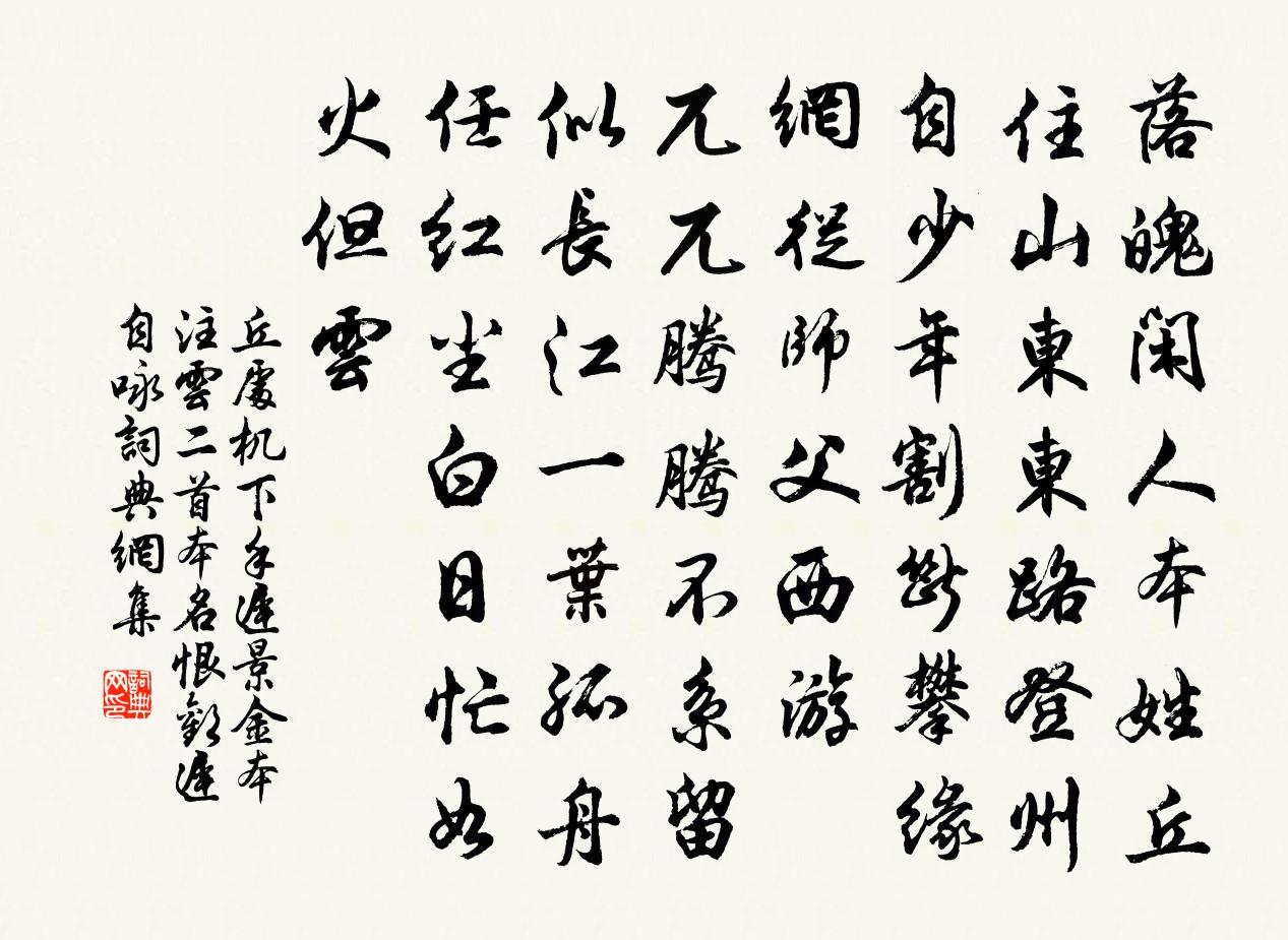 詩詞名句歷史字典書法欣賞書法字典國語詞典說文解字康熙字典古漢語字典標 題 作 者 詩 句 下手遲 景金本注云,二首本名恨歡遲 自詠作者:丘處機 朝代:元代原文落魄閒人本姓丘。住山東、東路登州。自少年、割斷攀緣網,從師父西遊。兀兀騰騰不系留。似長江、一葉孤舟。任紅塵、白日忙如火,但云詩詞問答問:《下手遲 景金本注云,二首本名恨歡遲 自詠》的作者是誰?答:丘處機問:該詩寫於哪個朝代?答:元代問:該詩是什麼體裁?答:詞書法欣賞下手遲 景金本注云,二首本名恨歡遲 自詠書法作品詩詞推薦送裴如晦之吳江歐陽修〔宋代〕雞鳴車馬馳,夜半聲未已。皇皇走聲利,與日爭寸晷。而我獨何為,閒宴奉君子。京師十二門,四方來萬里。顧吾送郟公甫通判睦州孔武仲〔宋代〕又向東南去,都門奈若何。塵埃京洛久,山水富春多。宴俎夸魚美,書帷待雁過。鵬程休暫息,九萬看騰波。春日山行吳端〔宋代〕雲峰疊疊路斜斜,隔洞炊煙三兩家。何處有香來不斷,嫩風微雨落松花。題順寧壁王遂〔宋代〕江東山望說茅廬,庵為康家孝子居。豈肯人間名教地,卻容釋老說清虛。閒興韓偓〔唐代〕景寂有玄味,韻高無俗情。他山冰雪解,此水波瀾生。影重驗花密,滴稀知酒清。忙人常擾擾,安得心和平。次韻竺梅潭老境陳著〔宋代〕浮生年復年,安處即神仙。子壯閒專日,家和笑答天。軟炊脂白米,甜釀雪清泉。蔗境有餘味,吟情真造玄。雨霖鈴 鳴鶴餘音卷一宋德方〔元代〕高山流水。嘆知音者,世間能幾。終南萬里,煙霞歸去也,歲雲暮矣。拄杖藥爐經卷,除此外、有何行李。樂恬淡贈李中丞洪一首皎然〔唐代〕深沈閫外略,奕世當榮寄。地裂大將封,家傳介珪瑞。至今漳河俗,猶受仁人賜。公初鎮惟邢,決勝無精兵。重圍蜣螂蘇軾〔宋代〕洪鐘起暗室,飄瓦落空庭。誰言轉丸手,能作殷床聲。留別東郡諸僚友梅摯〔宋代〕白璧紫金為世實,賢愚知貴莫能名。廟堂祭器杯盤物,隨處得之光彩生。江上暫別蕭四劉三旋欣接遇陳子昂〔唐代〕昨夜滄江別,言乖天漢游。寧期此相遇,尚接武陵洲。結綬還逢育,銜杯且對劉。波潭一瀰瀰,臨望幾悠悠。山水高宗建炎初祀昊天上帝佚名〔宋代〕氣明黃鐘,萬物資始。欽若高穹,吉蠲時祀。神策泰元,增授無已。群生熙熙,函蒙繁祉。生米磯之至德觀余舊遊也嘗有題釣磯胡柏七言趙蕃〔宋代〕此地傳為天寶門,政由漁叟話桃源。閣中名字誰為立,知是君平幾世孫。小重山(同仇香過汭川,道問偶成)章謙亨〔宋代〕久雨初晴天氣佳。遠峰猶□被,亂峰遮。更無一朵路旁花。春歸也,光景只桑麻。山徑曲如蛇。□□□□□,□□挽陳檢□一首劉克莊〔宋代〕坊表猶元老,郊恩自復齋。美材淹選部,拙宦忤銘台。尚意冰銜改,安知玉樹埋。吾衰阻臨穴,挽友想餘哀。覽鏡白玉蟾〔宋代〕歲事軨吼好送窮,頭今未雪臉猶紅。一回覽鏡一回老,天已安排欲我翁。晚起白居易〔唐代〕起晚憐春暖,歸遲愛月明。放慵長飽睡,聞健且閒行。北闕停朝簿,四方入社名。唯吟一句偈,無念是無生。勸農六首張嵲〔宋代〕皇恩力本勸農耕,老稚爭隨刺史行。楊柳垂村麴塵色,殊鄉時節近清明。恭和御製進讀唐鑒徹章詩劉克莊〔宋代〕考詳往事炳蓍龜,精論微言訓戒垂。度贊元和中興業,徵開貞觀太平基。覽披賢似銅為鑑,顧問謙然木就規。孤遠瑣窗寒·玉蘭吳文英〔宋代〕紺縷堆雲,清腮潤玉,汜人初見。蠻腥未洗,海客一懷悽惋。渺征槎、去乘閬風,占香上國幽心展。□遺芳掩色,名句推薦甘露時雨,不私一物;萬民之主,不阿一人。呂不韋《呂氏春秋·紀·孟春紀》 男兒何不帶吳鉤,收取關山五十州。李賀《南園十三首·其五》 撩亂舞晴空,發人無限思。劉禹錫《柳花詞三首》 從臣皆半醉,天子正無愁。李商隱《陳後宮》 知者不博,博者不知。老子《老子·德經·第八十一章》 細看不是雪無香,天風吹得香零落。王旭《踏莎行·雪中看梅花》 黃葉仍風雨,青樓自管弦。李商隱《風雨》 霜草蒼蒼蟲切切,村南村北行人絕。白居易《村夜》 明朝甑復空,母子相持哭。陸游《十月二十八日風雨大作》 接漢疑星落,依樓似月懸。盧照鄰《十五夜觀燈》