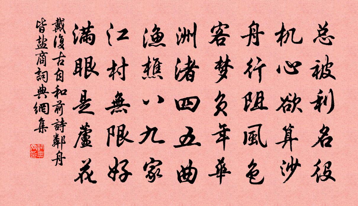 詩詞名句歷史字典書法欣賞書法字典國語詞典說文解字康熙字典古漢語字典標 題 作 者 詩 句 自和前詩鄰舟皆鹽商作者:戴復古 朝代:宋代自和前詩鄰舟皆鹽商原文總被利名役,機心欲算沙。舟行阻風色,客夢負年華。洲渚四五曲,漁樵八1|1九家。江村無限好,滿眼是蘆花。詩詞問答問:自和前詩鄰舟皆鹽商的作者是誰?答:戴復古問:自和前詩鄰舟皆鹽商寫於哪個朝代?答:宋代問:戴復古的名句有哪些?答:戴復古名句大全戴復古自和前詩鄰舟皆鹽商書法欣賞自和前詩鄰舟皆鹽商書法作品詩詞推薦閏月定四時許稷〔唐代〕玉律窮三紀,推為積閏期。月餘因妙算,歲遍自成時。乍覺年華改,翻憐物候遲。六旬知不惑,四氣本無欺。月桂題山院權審〔唐代〕萬葉風聲利,一山秋氣寒。曉霜浮碧瓦,落日度朱欄。送遠曲別葦航蒲壽宬〔宋代〕驅車晨出門,薄酒持送君。離心一寸鐵,修嶺千重雲。遙憐風雨夜,應念霜雪群。猿鶴豈敢怨,所期在斯文。滿江紅(梅)吳潛〔宋代〕試馬東風,且來問、南枝訊息。正小墅、幾株斜倚,數花輕拆。自有山中幽態度,誰知世上真顏色。嘆君家、五嶺送程於潛兩首洪咨夔〔宋代〕溪山民物古,政理器能寬。平易見眉睫,明清生肺肝。春風簾影暖,霜月研聲寒。野老自相語,元豐崔長官。頌證道歌證道歌釋印肅〔宋代〕二乘精進勿道心,南宗北祖亂紛紜。雖是善困招惡果,幾時解得見天真。友生攜修睦上人詩見訪李鹹用〔唐代〕雪中敲竹戶,袖出岳僧詩。語盡景皆活,吟闌角獨吹。意如將俗背,業必少人知。共約冰銷日,雲邊訪所思。緣識宋太宗〔宋代〕多言心不善,出口莫能追。如夢歡娛樂,歸家說盛衰。擬將何所用,理亂別公私。方寸巧施設,小人亦可悲。近結茅屋數椽以可賦軒揭取子美可以賦新詩之喻良能〔宋代〕安仁偃息處,之問讀書室。茅軒規昔人,聊可容吾膝。幽芳秀垣曲,翠篠蓊檐隙。松窗炯虛明,荊籬互疏密。淡月讀杜詩陸游〔宋代〕千載詩亡不復刪,少陵談笑即追還。常憎晚輩言詩史,清廟生民伯仲間。醉落魄黃庭堅〔宋代〕者乃強見酌,遂能作病。因復止酒,用前韻作二篇,呈吳元祥陶陶兀兀。人生夢裡槐安國。教公休醉公但莫。盞倒和何子應游金璧池二首郭印〔宋代〕徜徉清水曲,盼巒綠楊邊。欲並師商席,同登傅說船。萬荷齊舞扇,一葦獨行天。滿目江湖趣,無勞涉大川。將欲再游荊渚留辭岐下司徒尚顏〔唐代〕竹錫銅瓶配衲衣,殷公樓畔偶然離。白蓮幾看從開日,明月長吟到落時。活計本無桑柘潤,疏慵尋有水雲資。今朝一翦梅(元宵)盧炳〔宋代〕燈火樓台萬斛蓮。千門喜笑,素月嬋娟。幾多急莞與繁弦。巷陌駢闐。畢獻芳筵。樂與民偕五馬賢。綺羅叢里,一九日次韻王壽翁於石〔宋代〕半年飲菊試仙方,安用狂歌賦玉堂。烏帽任教今日落,紫萸不改舊年香。人生還有幾重九,世事都歸一醉鄉。千古【南呂】一枝花_詠喜雨用盡張養浩〔元代〕詠喜雨用盡我為民為國心,祈下些值玉值金雨。數年空盼望,一旦遂沾濡。喚省焦枯,喜萬象春如故,恨流民尚在二十二日起居退聞宣三館諸公觀瑞蓮梅堯臣〔宋代〕來朝十二旒,將出未央殿。微聞嘉蓮開,獨許侍臣見。嘉蓮其如何,層樓擁霞片。玉輦下天泉,日昃不知倦。恩魚詠史詩殺子谷胡曾〔唐代〕舉國賢良盡淚垂,扶蘇屈死樹邊時。至今谷口泉嗚咽,猶似秦人恨李斯。游龍洞訪僧不遇留詩陶弼〔宋代〕一錫游何處,岩端靜掩扃。獨尋危石坐,閒把細泉聽。野鼠緣齋缽,山花落靜瓶。斜陽過溪去,回首亂峰青。青桐道中值雨凡數里舟行久之頗有江湖之思二張耒〔宋代〕冥冥煙外鳥飛歸,野老得魚收網回。隔浦斷霞沉欲盡,半彎新月出雲來。名句推薦密雲雙鳳,初破縷金團。米芾《滿庭芳·詠茶》 若待明朝風雨過,人在天涯!春在天涯。虞集《南鄉一剪梅·招熊少府》 秋鬢含霜白,衰顏倚酒紅。尹式《別宋常侍》 冰合大河流,茫茫一片愁。納蘭性德《菩薩蠻·白日驚飈冬已半》 沅水通波接武岡,送君不覺有離傷。王昌齡《送柴侍御》 龜言此地之寒,鶴訝今年之雪。庾信《小園賦》 明月皎皎照我床,星漢西流夜未央。曹丕《燕歌行二首·其一》 禮者,人道之極也。荀子《荀子·禮論》 問元戎早晚,鳴鞭徑去,解天山箭。元好問《水龍吟·從商帥國器獵於南陽同仲澤鼎玉賦此》 雨里雞鳴一兩家,竹溪村路板橋斜。王建《雨過山村》