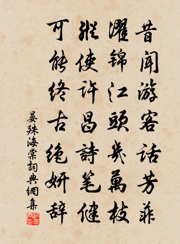 詩詞名句歷史字典書法欣賞書法字典國語詞典說文解字康熙字典古漢語字典標 題 作 者 詩 句 海棠作者:晏殊 朝代:宋代海棠原文昔聞遊客話芳菲,濯錦江頭幾萬枝。縱使許昌詩筆健,可能終古絕妍辭。詩詞問答問:海棠的作者是誰?答:晏殊問:海棠寫於哪個朝代?答:宋代問:晏殊的名句有哪些?答:晏殊名句大全晏殊海棠書法欣賞海棠書法作品詩詞推薦次韻溫伯雨涼感懷范成大〔宋代〕窮士病且飢,古今同一流。身安腹果然,此外吾何求。判司誠卑官,未免塵甑憂。窮山更癉暑,憊臥不舉頭。二物擢探花使三首翁承贊〔唐代〕洪崖差遣探花來,檢點芳叢飲數杯。深紫濃香三百朵,明朝為我一時開。九重煙暖折槐芽,自是昇平好物華。今日送樂清姚令行可樓鑰〔宋代〕長官清政玉無瑕,卓魯循良不足夸。前席有期吾黨喜,挽須無路邑人嗟。才高雁盪千峰石,惠足河陽一縣花。欲信古意李新〔宋代〕無分清濁流,殺爾投河伯。無結死生交,一死生便隔。模稜不失事,禍起分黑白。百年過逆旅,今是長安客暑中楊伯虎見訪翌日有詩來因走筆次韻張鎡〔宋代〕領取無多話,頻年頓不疎。幽尋塵土外,高韻笑談余。既悟蕉中鹿,寧求木上魚。論詩能避暑,此意復誰如。我欲往滄海王安石〔宋代〕我欲往滄海,客來自河源。手探囊中膠,救此千載渾。我語客徒爾,當還治崑崙。嘆息謝不能,相看涕翻盆。客止海山陸游〔宋代〕補落迦山訪舊遊,庵摩勒果隘中州。秋濤無際明人眼,更作津亭半日留。漁家傲(贈鼎湖官妓)李石〔宋代〕西去征鴻東去水。幾重別恨千山里。夢繞綠窗書半紙。何處是。桃花溪畔人千里。瘦玉倚香愁黛翠。勸人須要人先答龐參軍 其一陶淵明〔魏晉〕衡門之下,有琴有書。載彈載詠,爰得我娛。豈無他好?樂是幽居;朝為灌園,夕偃蓬廬。袁州州學記李覯〔宋代〕皇帝二十有三年,制詔州縣立學。惟時守令,有哲有愚。有屈力殫慮,祗順德意;有假官借師,苟具文書。或連數句諶祜〔宋代〕舊者今不見,今者舊不知。萬古明月在,千山黃雲飛。風流子·茅舍槿籬溪曲孫光憲〔唐代〕茅舍槿籬溪曲,雞犬自南自北。菰葉長,水葓開,門外春波漲淥。聽織,聲促,軋軋鳴梭穿屋。樓倚長衢欲暮,瞥中春中浣一日老人挈累下西市寓舍越三日某行洪咨夔〔宋代〕血氣危頻復,頭顱老數奇。家如緣角鼠,身是脫筒龜。草樹春離列,雲山晚蔽虧。意行隨所到,不必問何之。次韻贈東湖周子問項安世〔宋代〕玉鏁凌空不可攀,臥聽車馬日三竿。以湖拜命官名散,把酒封君國號歡。父祖詩家三世將,弟兄文陣兩秦難。年豐王亞之見訪知谹父郎中得女戲作王洋〔宋代〕春風剪彩花開臉,秋水為神玉作肌。解使門闌添鼓色,宜來何必是男兒。送信甫之江東陳深〔宋代〕僦屋吳城不厭貧,江東初奉蘧書新。壯年地略須名世,異國光陰肯滯人。官舍草生三月晚,遺宮花落六朝暮。到時琴曲歌辭拘幽操韓愈〔唐代〕目掩掩兮其凝其盲,耳肅肅兮聽不聞聲。朝不日出兮夜不見月與星,有知無知兮為死為生。嗚呼!臣罪當誅兮天王彭司令震龍第一百二十二文天祥〔宋代〕堂上會親戚,可憐馬上郎。呻吟更流血,干戈浩茫茫。贈汲郡太守詩陸雲〔魏晉〕悠悠斯民。三代直道。我求明德。惟奚攸考。緝熙暉章。天祿來保。惠心無兢。豐化有造。四料簡奪人不奪境釋正覺〔宋代〕懶問誰持造化權,門前春事正暄妍。雨晴花色明如錦,風暖鶯聲滑似弦。名句推薦飲馬渡秋水,水寒風似刀。王昌齡《塞下曲四首》 童孫未解供耕織,也傍桑陰學種瓜。范成大《夏日田園雜興·其七》 山遠近,路橫斜,青旗沽酒有人家。辛棄疾《鷓鴣天·陌上柔桑破嫩芽》 肉腐出蟲,魚枯生蠹。荀子《荀子·勸學》 秋逼暗蟲通夕響,征衣未寄莫飛霜。張仲素《秋夜曲》 君有妒臣,則賢人不至。荀子《荀子·大略》 君仁莫不仁,君義莫不義,君正莫不正。孟子《孟子·離婁章句上·第二十節》 今士之用身,不若商人之用一布之慎也。墨子《墨子·47章 貴義》 歌聲未盡處,先淚零周邦彥《綺寮怨·上馬人扶殘醉》 如今風雨西樓夜,不聽清歌也淚垂。周紫芝《鷓鴣天·一點殘紅欲盡時》