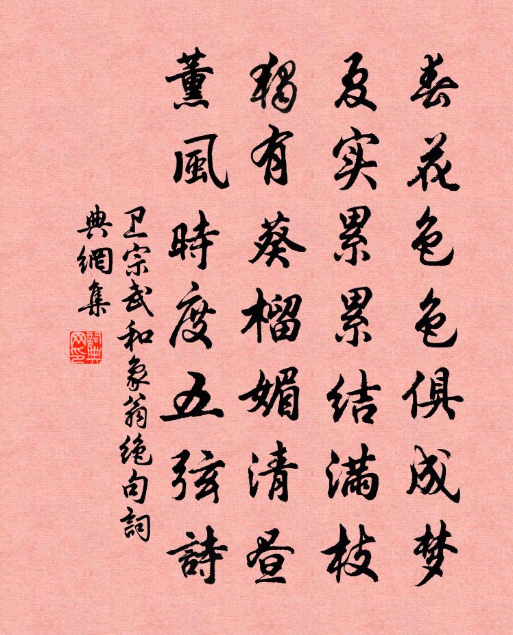 詩詞名句歷史字典書法欣賞書法字典國語詞典說文解字康熙字典古漢語字典標 題 作 者 詩 句 和象翁絕句作者:衛宗武 朝代:宋代和象翁絕句原文春花色色俱成夢,夏實纍纍結滿枝。獨有葵榴媚清晝,薰風時度五弦詩。詩詞問答問:和象翁絕句的作者是誰?答:衛宗武問:和象翁絕句寫於哪個朝代?答:宋代衛宗武和象翁絕句書法欣賞和象翁絕句書法作品詩詞推薦題掛劍圖張鎡〔宋代〕當年許與有誰知,人忽邱陵我獨悲。遜國曩時猶易耳,不應留劍使心欺。雜曲歌辭。夜夜曲王偃〔唐代〕北斗星移銀漢低,班姬愁思鳳城西。青槐陌上人行絕,明月樓前烏夜啼。晚秋郊居八首趙蕃〔宋代〕霜天柿葉須收拾,咫尺山園底去遲。不是功名覊絆得,病來筋力費扶持。妙智庵宋伯仁〔宋代〕結屋占山巔,源流未有年。便非真隱者,且喜得安然。石洞雲同臥,茶鐺客對煎。我來聊小憩,詩滿夕陽天。履齋先生下頒參附往體以謝陳起〔宋代〕有客號奚毒,西來自赤水。外負炎炎氣,記憶體溫粹美。當年楊天惠,誇大不絕齒。解後段氏子,即之殊可喜。卻邪一寸金佚名〔宋代〕食飽傷心損氣,睡多夢裡迷真。眼觀心動喪元神。耳聽靈台昧盡。要見元初面目,慧刀割斷紅塵。無情應物本來真長相思·其一李白〔唐代〕長相思,在長安。絡緯秋啼金井闌,微霜淒淒簟色寒。孤燈不明思欲絕,卷帷望月空長嘆。美人如花隔雲端!上有姜總管輓詞樓鑰〔宋代〕及見開元盛,曾聞正始音。雕蟲徒壯歲,冠鶡豈初心。論事風生席,疏恩帶錫金。精神空滿腹,愁絕病沈沈。古詩十九首·客從遠方來佚名〔兩漢〕客從遠方來,遺我一端綺。相去萬餘里,故人心尚爾。文彩雙鴛鴦,裁為合歡被。著以長相思,緣以結不解。以膠山居白居易〔唐代〕山齋方獨往,塵事莫相仍。藍輿辭鞍馬,緇徒換友朋。朝餐唯藥菜,夜伴只紗燈。除卻青衫在,其餘便是僧。送淳丞上虞樓鑰〔宋代〕我老不復仕,行將掛衣冠。兩子俱貳令,官職恰一般。剡川且書考,上虞亦之官。人言易捧檄,歸奉重親歡。我意乙巳歲三月為建威參軍使都經錢溪陶淵明〔魏晉〕我不踐斯境,歲月好已積。晨夕看山川,事事悉如昔。微雨洗高林,清飆矯雲翮。眷彼品物存,義風都未隔。伊余清江曲蘇堅〔宋代〕屬玉雙飛空滿塘,菰蒲深處浴鴛鴦。白蘋滿棹歸來晚,秋著蘆花一岸霜。扁舟擊岸依林樾,蕭蕭兩鬢吹華發。萬事詠梅雜詩張道洽〔宋代〕夜深月透小窗紗,夢到瑤池阿母家。急遣山僮開戶看,不知是雪是梅花。憶秦娥(七夕)袁去華〔宋代〕月照席。不知天上今何夕。今何夕。鵲橋初就,玉繩低側。暫時不見猶尋覓。那堪更作經年隔。經年隔。許多良夜臨江仙佚名〔宋代〕綠暗汀洲三月暮,落花風靜帆收。垂楊低映木蘭舟。半篙春水滑,一段夕陽愁。灞水橋東回首處,美人親上簾鉤。詠王大娘戴竿劉晏〔唐代〕樓前百戲競爭新,唯有長竿妙入神。誰謂綺羅翻有力,猶自嫌輕更著人。朱丞相赴宣州四十韻葛立方〔宋代〕天佑於皇宋,時生柱石賢。餘光承祖禰,秀氣稟山川。應物心如水,臨機直似弦。孔書窮竹簡,羲易玩韋編。記問次韻子由書王晉卿畫山水二首蘇軾〔宋代〕老雲君空見畫,夢中我亦曾游。桃花縱落誰見,水到人間伏流。義寧華岩洞和純陽真人方信孺〔宋代〕跨鶴曾來不記年,洞中流水綠依然。紫簫吹徹無人見,萬里西風月滿天。名句推薦春心莫共花爭發,一寸相思一寸灰!李商隱《無題·颯颯東風細雨來》 天下大勢,分久必合,合久必分。羅貫中《三國演義·第一回》 文章憎命達,魑魅喜人過。杜甫《天末懷李白》 今宵樓上一尊同。雲濕紗窗。辛棄疾《一剪梅·中秋元月》 刻舟求劍,固而不通;膠柱鼓瑟,拘而不化。程登吉《幼學瓊林·卷三·器用》 蜀江水碧蜀山青,聖主朝朝暮暮情。白居易《長恨歌》 學不精勤,不如不學 。令狐德棻《周書·列傳·卷二十五》 以少總多,情貌無遺矣。劉勰《文心雕龍·物色》 積土成山,風雨興焉;積水成淵,蛟龍生焉;荀子《勸學》 窣地春袍,嫩色宜相照。梅堯臣《蘇幕遮·草》