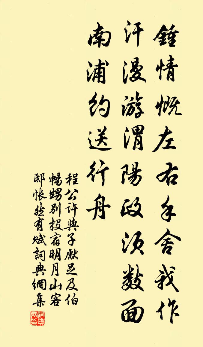 詩詞名句歷史字典書法欣賞書法字典國語詞典說文解字康熙字典古漢語字典標 題 作 者 詩 句 與子先足及伯暢甥別投宿明月山客邸悵然有賦作者:程公許 朝代:宋代原文鍾情慨左右手,舍我作汗漫遊。渭陽政須數面,南浦約送行舟。詩詞問答問:《與子先足及伯暢甥別投宿明月山客邸悵然有賦》的作者是誰?答:程公許問:該詩寫於哪個朝代?答:宋代書法欣賞與子先足及伯暢甥別投宿明月山客邸悵然有賦書法作品詩詞推薦春光好李之儀〔宋代〕霜壓曉,月收陰。斗寒深。看盡燭花金鴨冷,卷殘衾。卯酒從誰細酌,餘香無計重尋。空把夜來相見夢,寫文琴。菩薩蠻(用三謝詩“故人心尚遠,故心人不見”之句)趙師俠〔宋代〕故人心尚如天遠。故心人更何由見。腸斷楚江頭。淚和江水流。江流空滾滾。淚盡情無盡。不怨薄情人。人情逐處題李子權江月亭曾豐〔宋代〕太陰元是水之精,與水相宜妙莫名。霽夜懸芒翻浪白,澄秋逗彩涌流清。冰輪影里山河見,玉鑒光中星斗明。萬象婆羅門引 辛卯中秋望月張之翰〔元代〕宦遊南北,月明何處不相隨。十年九賦新詞。今夜清光如許。無以侑金*。想叨居此職,著甚推辭。臨風再思。是秋晚寓嘆陸游〔宋代〕行年垂大耋,久矣少朋儔。舊事同誰說,新詩或自酬。廢書眠過日,泥酒醉經秋。遲速皆當死,時來莫預愁。紀秦漢間事二首羅公升〔宋代〕秦王狹百二,猛虎正負嵎。壯哉田家子,赤手摩其須。叩關固蹉跎,未覺此詩迂。沛公居山東,財色良區區。一朝句李建中〔宋代〕山程授館聞鴻夜,水國還家欲雪天。又和饒計使丹青閣韻趙汝騰〔宋代〕久聞傑閣原今酬,亭午登臨到上頭。二水清澄新雨霽,眾峰蒼峭凍雲留。擬賡場圃詩人句,休負煙波墨客愁。信使就可公宿賈島〔唐代〕十里尋幽寺,寒流數派分。僧同雪夜坐,雁向草堂聞。靜語終燈焰,餘生許嶠雲。由來多抱疾,聲不達明君。句鄭文寶〔宋代〕人辭碧落春風晚,花老朱陵古渡頭。和子由踏青蘇軾〔宋代〕春風蠶陌上驚微蠶塵,遊人蠶初樂歲華新。人閒正好路旁飲,麥短未怕游車輪。城中居人厭城郭,喧闐曉出空四鄰處士妻十首劉克莊〔宋代〕王將托一國,自駕請先生。門外車跡眾,萊妻投畚行。丙寅十四首效韋蘇州黃庭堅〔宋代〕少小尚狷介,與人常不款。置身稍雍容,遇酒輒引滿。自是鶴長足,難齊鳧脛短。醉中劉宰〔宋代〕一樽綠酒與君同,且喜荷香送晚風。四座盡傾談柄白,滿筵不用舞裙紅。暑行憩新都驛陸游〔宋代〕細細黃花落古槐,江皋不雨轉輕雷。長空鳥破蒼煙去,落日人從綠野來。散策意行尋水石,脫巾高臥避氛埃。羈游秋日書事貽潘少白舒岳祥〔宋代〕樹色已非昨,蟲聲不忍聞。亂鴉投急景,老樹淰長雲。百頃青黃半,一村晴雨分。憑闌新得句,書贈特山君。偈釋道初〔宋代〕雞見便斗,犬見便齩。殿上鴟吻,終日相對。醉落魄(春深)趙長卿〔宋代〕麥畦勻綠。枝頭屑屑飛梅玉。傷心何事人南北。斷盡迴腸,忍聽陽關曲。倚窗青蔭亭亭竹。好風敲動聲相續。夜闌沈朝議輓詞林季仲〔宋代〕擢第繇元佑,封侯迨紹興。曠懷初不競,薄俗漫多能。勳業一壺酒,交遊八尺藤。諸生話鄉老,揮淚溼寒燈。次韻潔堂別歲馬廷鸞〔宋代〕月底南枝插屋椽,無人共賞只凋年。我慚王氏青氈舊,君效坡翁白鶴遷。小隱未荒存菊徑,獨清難涴出山泉。歸時名句推薦櫚庭多落葉,慨然知已秋。陶淵明《酬劉柴桑》 知文德武功,蓋因時而並用魏徵《隋書·列傳·卷三十二》 素手把芙蓉,虛步躡太清。李白《古風·其十九》 已過才追問,相看是故人。吳偉業《遇舊友》 國之興也,天遺之賢人與極言之士;國之亡也,天遺之亂人與善諛之士。呂不韋《呂氏春秋·覽·先識覽》 回看射鵰處,千里暮雲平。王維《觀獵》 如來者即諸法如義。鳩摩羅什譯《金剛經·究竟無我》 明日復明日,明日何其多。錢福《明日歌》 正身直行,眾邪自息。劉安及其門客《淮南子·繆稱訓》 隔水氈鄉,落日牛羊下,區脫縱橫。張孝祥《六州歌頭·長淮望斷》