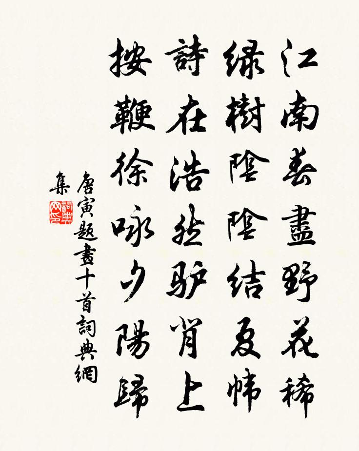 詩詞名句歷史字典書法欣賞書法字典國語詞典說文解字康熙字典古漢語字典標 題 作 者 詩 句 題畫十首作者:唐寅 朝代:明代題畫十首原文江南春盡野花稀,綠樹陰陰結夏幃。詩在浩然驢背上,按鞭徐詠夕陽歸。詩詞問答問:題畫十首的作者是誰?答:唐寅問:題畫十首寫於哪個朝代?答:明代問:唐寅的名句有哪些?答:唐寅名句大全唐寅題畫十首書法欣賞題畫十首書法作品詩詞推薦魰劉吉〔宋代〕八珍一箸千金價,往往精皰賤惠文。莫道形模大剛拙,剖珠也解獻殷勤。二月二十四日楊廷秀郎中諸友約游西湖佘以小喻良能〔宋代〕都城西頭二月尾,湖水平堤縠紋起。南北山光罨畫中,淺深草色裙腰裡。群仙領客泛艅艎,黃帽劈波驚鰋鯉。中流頌古十六首釋明辯〔宋代〕春水滿幽澗,江風吹斷雲。年年那時節,憶著別離人。塞翁吟陳坦之〔宋代〕遠碧秋痕瘦,楚玉恨賦淒涼。荷雨碎,泣殘妝。系愁在垂陽。秋衣拂疊仙梔露,裁雲刀尺猶香。詩錦字,獻明璫。送客賦得巴江夜猿李端〔唐代〕巴水天邊路,啼猿傷客情。遲遲雲外盡,杳杳樹中生。殘月暗將落,空霜寒欲明。楚人皆掩淚,聞到第三聲。夜思方回〔宋代〕買菱沽酒意欣然,中輟留為斗糴錢。委巷屐聲駢雨後,破窗燈影颭風前。在家兒女應飢瘦,久客衣裳盡穴穿。忽憶春雲鄧倚〔唐代〕搖曳自西東,依林又逐風。勢移青道里,影 * 波中。夕霽方明日,朝陽復蔽空。度關隨去馬,出塞引歸鴻。色任祈雨伏虎菴白玉蟾〔宋代〕梵相無言旱氣奢,三農無飯欲蒸沙。狻頭香穗成禾穗,麈尾天花化雨花。偈頌四十二首釋祖先〔宋代〕楊岐鬥勝不鬥劣,秀峰斗劣不鬥勝。秀峰乍作沒親疎,個個盡懷滄海珠。滿眼湖山看不足,釋迦彌勒是他奴。贈靈隱老曹勛〔宋代〕一笑相逢語上方,水雲蹤跡覺清涼。未論方丈葛藤話,且喜齋廚蔬筍香。閒拄瘦筇隨意立,卻愁款段入城忙。宿山孟子行所無事陳普〔宋代〕天理須殊本自然,自然天道合無天。一毫小智生穿鑿,所性之真已弗全。贊護教釋印肅〔宋代〕給孤施地,慈化為尊。護人成佛,功德奚論。頌古二十九首釋師體〔宋代〕若瓠連根苦,同坑無異土。二千年已前,一火破落戶。臨海縣治琴堂樓鑰〔宋代〕子賤彈琴真是琴,我今無弦知琴心。使我不得琴中趣,弦以修綆誰知音。才術高低不自由,單父二子心則侔。後人春間小詩書趙壁追錄之朱槔〔宋代〕小語不知夕,幽香無盡時。影寒人慾醉,明月照酴醾。送石賡歸寧王安石〔宋代〕虛名誤長者,邂逅肯經過。所操十餘篇,浩蕩決江河。側身朝市間,樂少悲慚多。文章舊所好,久已廢吟喔。開編感事晁說之〔宋代〕人物今朝何寂寞,我思前輩太崢嶸。仙才難測趙周翰,俗眼聊窺石曼卿。鸞鳳騰輝何處在,珪璋振德是人斯。怪來法駕導引趙文〔宋代〕京浙塵埃,閩嶠風霜,不覺催老。封侯事付兒曹,懶把菱花頻照。明光賦筆,那知白首山中,年年管領閒花草。叩和談校書秋夜感懷呈朝中親友白居易〔唐代〕遙夜涼風楚客悲,清砧繁漏月高時。秋霜似鬢年空長,春草如袍位尚卑。詞賦擅名來已久,煙霄得路去何遲。漢庭遍地錦佚名〔宋代〕吾本當初水竹村。甘河鎮上便狂風。七朵金蓮朵朵新。丘劉譚馬郝王名句推薦清秋幕府井梧寒,獨宿江城蠟炬殘。杜甫《宿府》 民感桑林雨,雲施李靖龍。趙汝愚《雨後送李將軍還祠偕同寅飲一杯亭》 朽木不可雕也,糞土之牆不可圬也!佚名《宰予晝寢》 一壺酒,一竿身,快活如儂有幾人。李煜《漁父·浪花有意千里雪》 曲闌深處重相見,勻淚偎人顫。納蘭性德《虞美人·曲闌深處重相見》 故人南燕吏,籍籍名更香。岑參《至大梁卻寄匡城主人》 何事春風容不得?和鶯吹折數枝花。王禹偁《春居雜興·兩株桃杏映籬斜》 酒醒人靜奈愁濃。殘燈孤枕夢,輕浪五更風。徐昌圖《臨江仙·飲散離亭西去》 一晌憑欄人不見,鮫綃掩淚思量遍。馮延巳《鵲踏枝·梅落繁枝千萬片》 花間一壺酒,獨酌無相親。李白《月下獨酌四首·其一》