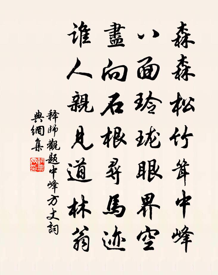 詩詞名句歷史字典書法欣賞書法字典國語詞典說文解字康熙字典古漢語字典標 題 作 者 詩 句 題中峰方丈作者:釋師觀 朝代:宋代題中峰方丈原文森森松竹聳中峰,八面玲瓏眼界空。盡向石根尋馬跡,誰人親見道林翁。詩詞問答問:題中峰方丈的作者是誰?答:釋師觀問:題中峰方丈寫於哪個朝代?答:宋代釋師觀題中峰方丈書法欣賞題中峰方丈書法作品詩詞推薦再逢成上人宋祁〔宋代〕上都初見赤髭年,並在西州絳帳前。每與文殊同問疾,不知靈運遽生天。淮山永憶吟無社,梁苑重來供有緣。休問絕句鄧深〔宋代〕桑里相聞路一程,無從款接笑談清。那知邂逅論詩處,秋滿瀟湘雁送聲。梁州令(中呂宮)柳永〔宋代〕夢覺紗窗曉。殘燈掩然空照。因思人事苦縈牽,離愁別恨,無限何時了。憐深定是心腸小。往往成煩惱。一生惆悵次韻何廉昉太守感懷述事十六首曾國藩〔清代〕江雪湖波路幾千,壺頭歸葬事堪憐。鑄金叩叩終何益?理玉深深不計年。夜月一鉤涼蕙帳,春風十萬散榆錢。神靈蘇主簿輓歌歐陽修〔宋代〕布衣馳譽入京都,丹旐俄驚反舊閭。諸老誰能先賈誼,君王猶未識相如。三年弟子行喪禮,千兩鄉人會葬車。我獨再和顛字韻時方議開邊魏了翁〔宋代〕鼎象亨調戒在顛,或捐常饌美時鮮。鷙形不匿麏投麓,劍影虛張蛟繞船。壯觀要還全盛日,圖回須似中興年。掩關送魯有開中大知洺州次子瞻韻蘇轍〔宋代〕仲連雖不仕,而非綺與園。逡巡笑談間,屢解戰鬥繁。子敬識二孫,長揖鼓鼙喧。意氣感周郎,振策起江村。二賢春夜高翥〔宋代〕小窗兀兀守更殘,案上詩書亦懶觀。頻翦燭花聽夜雨,盡垂簾影隔春寒。破除夢幻從頭了,安置身心向下看。老子詩二首劉望之〔宋代〕孤舟未晚泊,煙火傍人家。小市常憂虎,空城不見花。送春晁說之〔宋代〕雨里花開過,愁中燕到遲。一春都寂寞,不作送春詩。武林感舊又二首方回〔宋代〕吳儂青蓋已云何,郎罷猶能欸乃歌。湖上船稀西子老,城中馬響北人多。珍烹富戶金千埒,負販貧民雨一蓑。倏忽綿竹山四十韻吳融〔唐代〕綿竹東西隅,千峰勢相屬。崚嶒壓東巴,連延羅古蜀。方者露圭角,尖者鑽箭簇。引者蛾眉彎,斂者鳶肩縮。尾蟉古漁父詞十二首王銍〔宋代〕風梟溪頭約線多,戲魚無奈巧依荷。直須飄淨浮萍草,盡放青天照碧波。潄玉齋前雜卉皆龍圖王至之所植各賦一章凡得宋祁〔宋代〕脩脩稍出類,辭卑不肯叢。有節天容直,無心道與空。一病四十日天氣遂寒感懷有賦陸游〔宋代〕幽人病起鬢毛殘,硤口樓台九月寒。暮角又催孤夢斷,早霜初染一林丹。鄉閭乖隔知誰健?懷抱淒涼用底寬?麴米阻風池州界李曾伯〔宋代〕擬以風斯下,胡然日在茲。一頭聊且避,入面欲何施。坎有險如此,需於沙待之。姑陪鵬力厚,萬里看南為。和黃執禮六首胡寅〔宋代〕律呂旋相六十宮,聲如佳句比南風。自非詩印全提得,難使言瑕一洗空。已向襟靈窺致遠,更從彪炳見弸中。讀書塞上趙延壽〔唐代〕黃沙風卷半空拋,雲動陰山雪滿郊。探水人回移帳就,射鵰箭落著弓抄。鳥逢霜果飢還啄,馬渡冰河渴自跑。占得浣溪沙佚名〔宋代〕苒苒飛雲橫畫闌。黃昏煙雨滿江乾。小梅香淺不禁寒。樓上風輕簾不捲,酒紅銷盡晝妝殘。玉人斜拈一枝看。獨步小園四首曾幾〔宋代〕只道江梅發不遲,最先零落使人悲。從今穠李花千樹,未抵前村雪一枝。名句推薦三五明月滿,四五蟾兔缺。佚名《孟冬寒氣至》 便向夕陽影里,倚馬揮毫。納蘭性德《風流子·秋郊即事》 千里搭長棚,沒有不散的筵席。曹雪芹《紅樓夢·第七十二回》 銀鞍照白馬,颯沓如流星。李白《俠客行》 寒色孤村幕,悲風四野聞。洪升《雪望》 梅子青,梅子黃,菜肥麥熟養蠶忙。祝允明《首夏山中行吟》 中軍置酒飲歸客,胡琴琵琶與羌笛。岑參《白雪歌送武判官歸京》 得天下英才而教育之。孟子《孟子·盡心章句上·第二十節》 君子遵道而行,半途而廢:吾弗能已矣。子思《中庸·第十一章》 夜聞歸雁生鄉思,病入新年感物華。歐陽修《戲答元珍》
