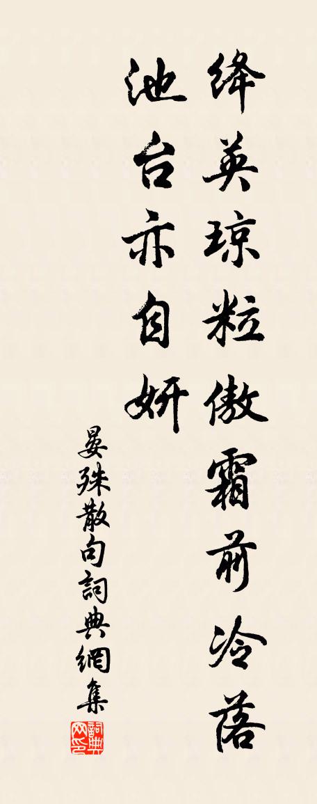 詩詞名句歷史字典書法欣賞書法字典國語詞典說文解字康熙字典古漢語字典標 題 作 者 詩 句 句作者:晏殊 朝代:宋代句原文絳英瓊粒傲霜前,冷落池台亦自妍。詩詞問答問:句的作者是誰?答:晏殊問:句寫於哪個朝代?答:宋代問:晏殊的名句有哪些?答:晏殊名句大全晏殊句書法欣賞句書法作品詩詞推薦總題葛紹體〔宋代〕塘曲椒和桑共老,山頭松與麥齊青。人家歲計村南北,似識豳風舊典刑。知宗柑詩用韻頗險予既知之復取所未用之韻續林景熙〔宋代〕書閱揚州貢,功觀禹化覃。香包分橘柚,秋色動江潭。破暑花凝雪,凌寒葉染藍。金衣愛日照。珠實碧波涵。未止餞唐州高使君赴任崔湜〔唐代〕芳春桃李時,京都物華好。為岳豈不貴,所悲涉遠道。遠道不可思,宿昔夢見之。贈君雙佩刀,日夕視來期。頌古十八首釋寶印〔宋代〕不疑不徹不失,片片春風狼籍。至今江北江南,遊子徒勞外覓。休外覓,明如杲日黑如漆。寄陳用賓林景熙〔宋代〕水竹翛翛稱客居,有時挾筴自觀魚。為儒老入他州籍,懷古幽探異穴書。日暮碧雲歸已晚,歲寒青桂看如初。文章又絕句司馬光〔宋代〕舉首孤輪不似遙,樽前狂氣出雲霄。常娥不惜惜丹桂,欲就高枝掛酒瓢。哭吳卿明輔二首劉克莊〔宋代〕水心文印雖傳嫡,青出於藍自一家。尚意祥麟來泰疇,安知怪鵬集長沙。忤因宮妾頭無發,去為將軍手污靴。他日留題方乾處士舊居范仲淹〔宋代〕風雅先生舊隱存,子陵台下白雲村。唐朝三百年冠蓋,誰聚詩書到遠孫。山中夜宿顧況〔唐代〕涼月掛層峰,蘿林落葉重。掩關深畏虎,風起撼長松。重午於潛道中吳錫疇〔宋代〕逢人篸艾知重午,漫把青錢問酒杯。豈是醉狂慵弔古,獨醒不禁客愁來。桃源行王維〔唐代〕漁舟逐水愛山春,兩岸桃花夾古津。坐看紅樹不知遠,行盡青溪忽值人。山口潛行始隈隩,山開曠望旋平陸。遙看暝投雲智寺渡溪不得,卻取沿江路往杜牧〔唐代〕雙岩瀉一川,回馬斷橋前。古廟陰風地,寒鍾暮雨天。沙虛留虎跡,水滑帶龍涎。卻下臨江路,潮深無渡船。霜橘張鎡〔宋代〕半霜黃綠尚斕斑,笑指清芬數日間。會得此中堪樂意,洞庭端合傲商山。贈雪林李和甫周弼〔宋代〕忽地相逢便解顏,況兼終日看青山。精神摘柳喔詩際,標度尋梅集句間。春淡野橋孤艇遠,暮寒溪寺一鍾閒。匆匆春別詩四首·其四蕭子顯〔南北朝〕銜悲攬涕別心知,桃花李花任風吹。本知人心不似樹,何意人別似花離。故人趙昌甫久不相聞寄三詩皆傑作也輒以長句陸游〔宋代〕海內文章有阿昌,數能著句寄龜堂。就令覿面成三倒,未若冥心付兩忘。道義極知當負荷,風波那得易禁當。相思杜字蘇泂〔宋代〕望帝城中住,春宵血沁花。何鄉真萬里,還憶夢中家。公居王周〔唐代〕公居門館靜,旅寄萬州城。山共秋煙紫,霜並夜月清。無愁乾酒律,有句入詩評。何必須林下,方馳吏隱名。上行杯韋莊〔唐代〕芳草灞陵春岸,柳煙深,滿樓弦管,一曲離聲腸寸斷。今日送君千萬,紅鏤玉盤金鏤盞。須勸,珍重意,莫辭滿。汪氏別野次韻張祁〔宋代〕蕪湖還似鑑湖春,我亦歸來賀季真。好賦俱陪招隱士,耦耕長似問津人。襟懷處處尊前好,花柳番番雨後新。誰道名句推薦春風爾來為阿誰,蝴蝶忽然滿芳草。李白《山人勸酒》 升沉應已定,不必問君平。李白《送友人入蜀》 少壯不努力,老大徒傷悲!佚名《長歌行》 吳興才人怨春風,桃花滿陌千里紅。李賀《送沈亞之歌·並序》 凡是人,皆須愛。天同覆,地同載。李毓秀《弟子規·泛愛眾》 手弄生綃白團扇,扇手一時似玉。蘇軾《賀新郎·夏景》 蛇無頭而不行,鳥無翅而不飛。施耐庵《水滸傳·第六十回》 林深藏卻雲門寺,回首若耶溪。張可久《人月圓·會稽懷古》 莫飲卯時酒,昏昏醉到酉。佚名《增廣賢文·上集》 夫妻者,非有骨肉之恩也。愛則親,不愛則疏。韓非及後人《韓非子·備內》